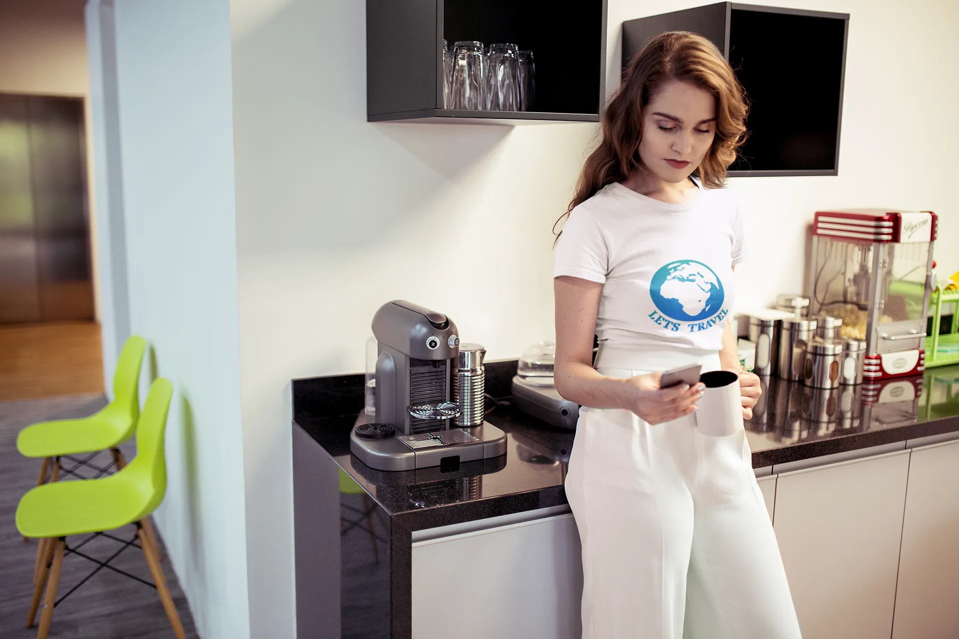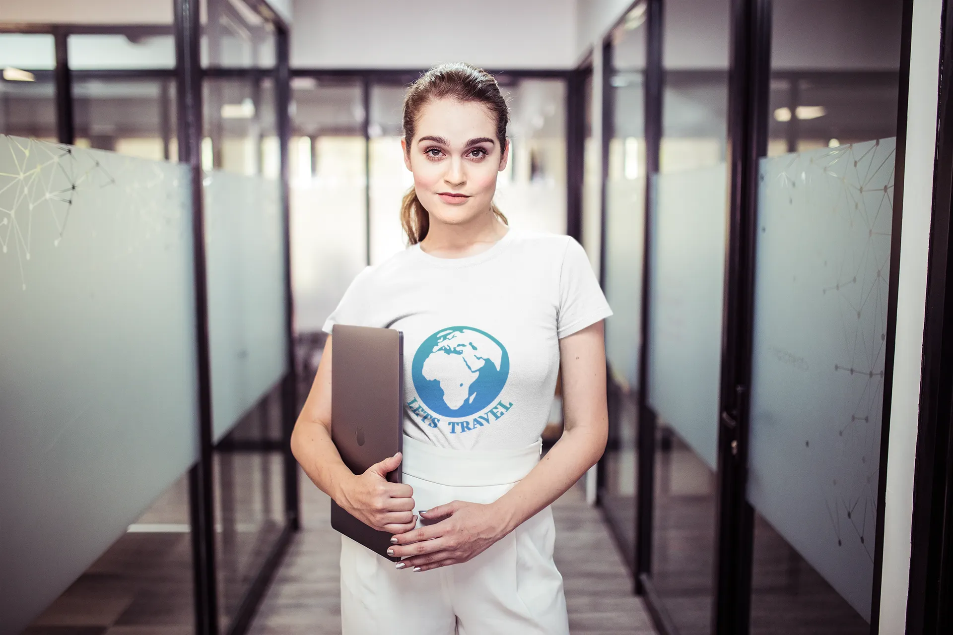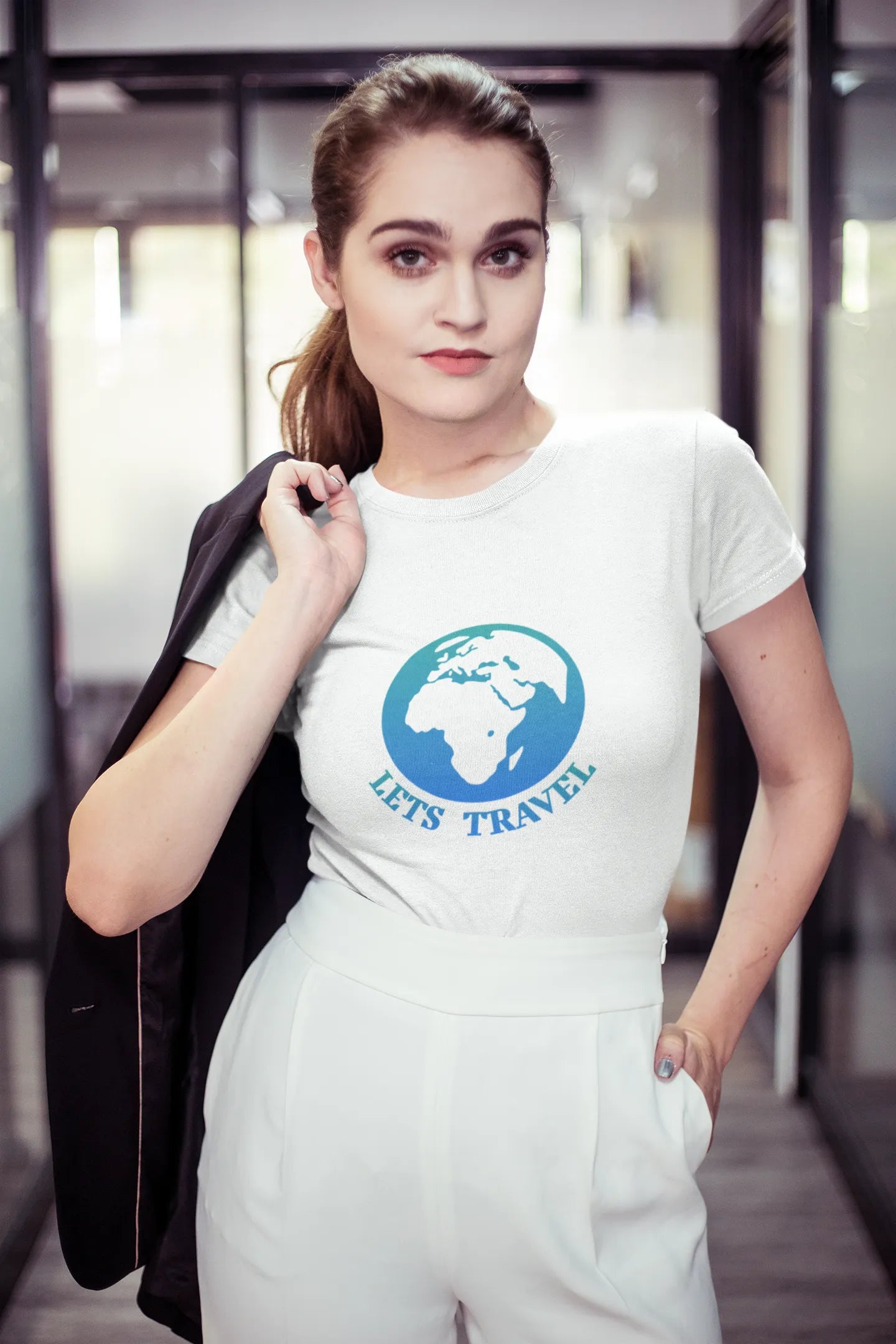 A vibrant travel-themed T-shirt design featuring a scenic landscape with mountains, a sunset, and a camper van. The phrase "Let's Travel" is in bold, stylish typography, with subtle adventure icons like a compass and airplane, inspiring wanderlust and exploration.