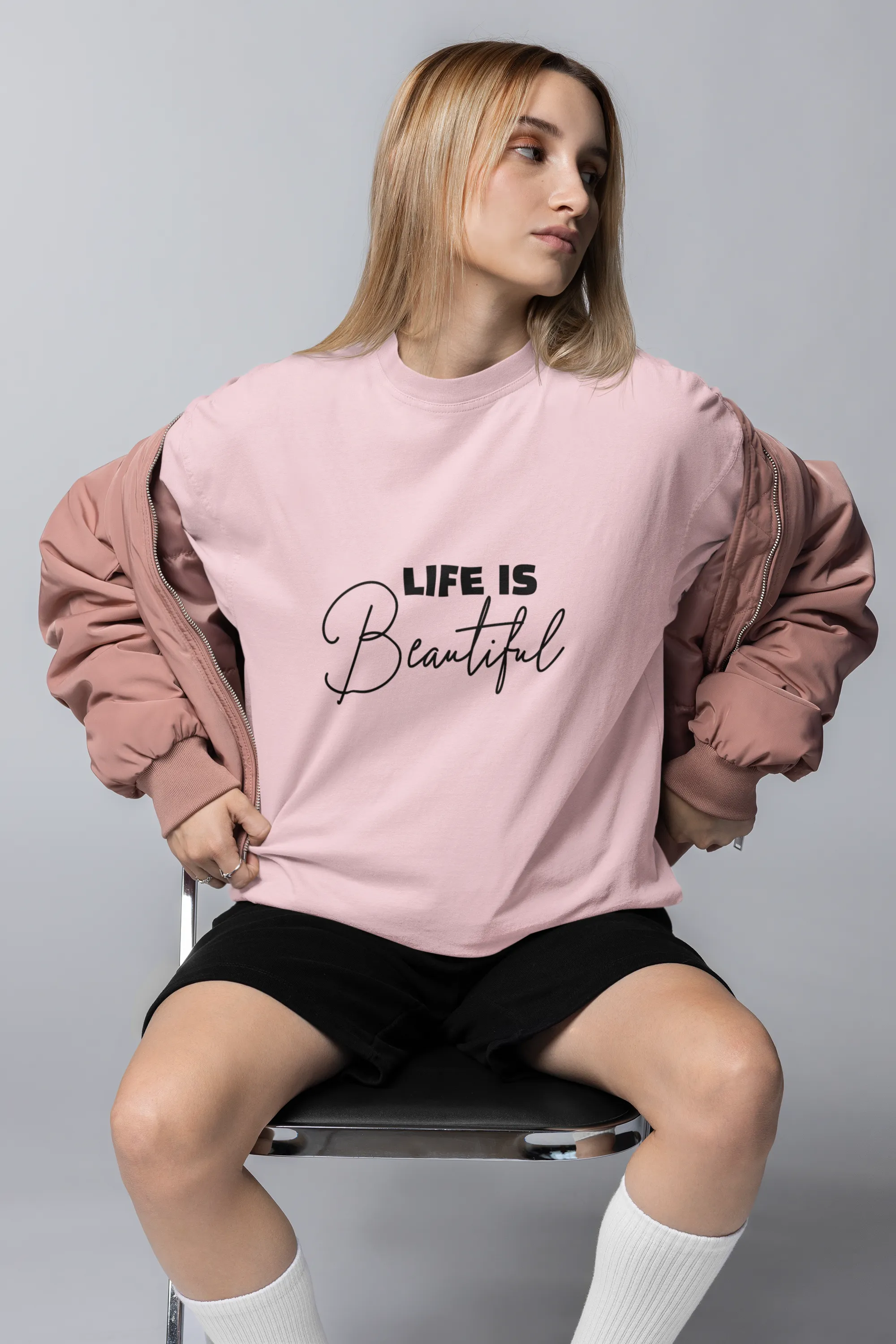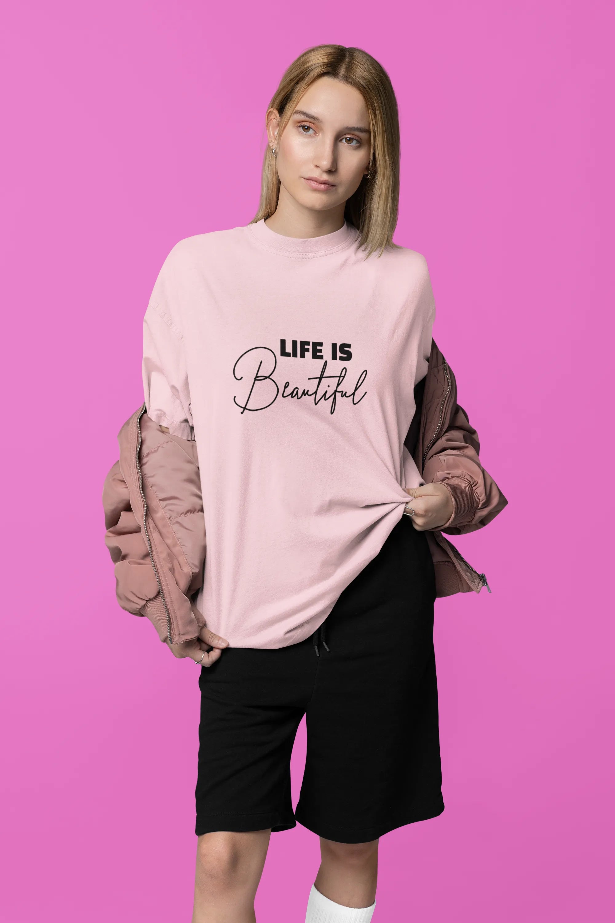 Pink long-sleeve shirt with 'Life is Beautiful' text on a light purple background