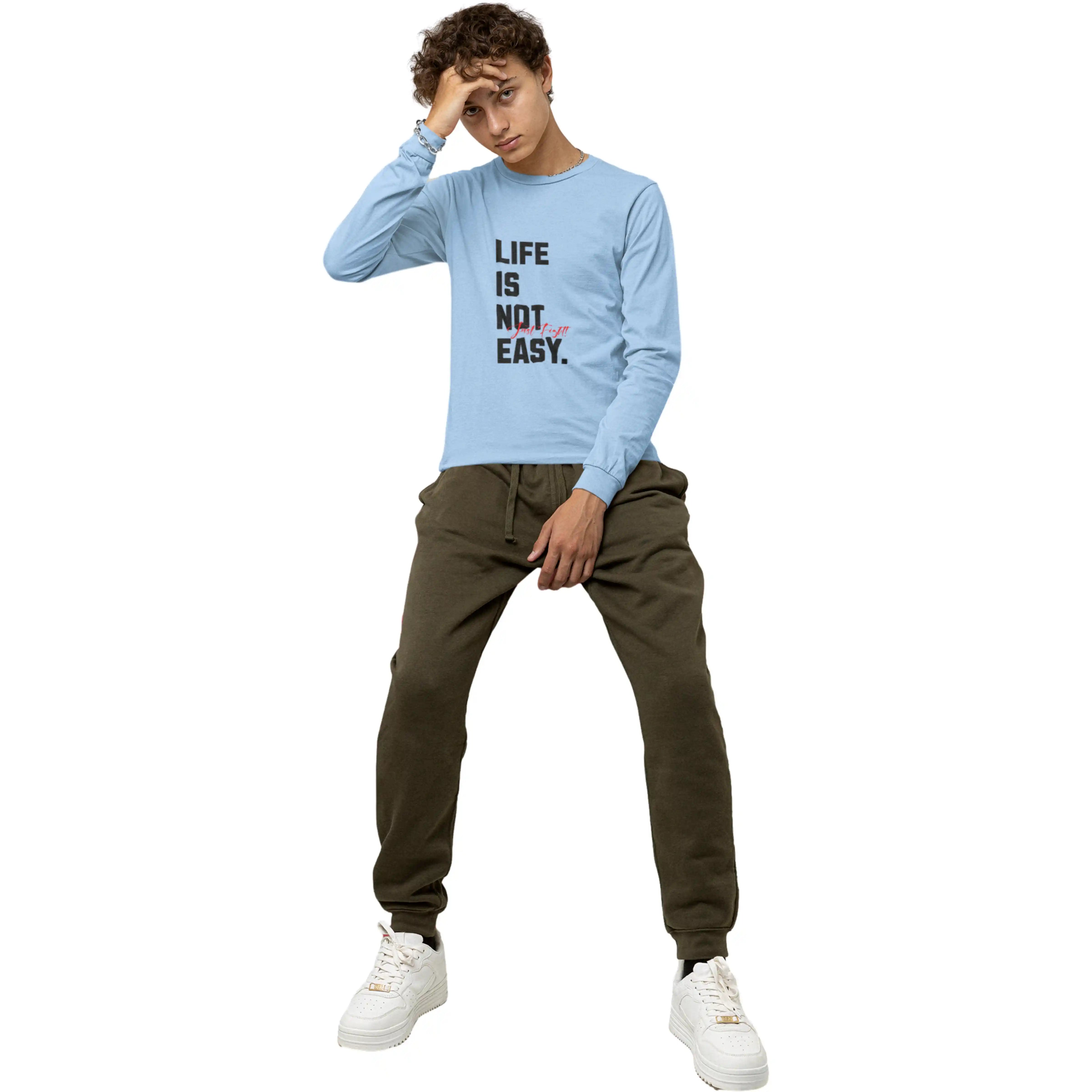 Embrace resilience with this baby blue full-sleeve T-shirt featuring the “Life Is Not Easy” quote. Crafted with a round neck and regular fit, it offers comfort, motivation, and a stylish reminder to stay strong through every challenge.