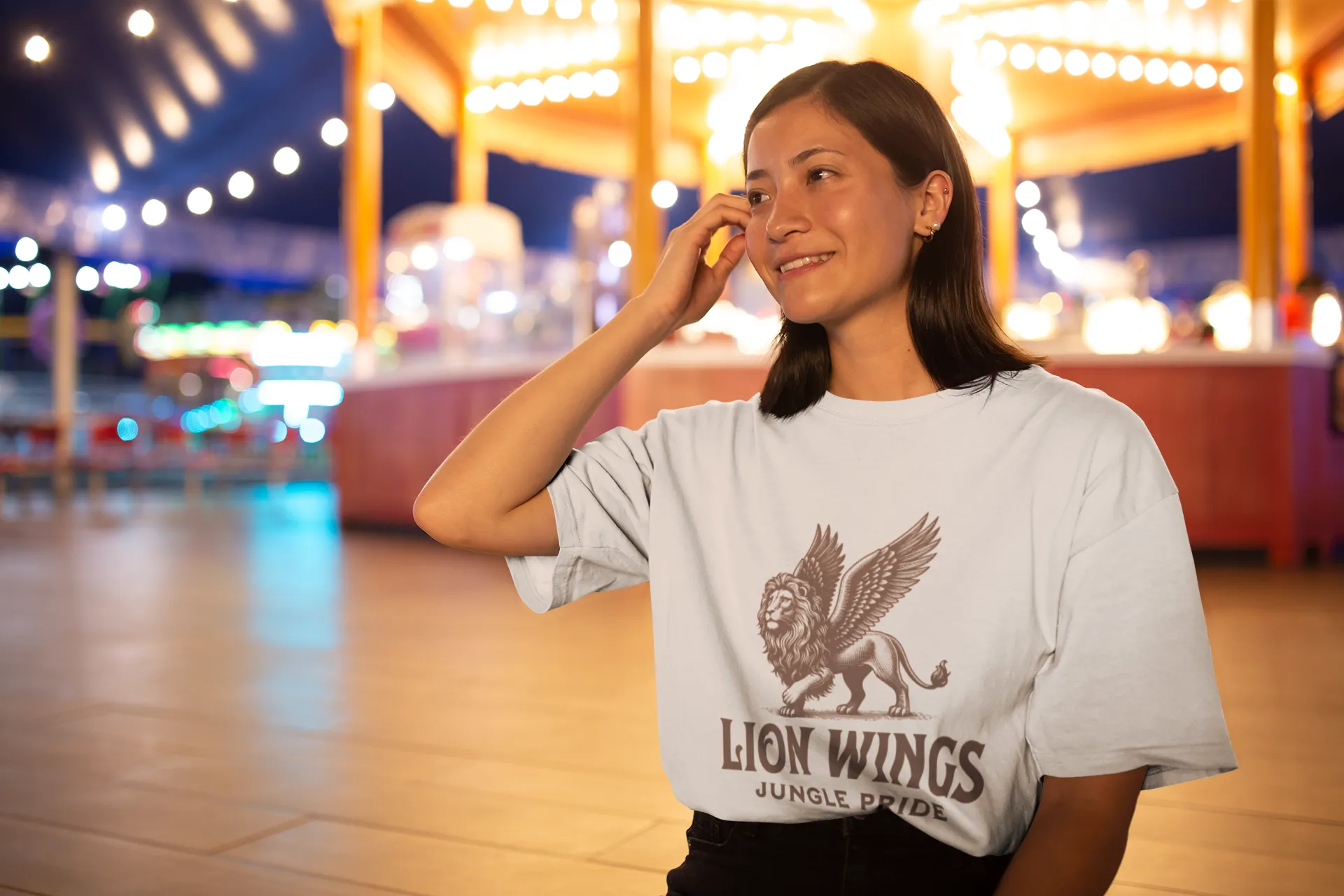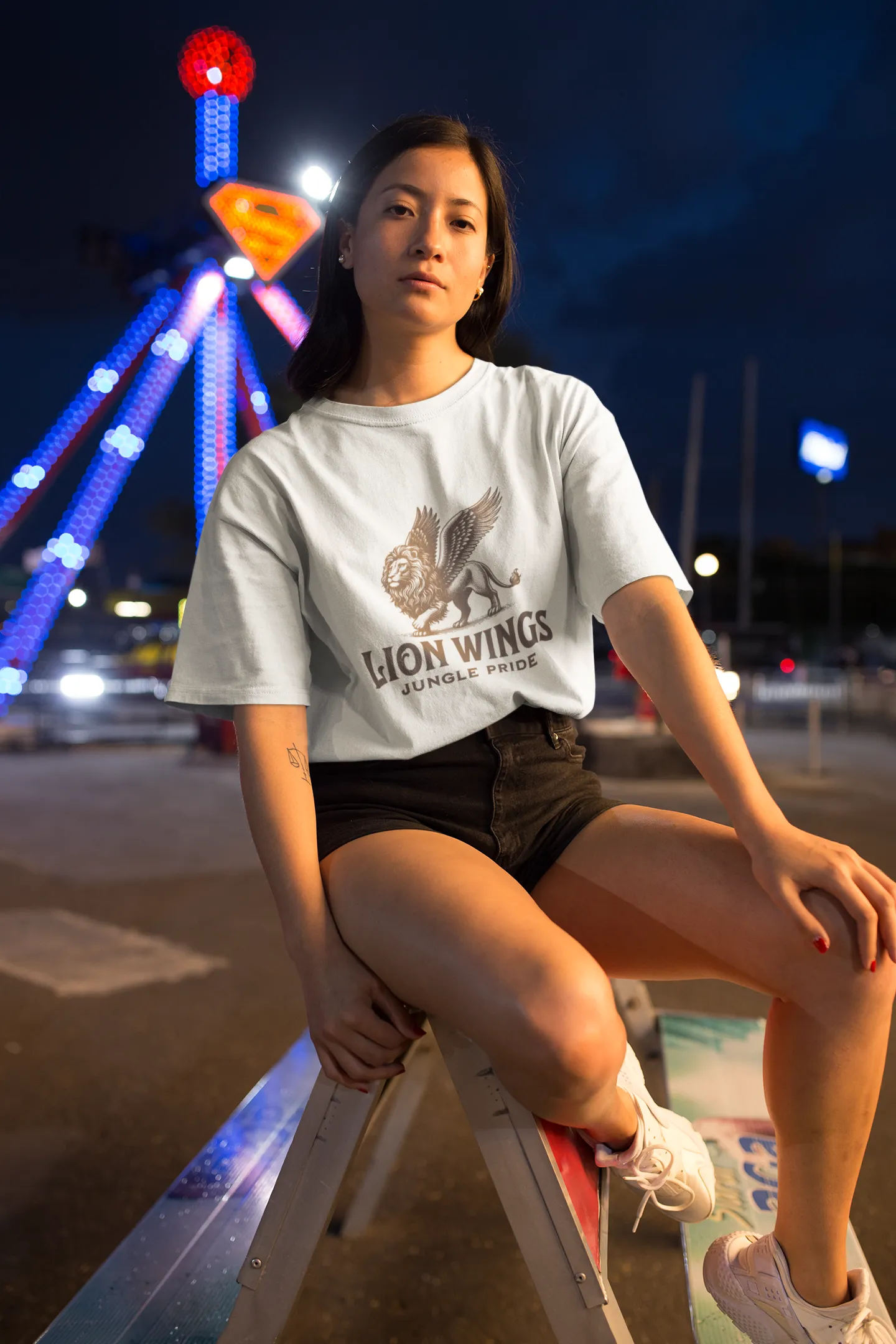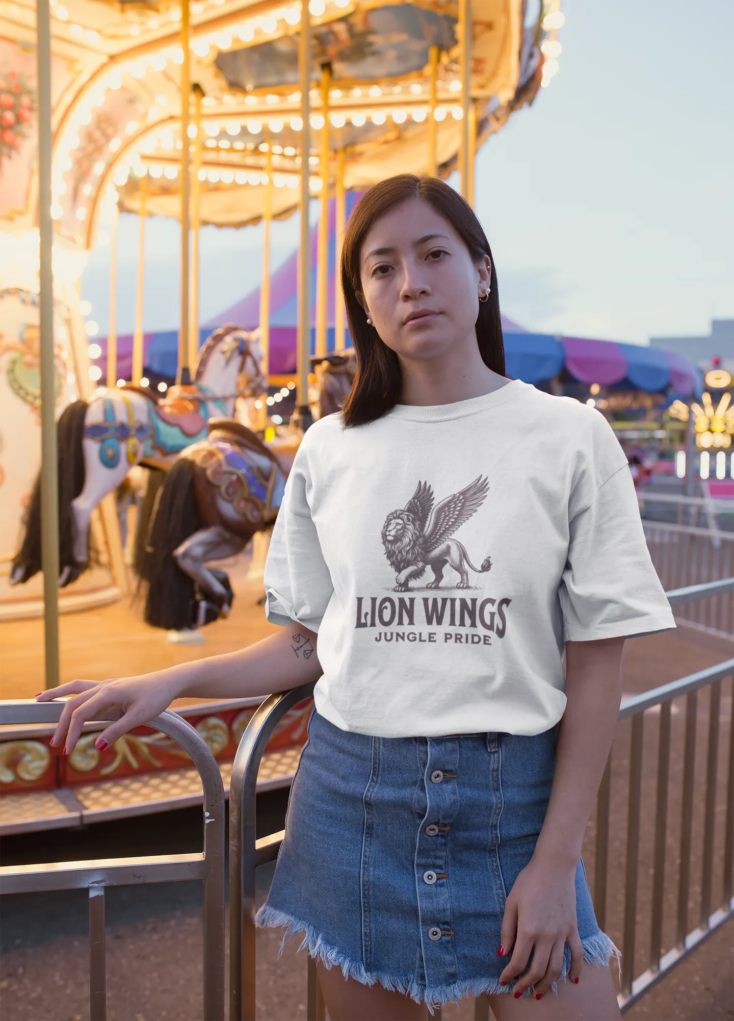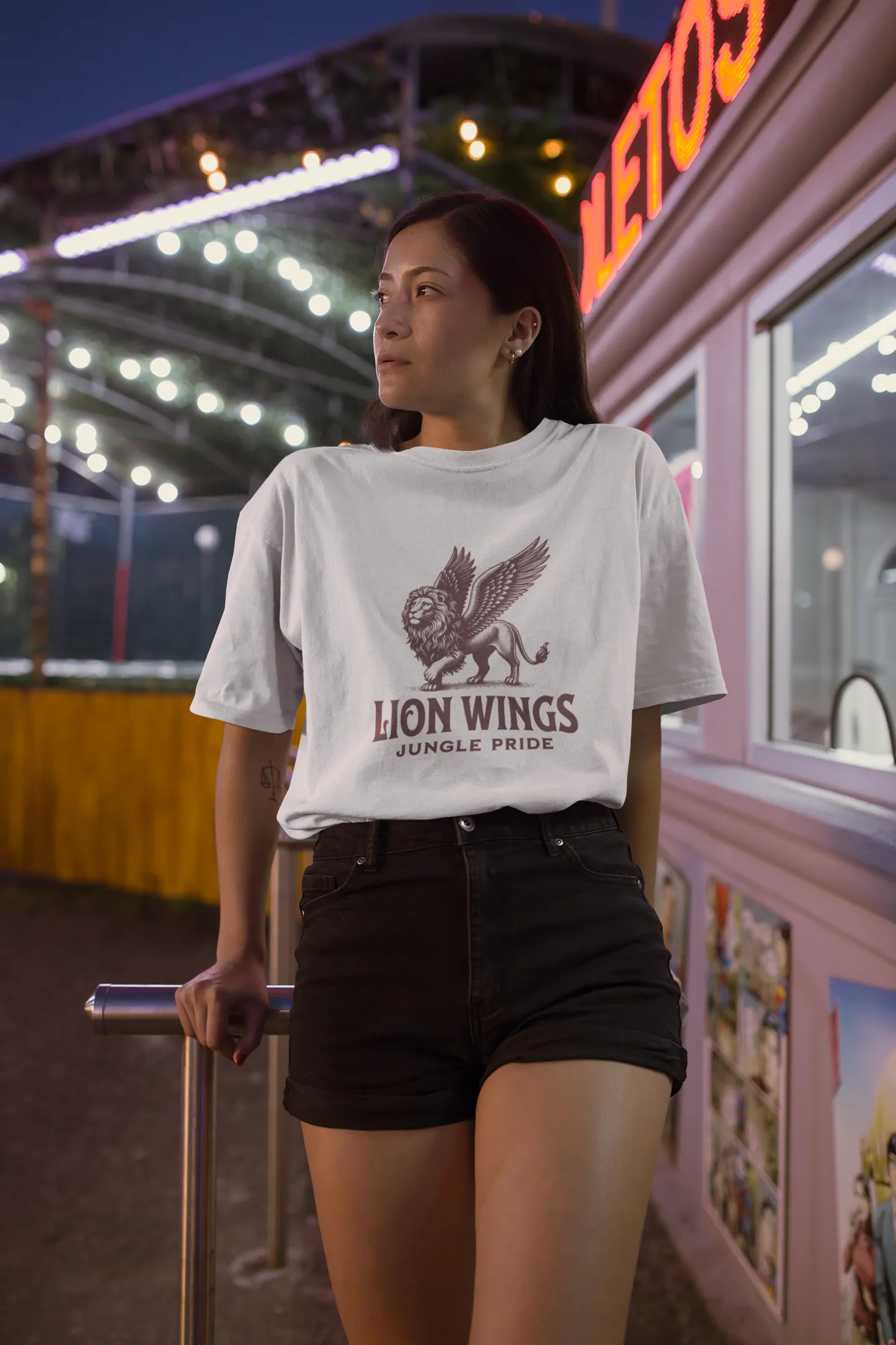 A majestic and fierce T-shirt design featuring a lion with wings, blending strength and freedom in one powerful image. With detailed linework and bold shading, it symbolizes courage, leadership, and limitless potential — perfect for those who embody bravery and ambition.