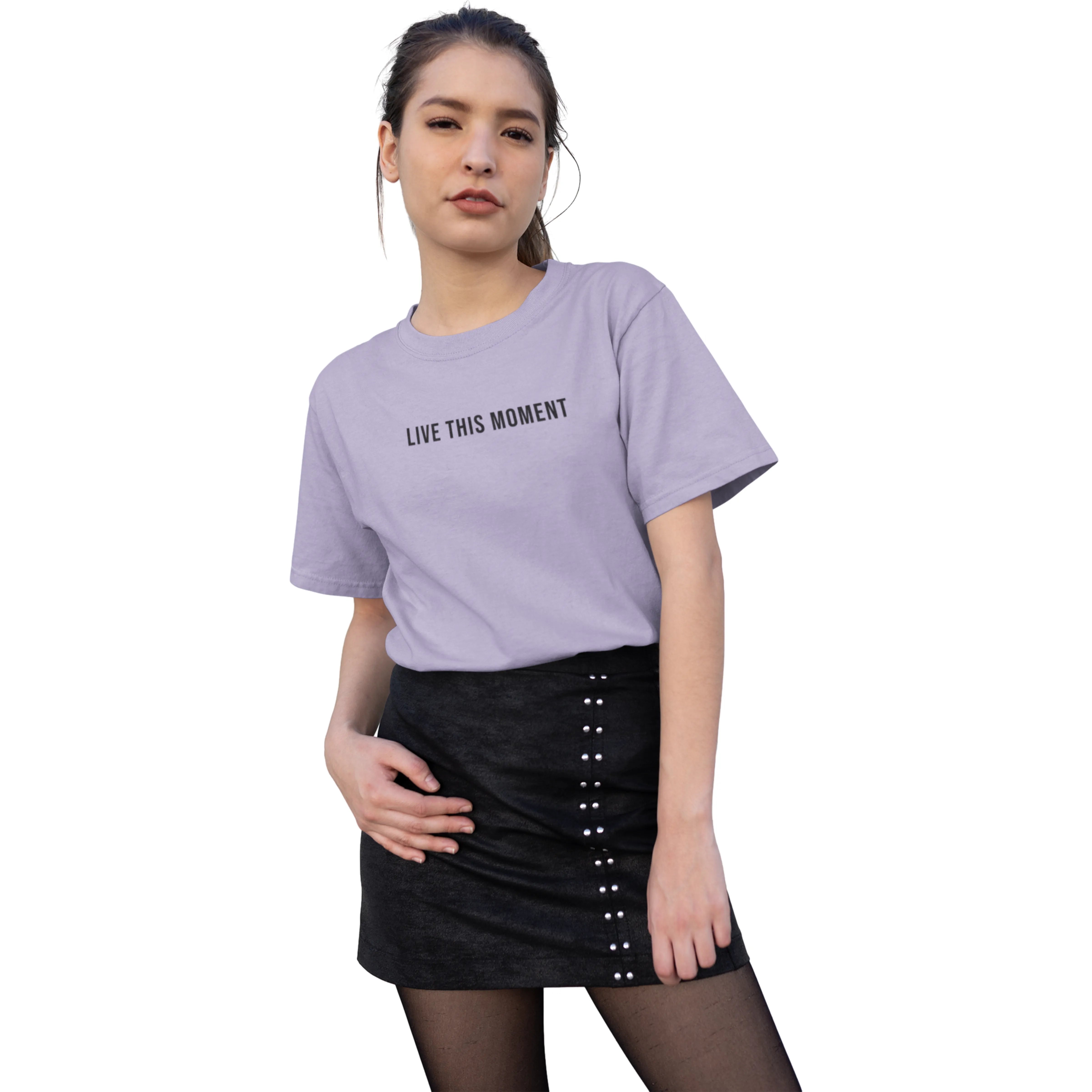 A soft lavender t-shirt featuring the quote “Live This Moment,” inspiring mindfulness and joy. Designed with a round neck and regular fit, it blends comfort and positivity—perfect for those who cherish life’s little moments with effortless style.