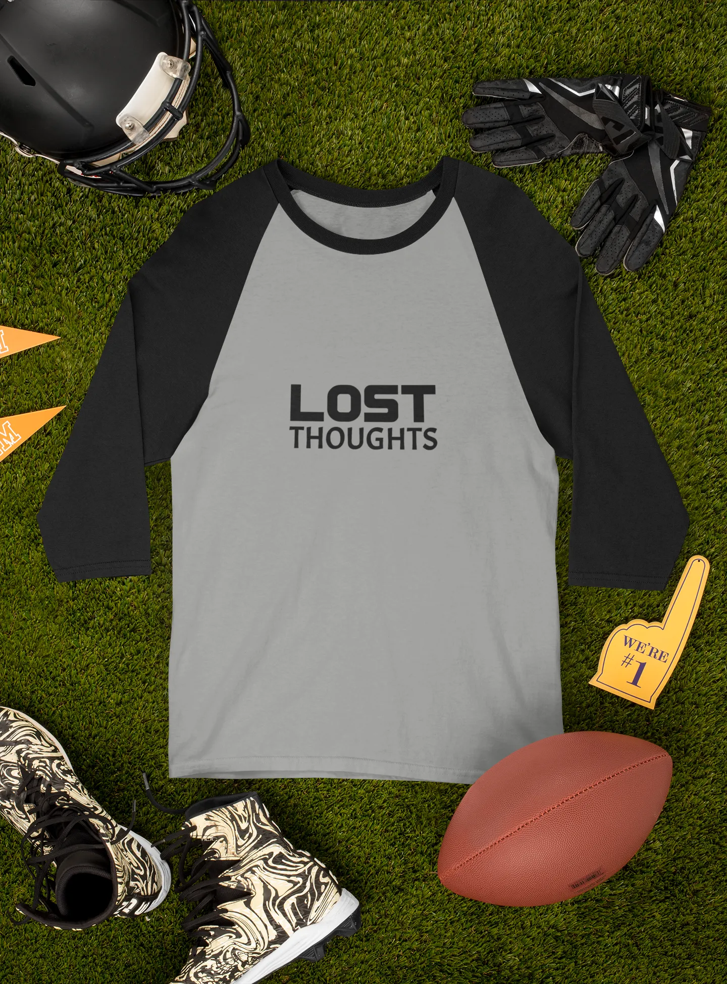Person wearing a 'Lost Thoughts' shirt against a red brick wall