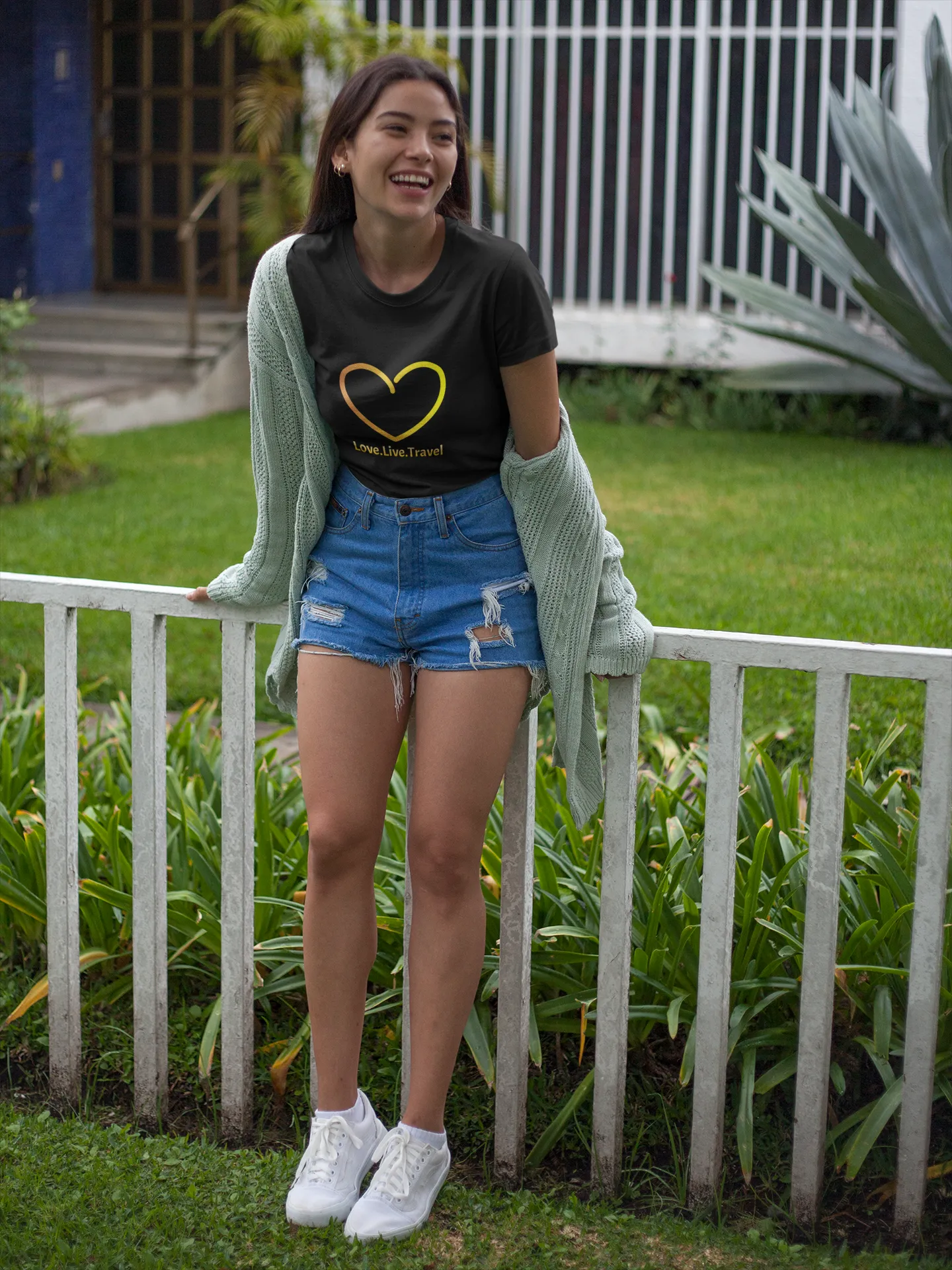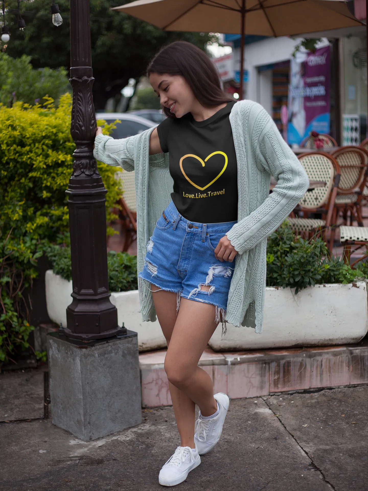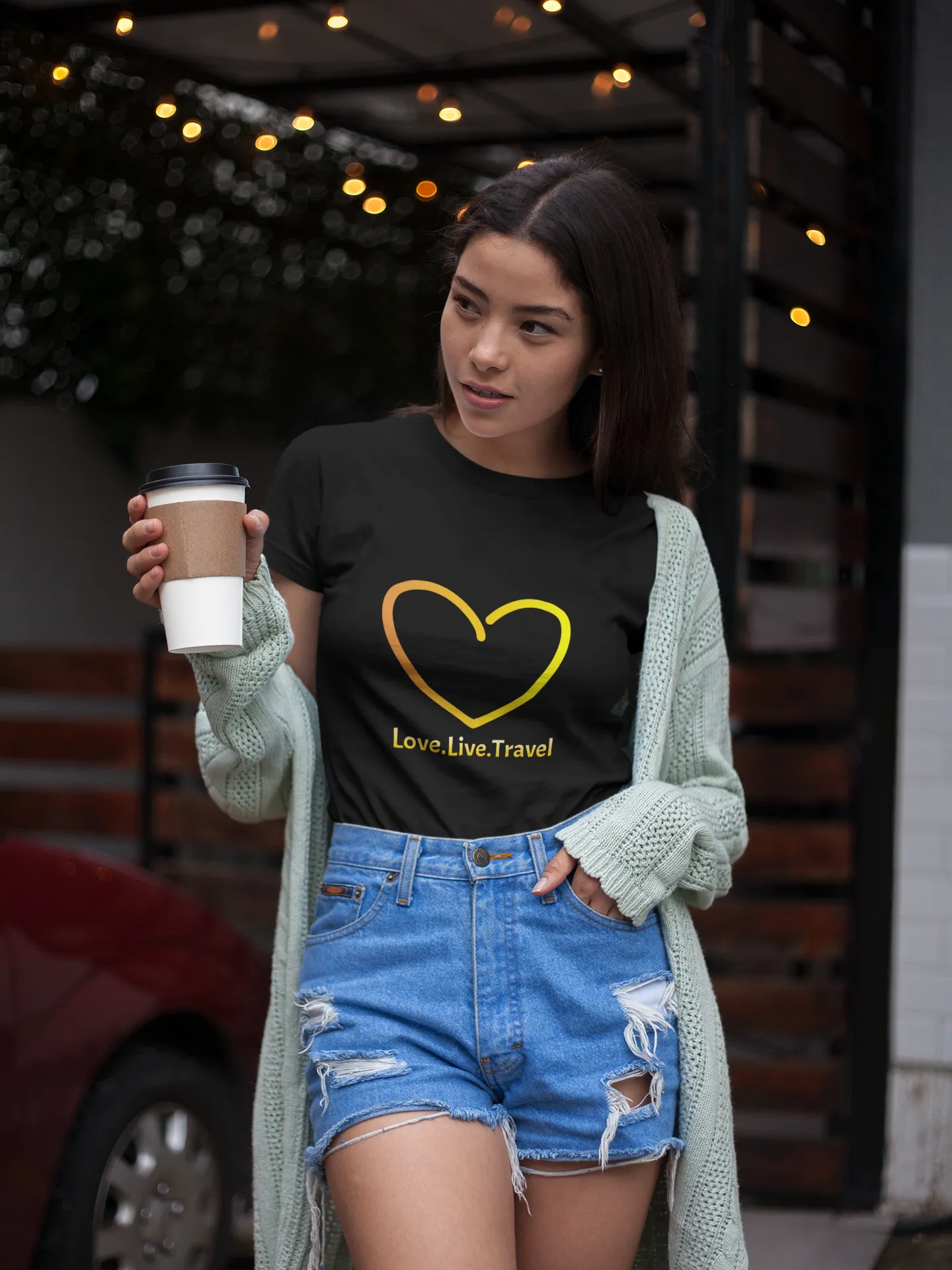 A minimal yet vibrant T-shirt design featuring "Love. Live. Travel." in bold, modern typography. Accented with a small heart, waves, and an airplane icon, symbolizing passion, adventure, and exploration. Perfect for travel enthusiasts who embrace life’s journey with love.