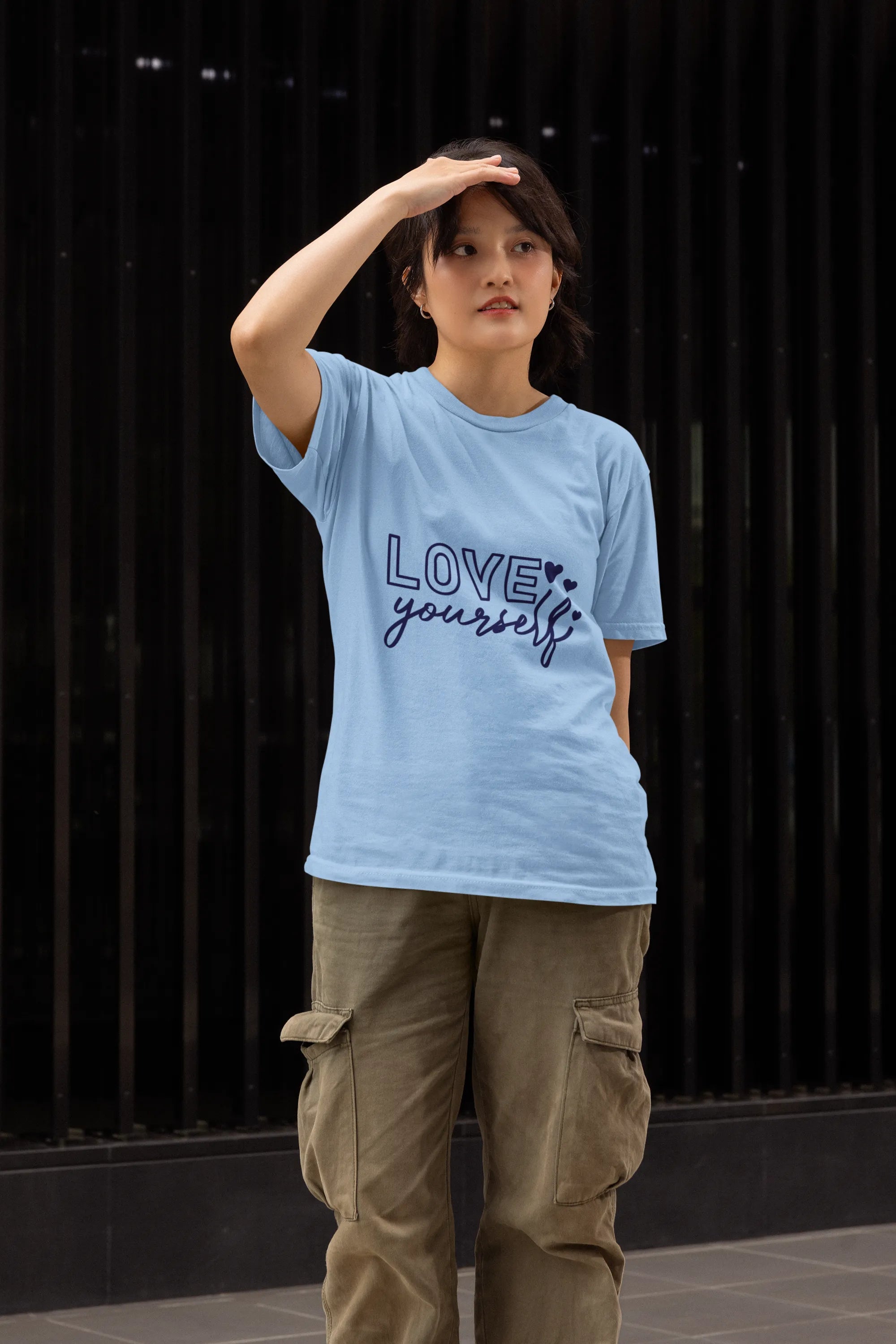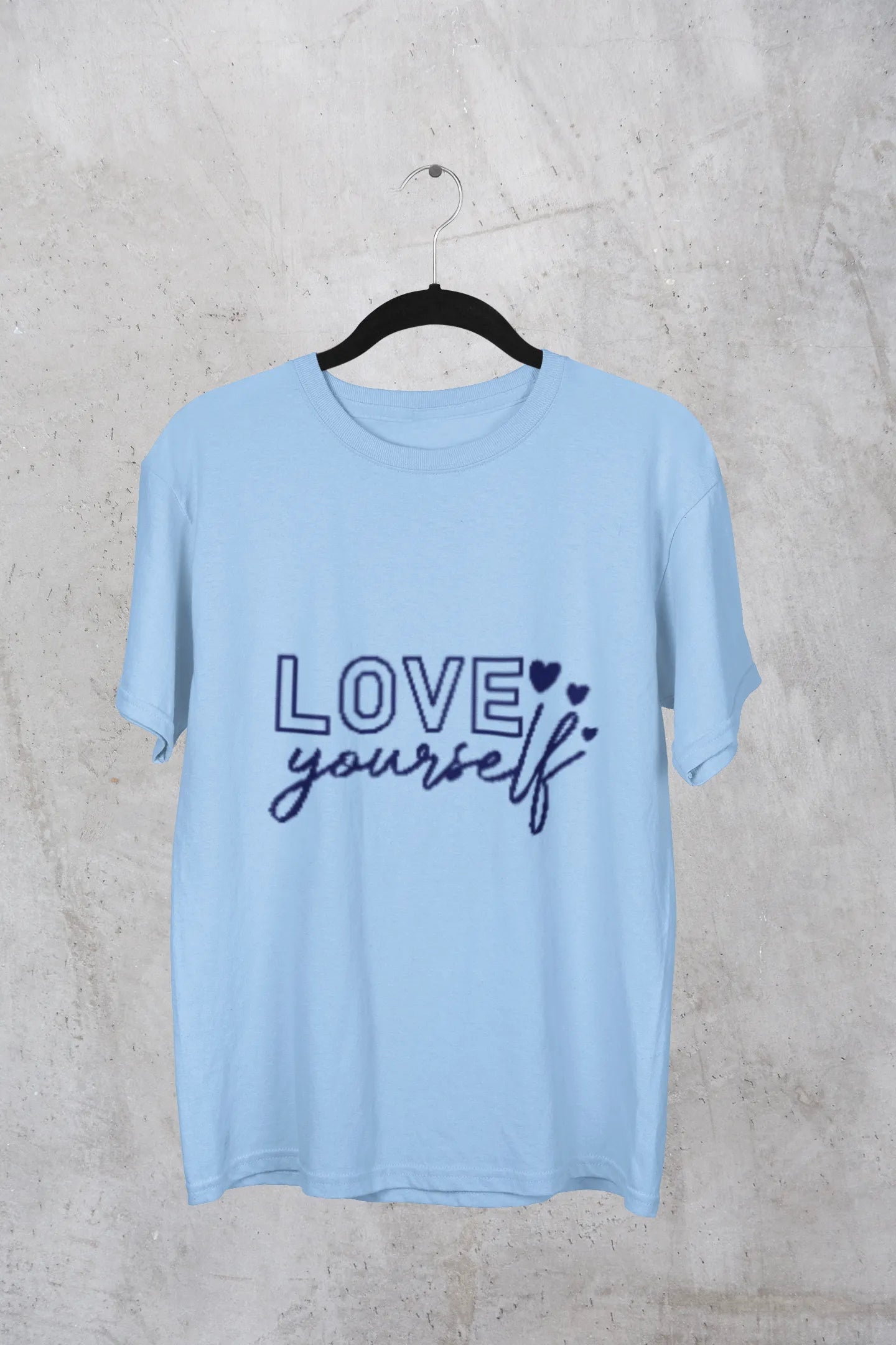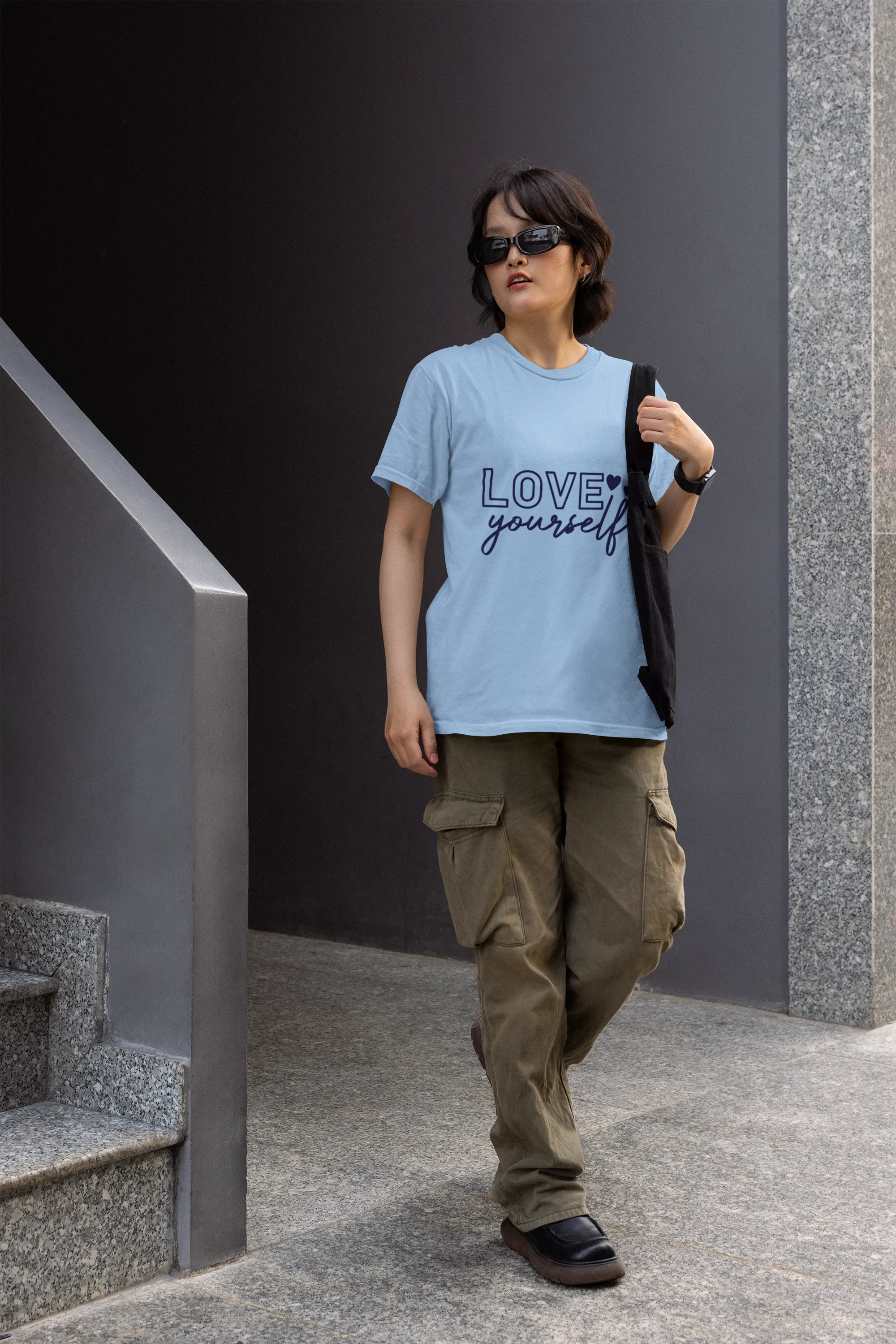 A minimalist T-shirt design featuring “Love Yourself” in elegant, cursive typography. A subtle heart or floral accent enhances the message. Soft pastel tones or bold monochrome keep it stylish. Perfect for self-love advocates, spreading positivity with every wear.