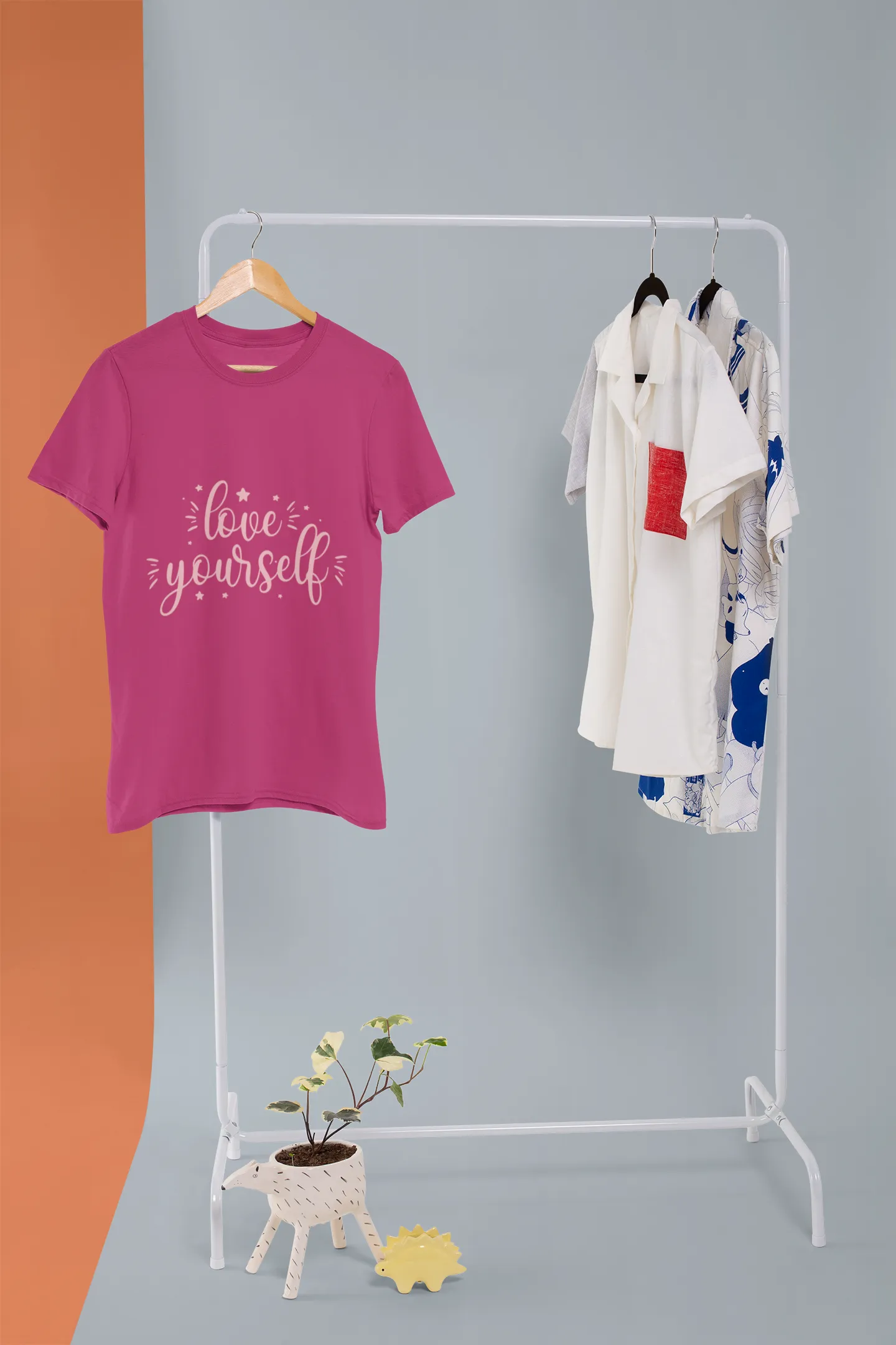 A minimal yet impactful T-shirt design featuring "Love Yourself" in elegant, hand-lettered script. Soft pastel hues or bold contrasts enhance the message, with a subtle heart or floral accents. Perfect for spreading positivity, self-care, and confidence in style.