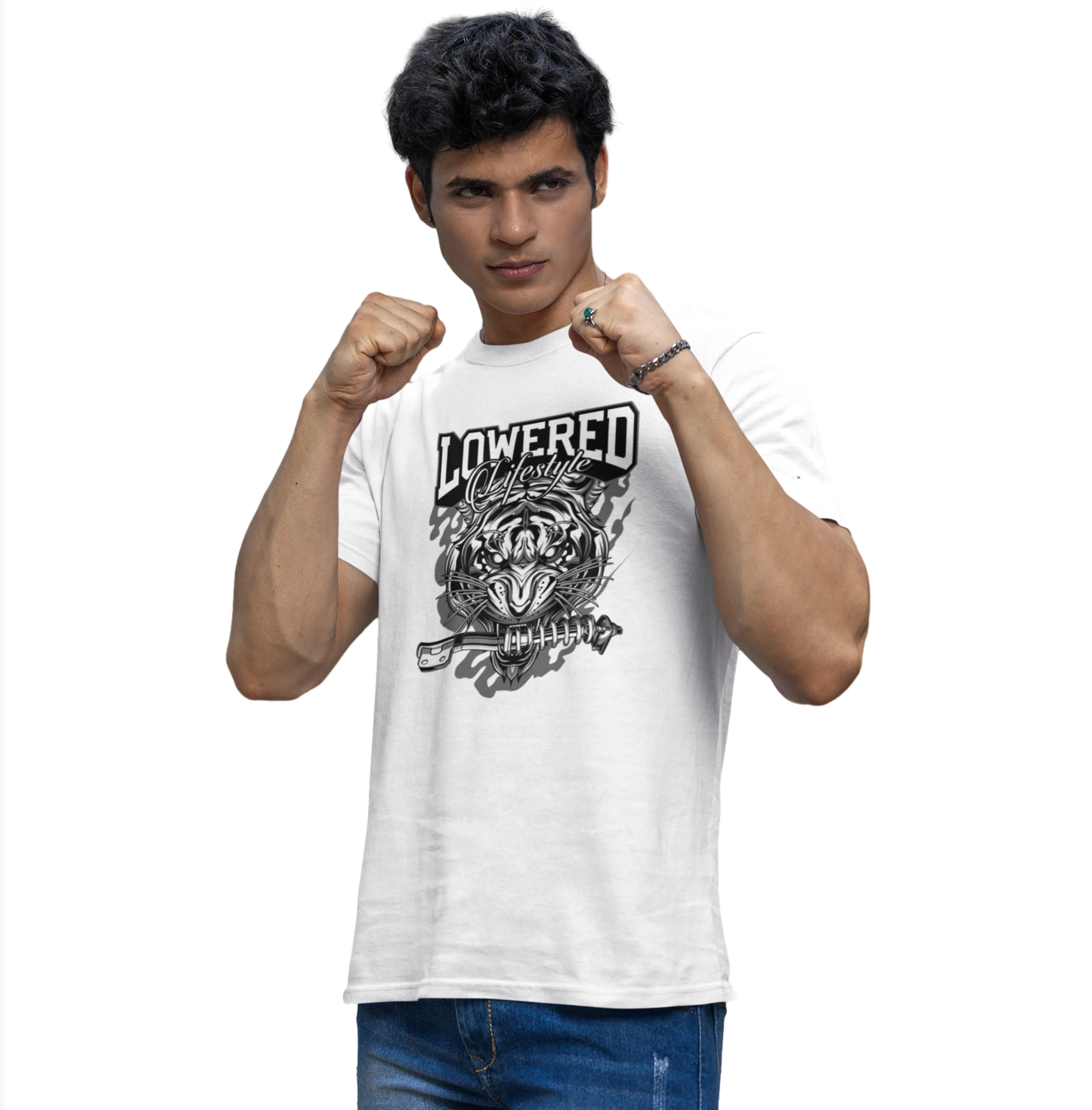 Man wearing a white t-shirt with graphic design and text on a white background