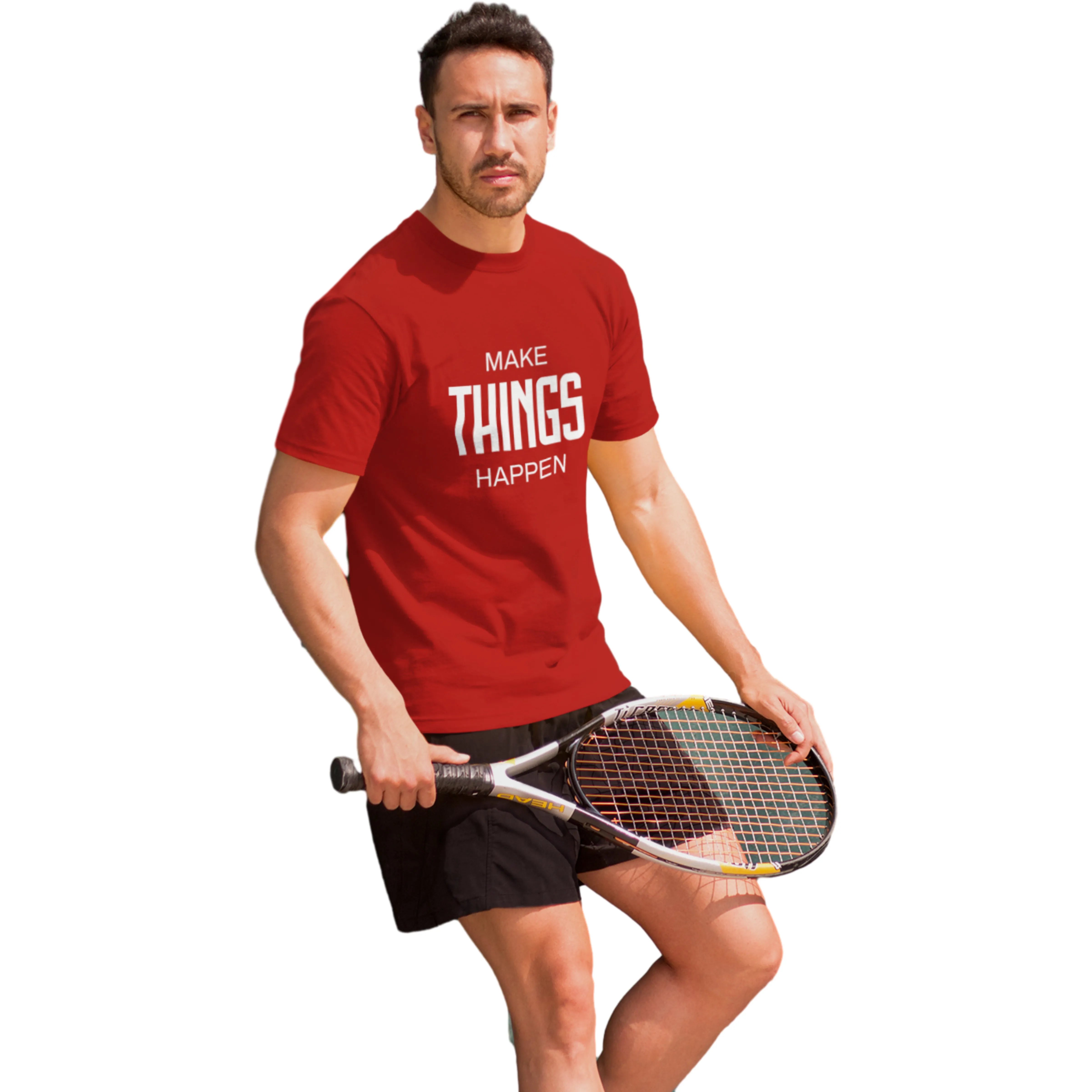 Man wearing a red t-shirt with 'MAKE THINGS HAPPEN' text on a white background