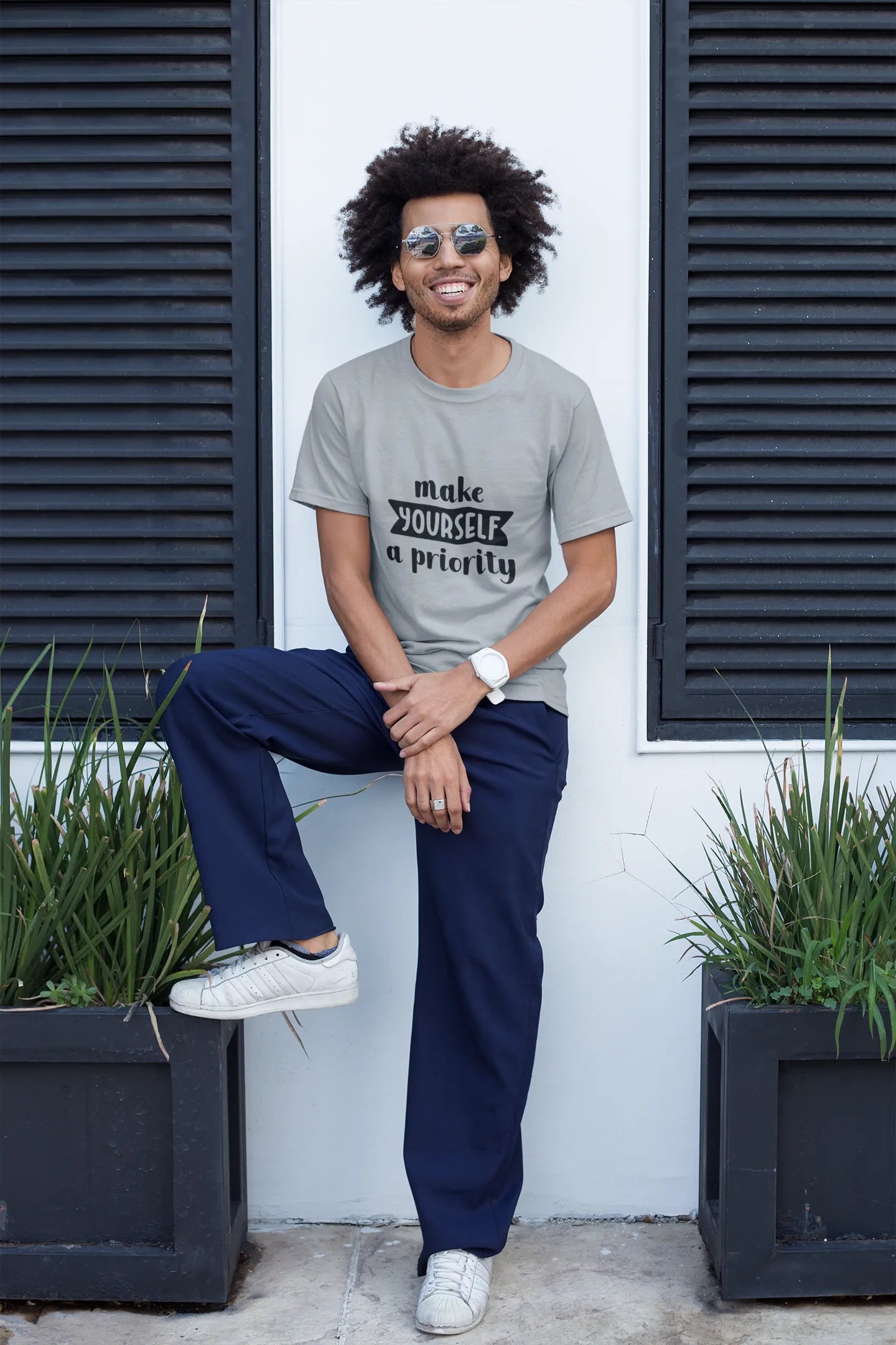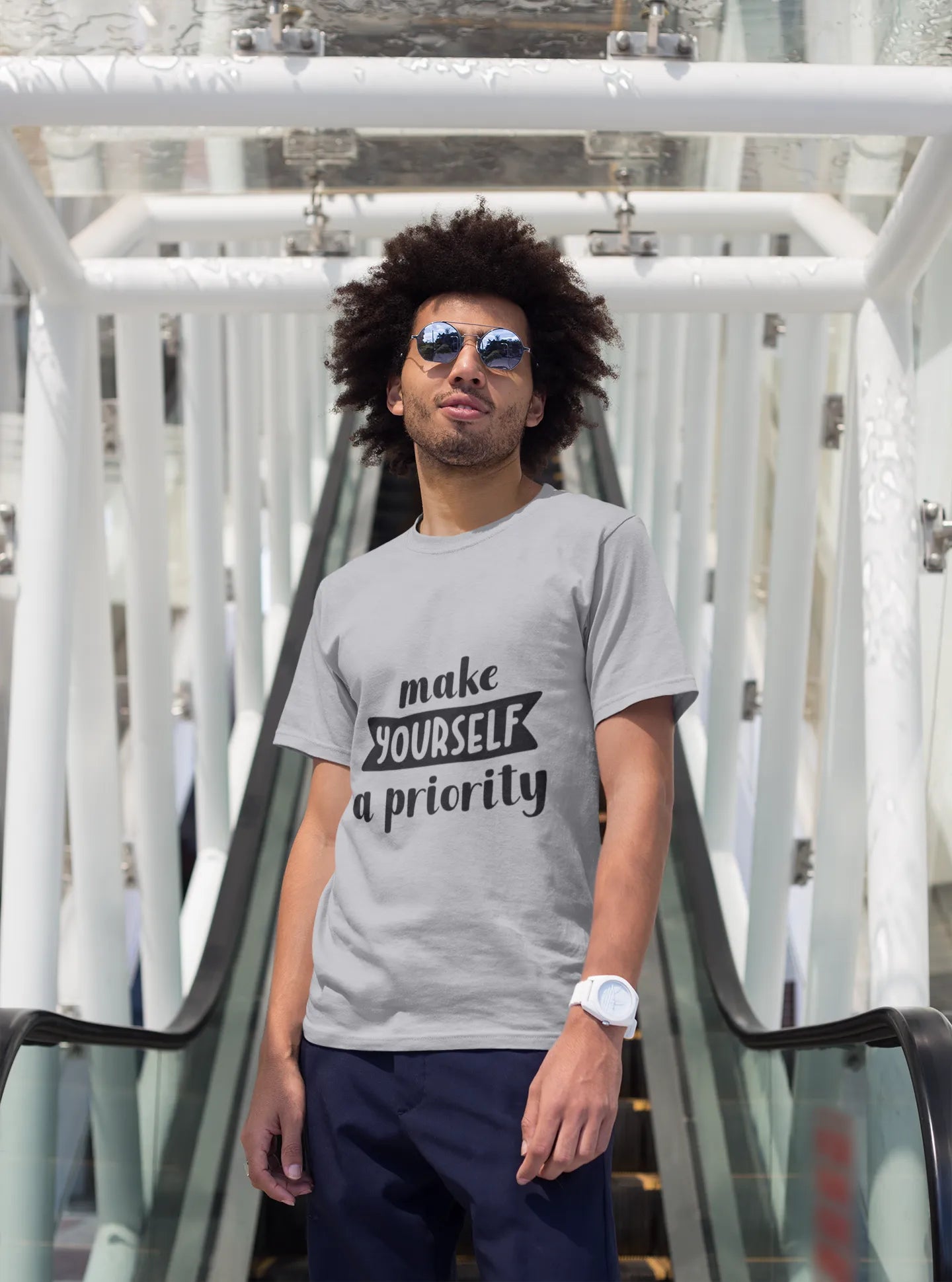 A minimalist T-shirt design featuring the phrase "Make Yourself a Priority" in bold, elegant typography. Subtle self-care elements like a heart, lotus, or sunrise add positivity. Soft, neutral colors or pastels enhance the calming, empowering message for everyday inspiration.