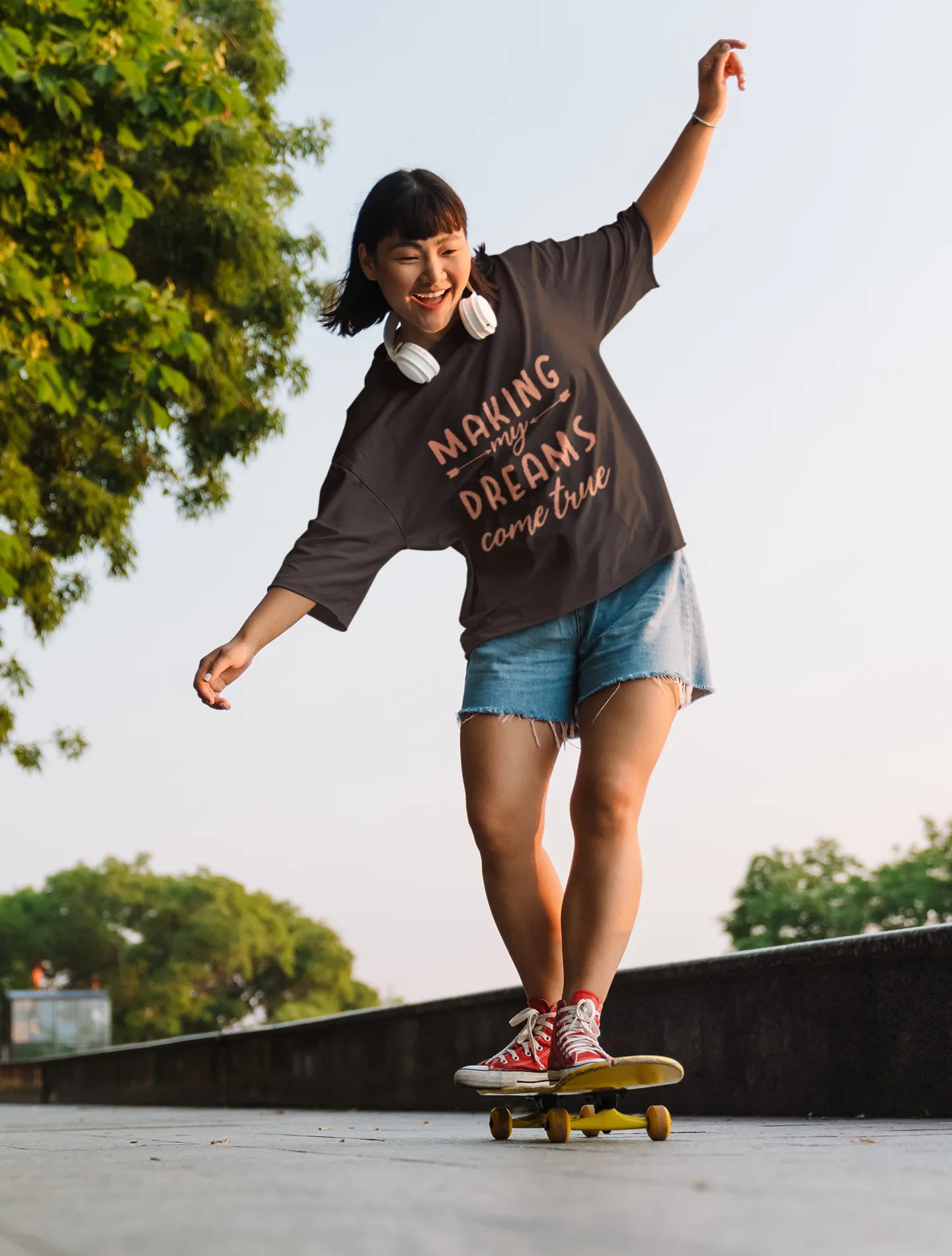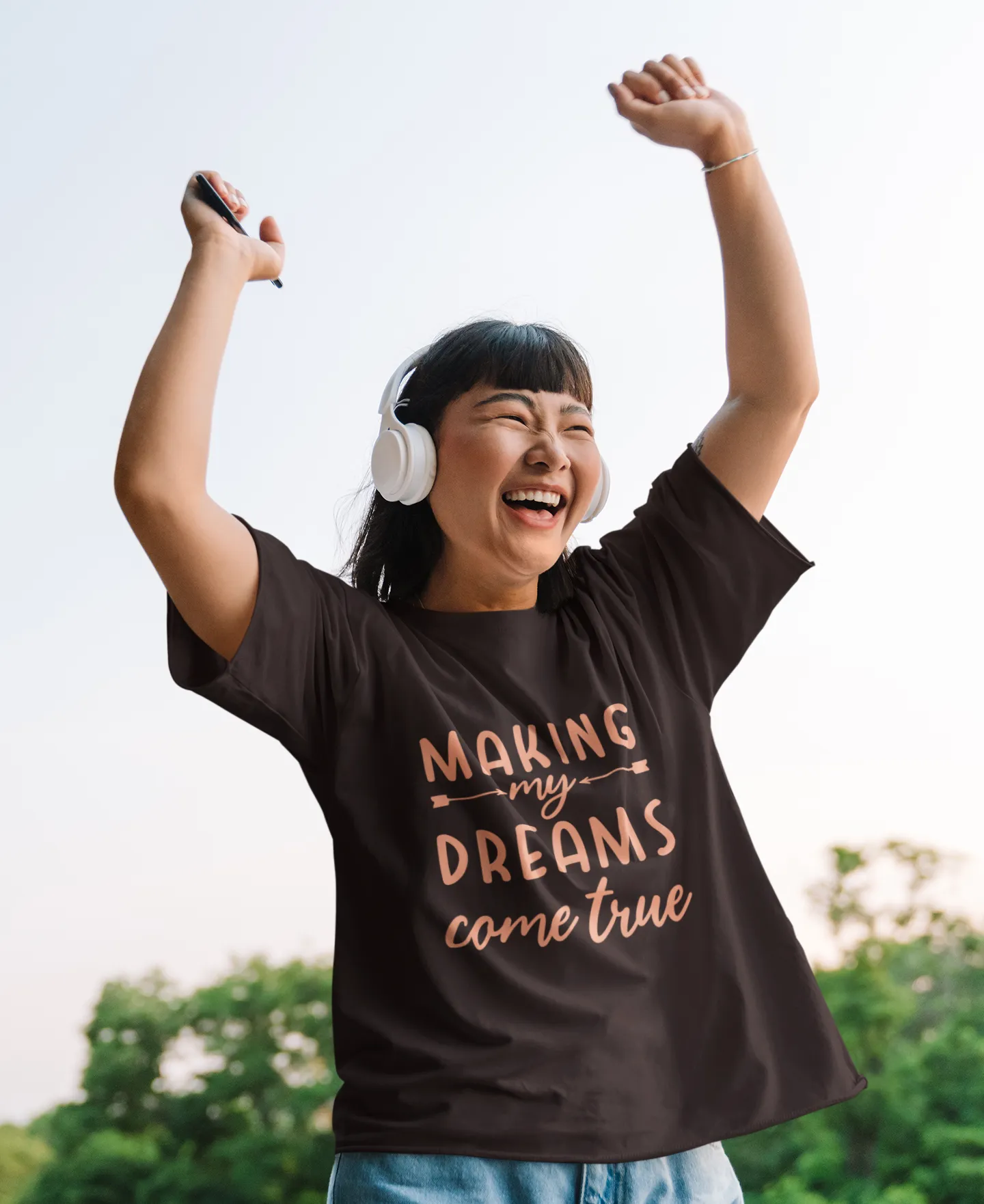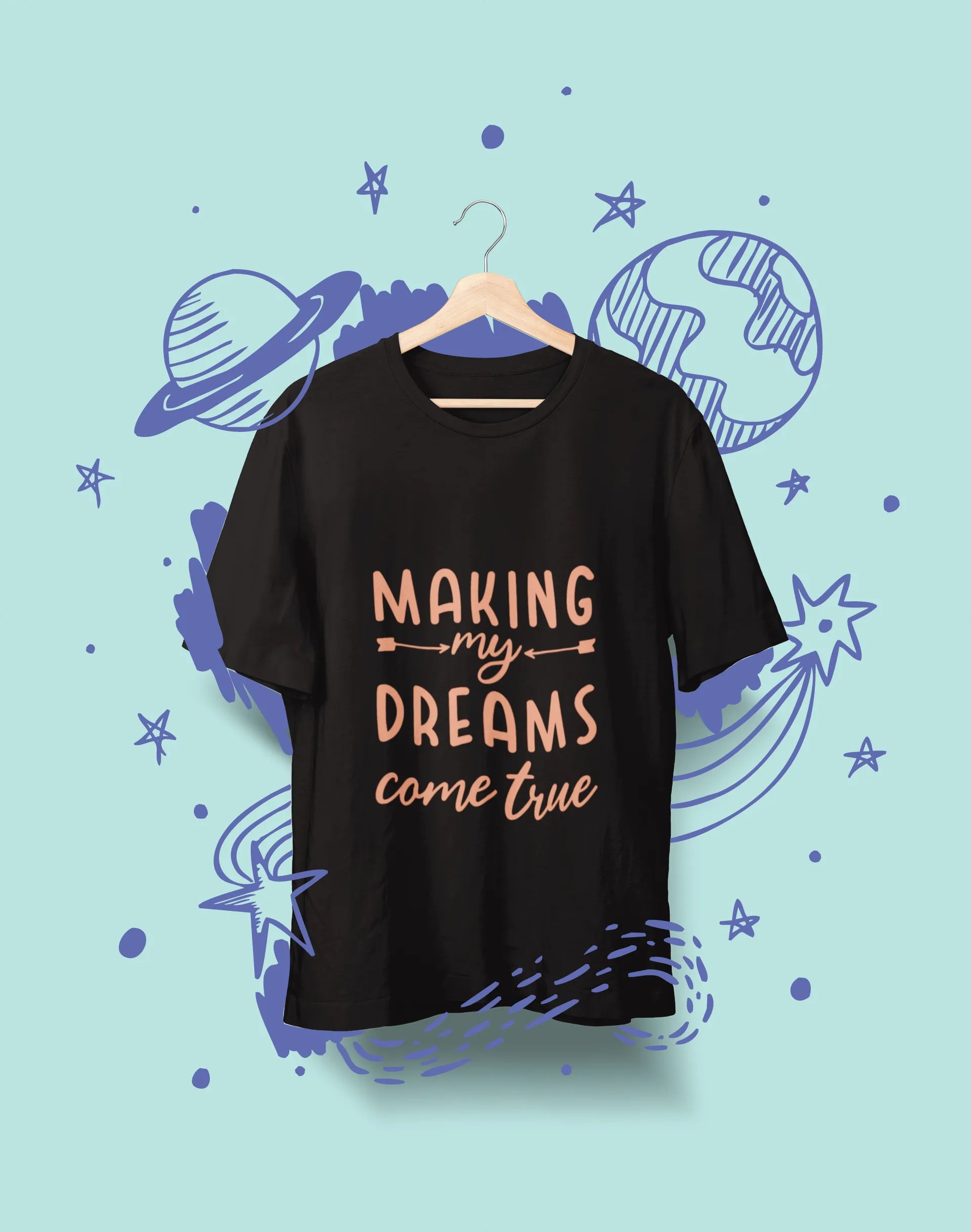 A stylish T-shirt design featuring the phrase "Making My Dreams Come True" in bold, artistic typography. Accented with dreamy clouds, stars, and a rising sun, symbolizing ambition and success. Perfect for dreamers, achievers, and anyone chasing their goals!