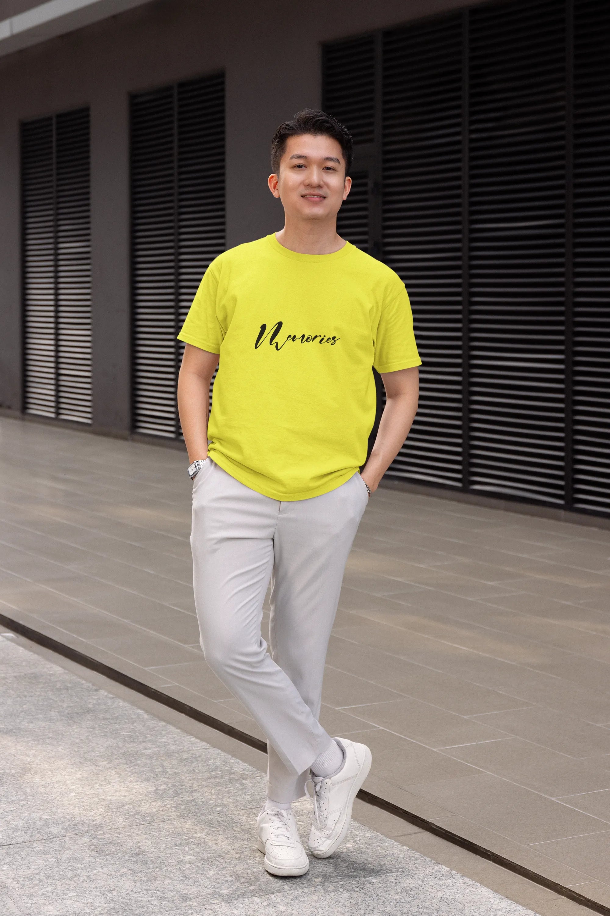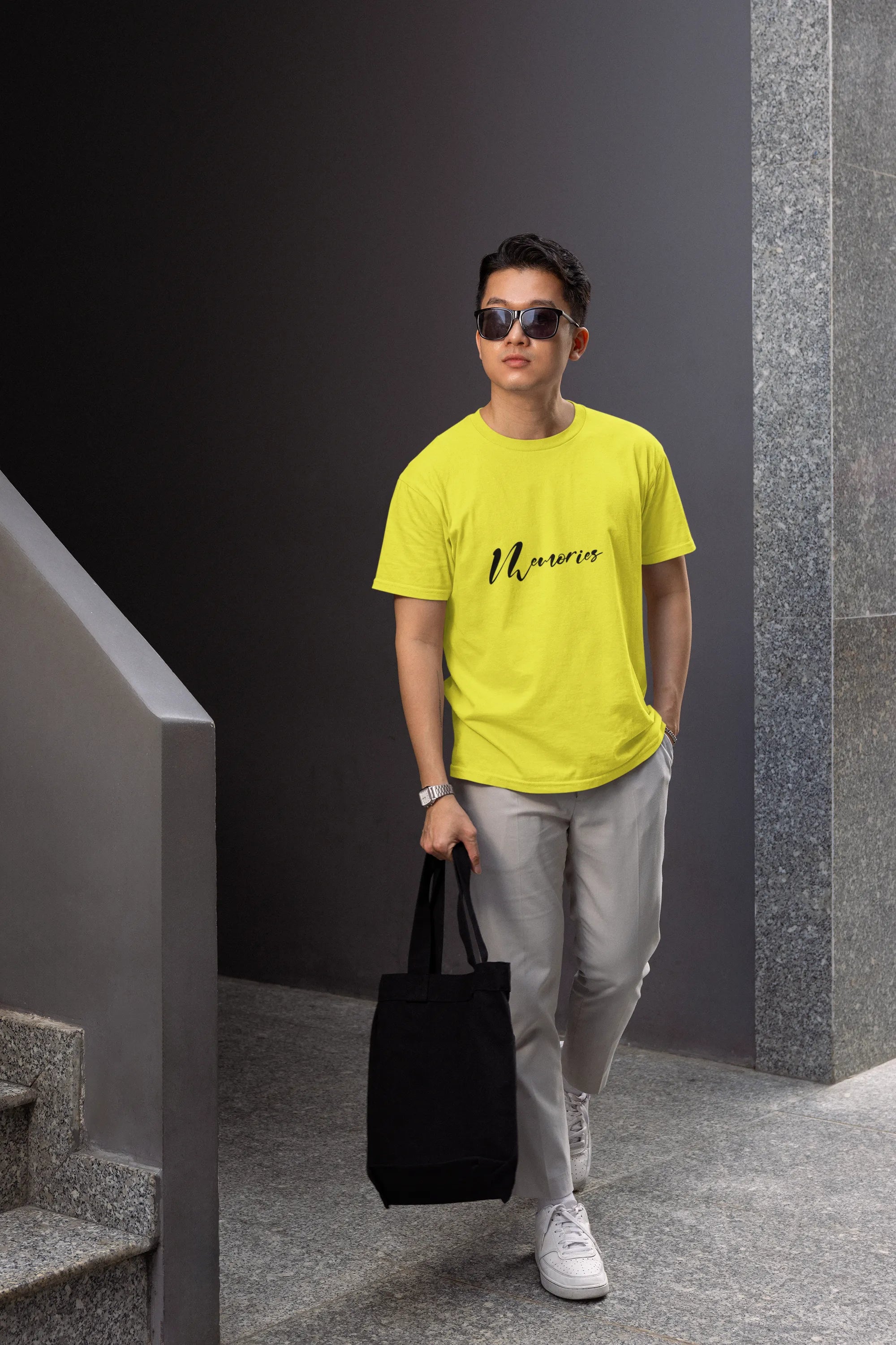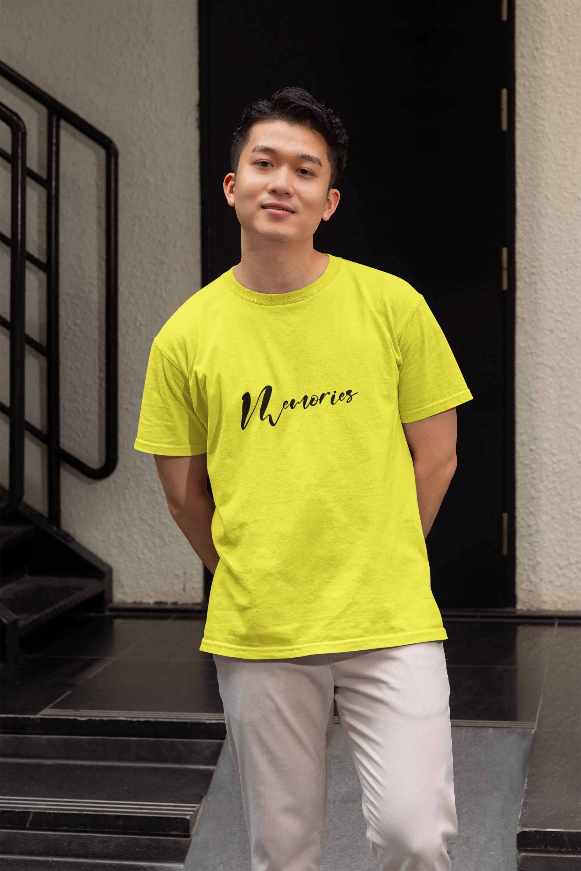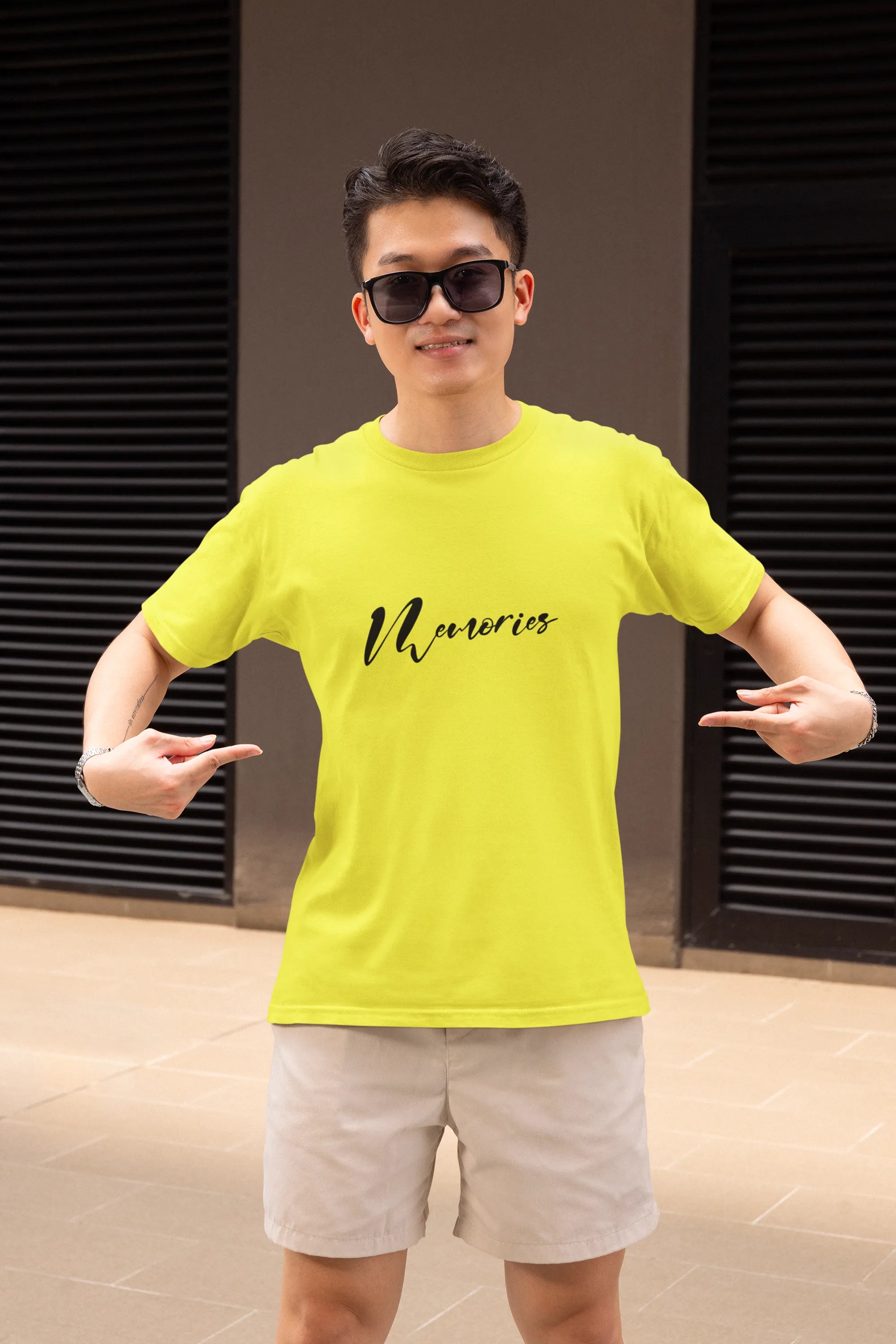 Yellow t-shirt with 'Memories' text on a hanger against a light green background