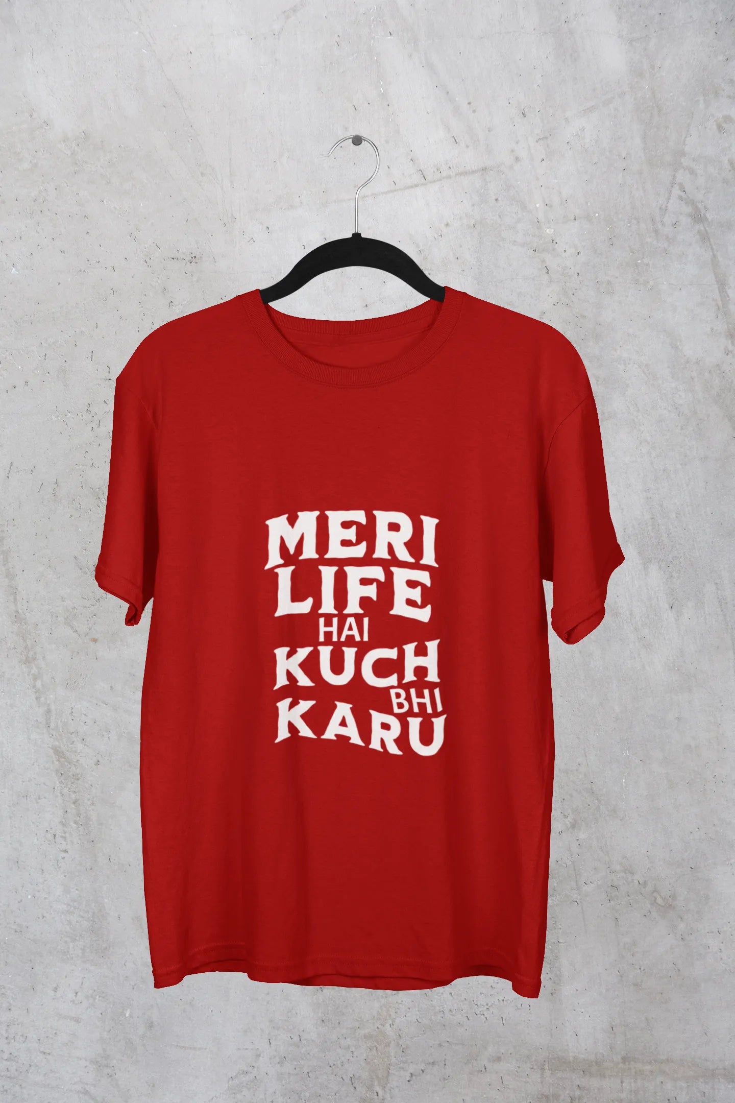 A bold and expressive t-shirt design with the phrase "Meri Life Hai Kuch Bhi Karu" in a stylish, graffiti-style font. Vibrant colors and playful doodles reflect a carefree attitude, perfect for those who live life on their own terms.