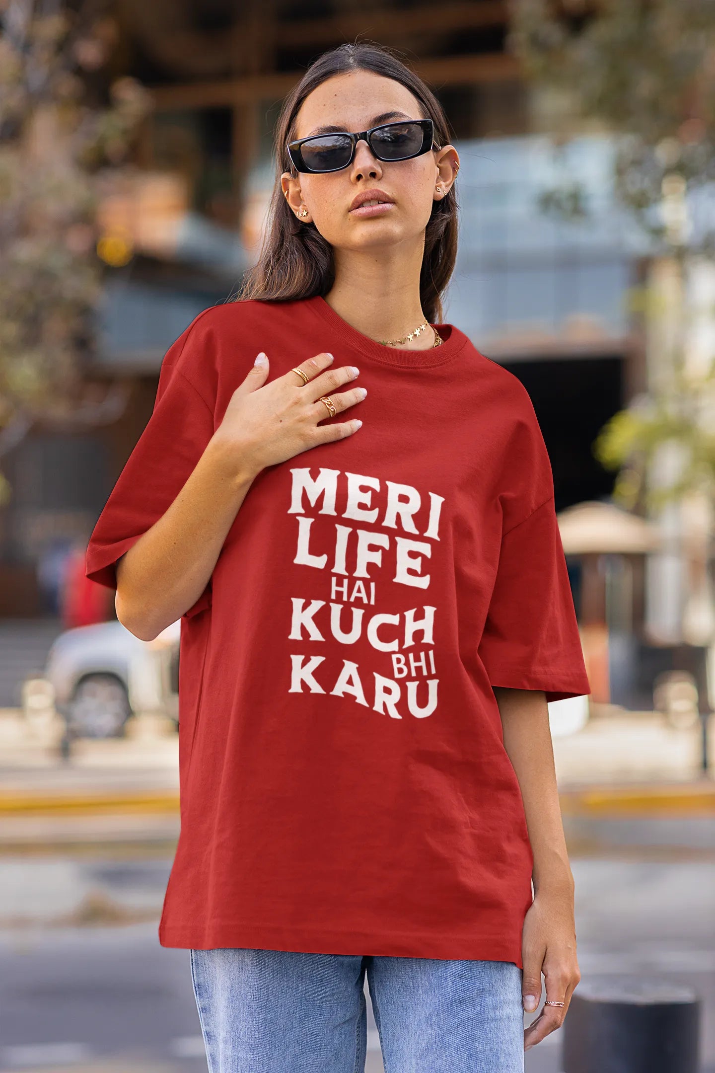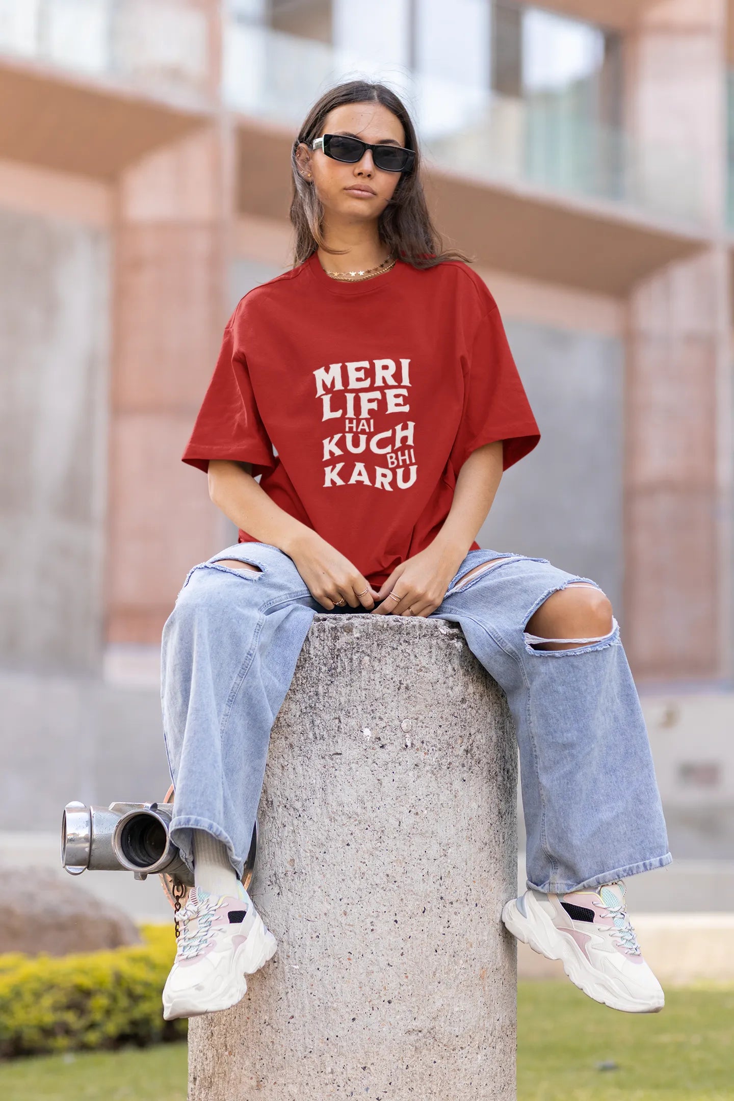 Person wearing a red oversized t-shirt with text and ripped jeans on a street.