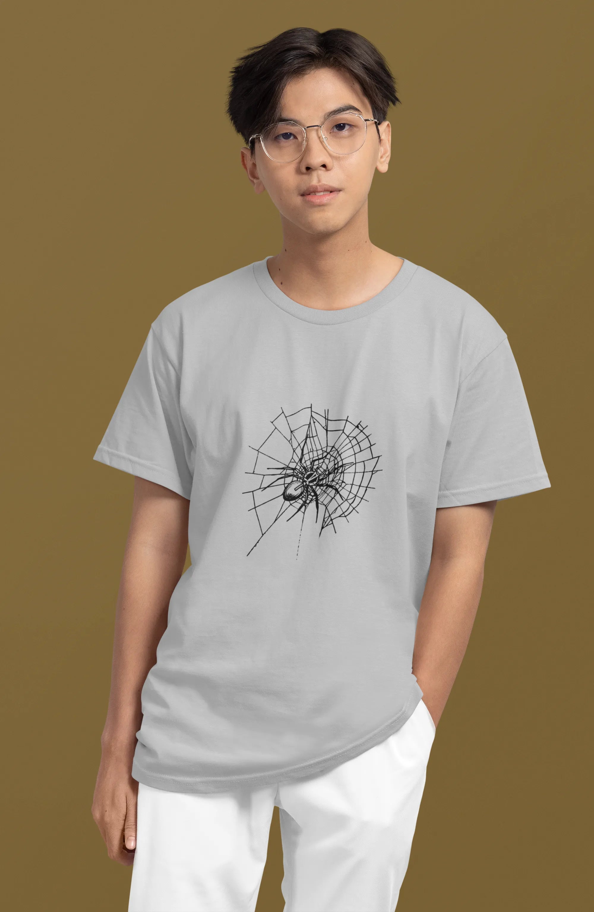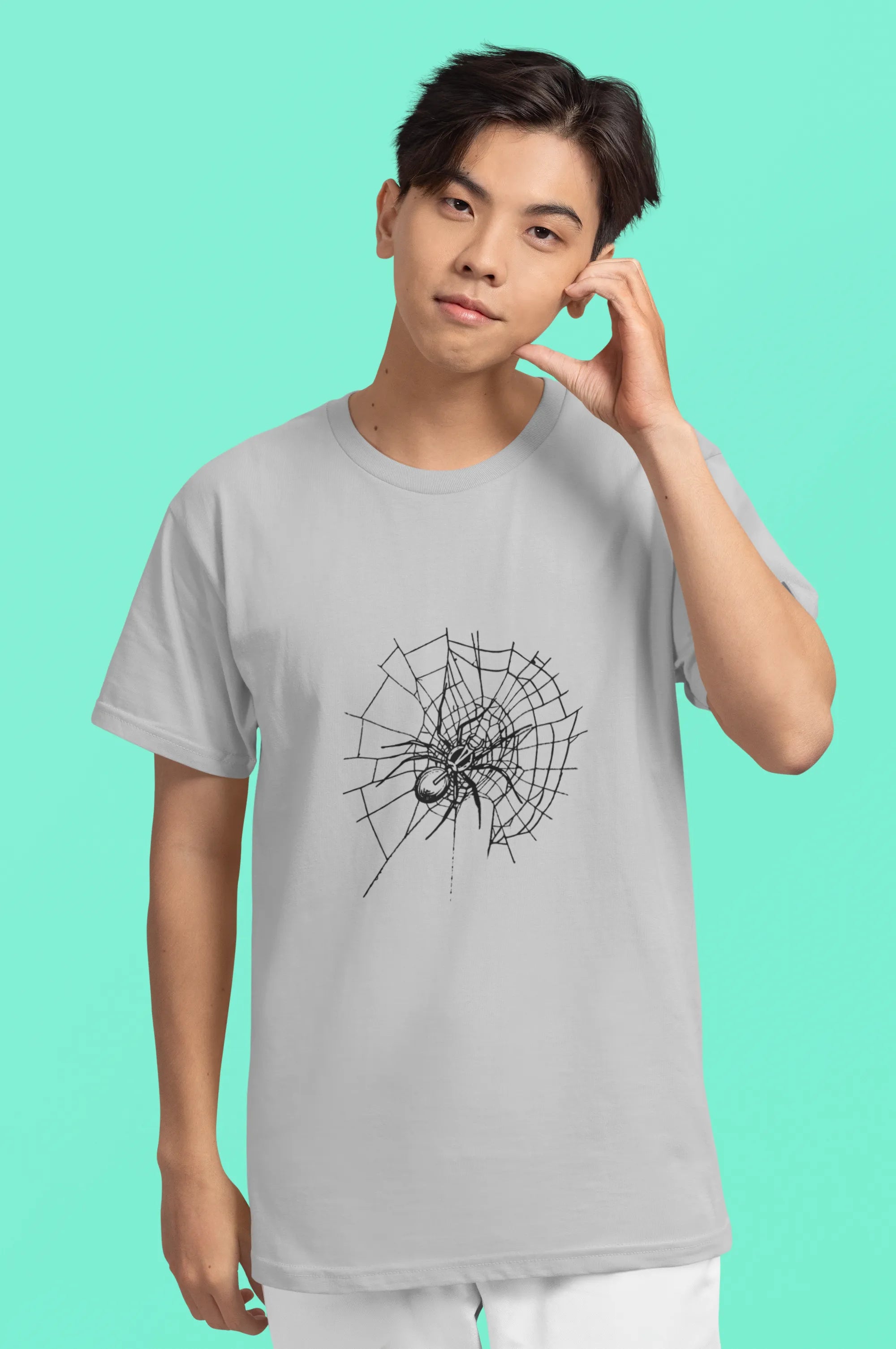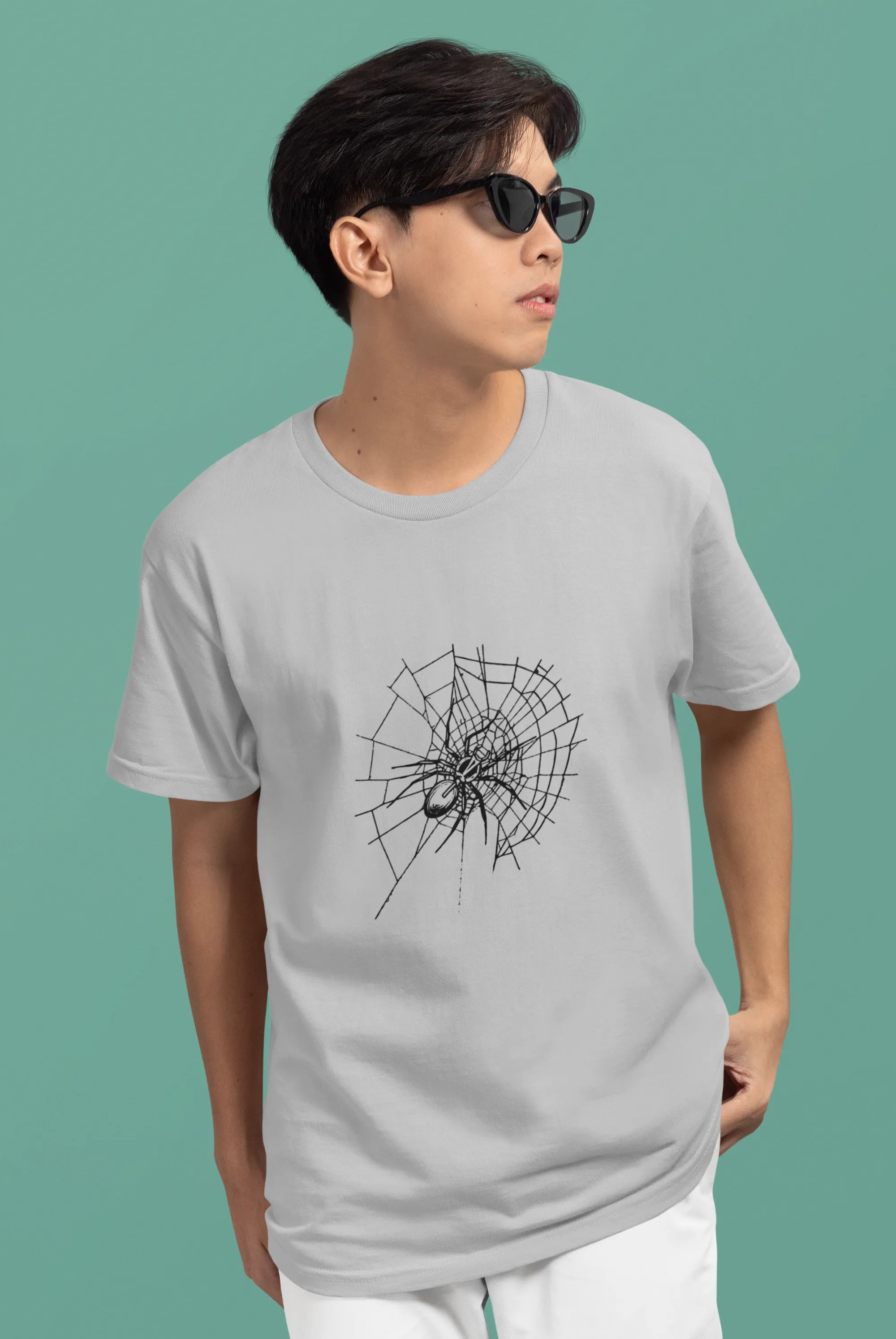 A bold and intriguing T-shirt design featuring a detailed spider illustration, with web patterns and sharp lines for a dramatic effect. Symbolizing mystery, patience, and creativity, it's perfect for fans of gothic art, nature, or superhero-inspired themes like Spider-Man.
