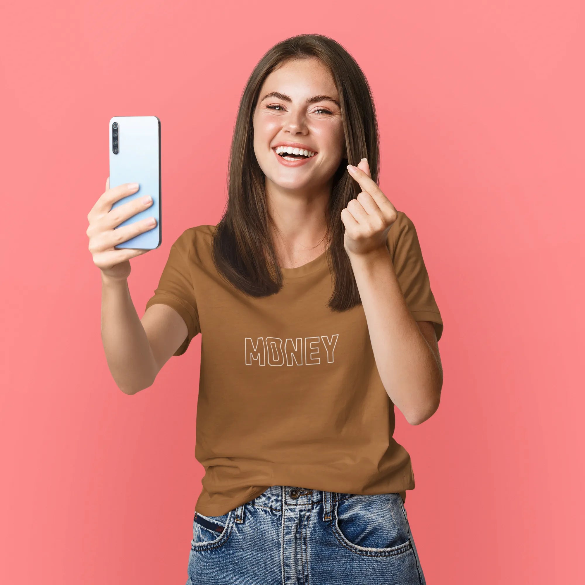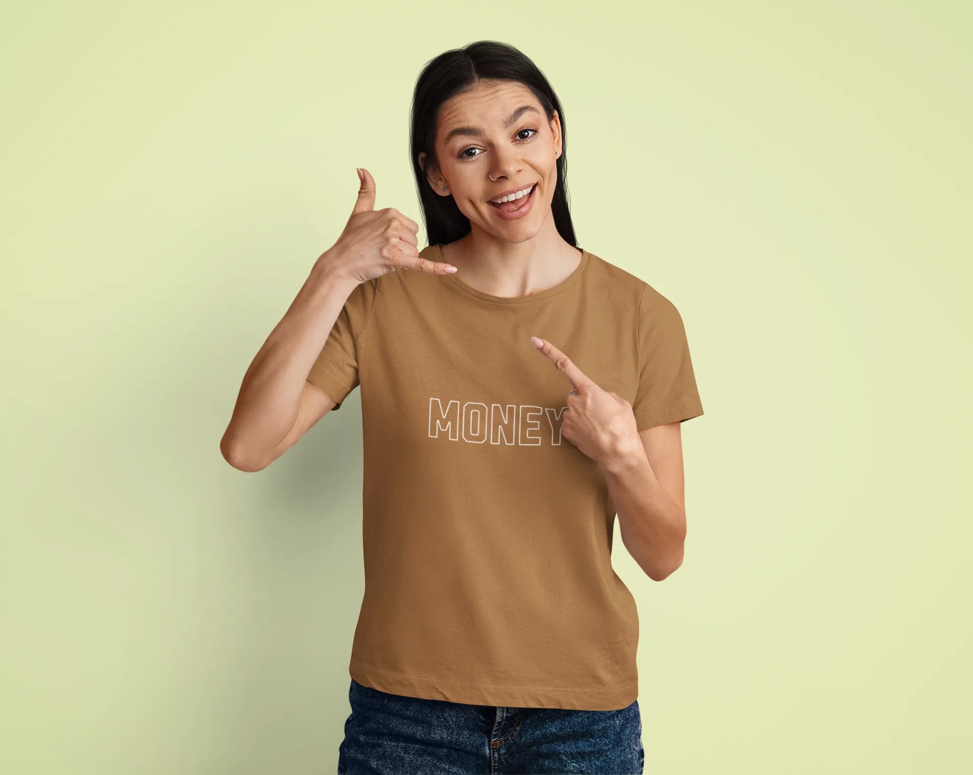 Woman wearing a brown ' MONEY ' t-shirt against a pink background