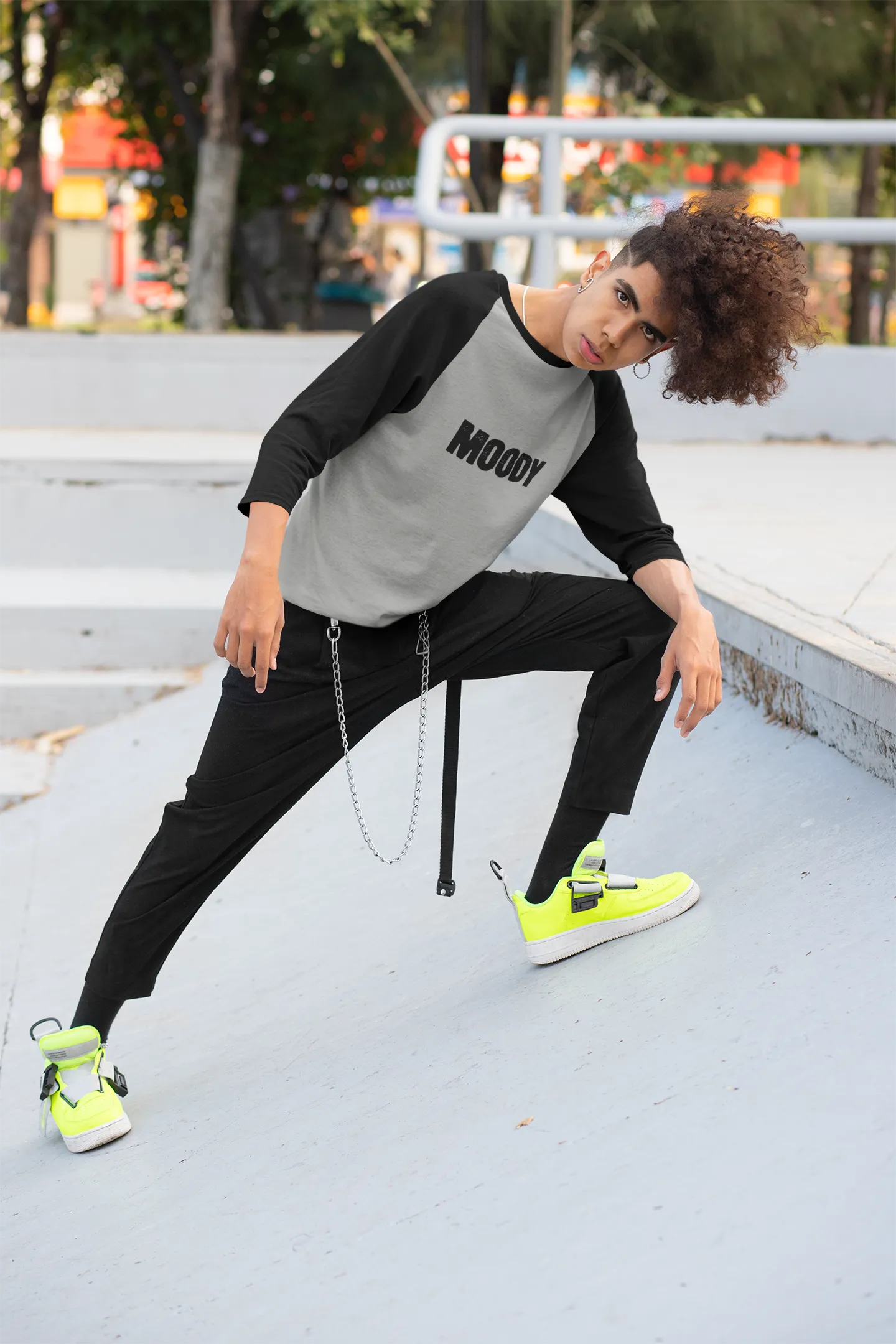 A bold T-shirt design featuring the word "MOODY" in edgy, distorted typography. Dark tones with a subtle cloud or storm graphic in the background reflect shifting emotions. Perfect for expressing complex vibes with a stylish, mysterious, and introspective flair.