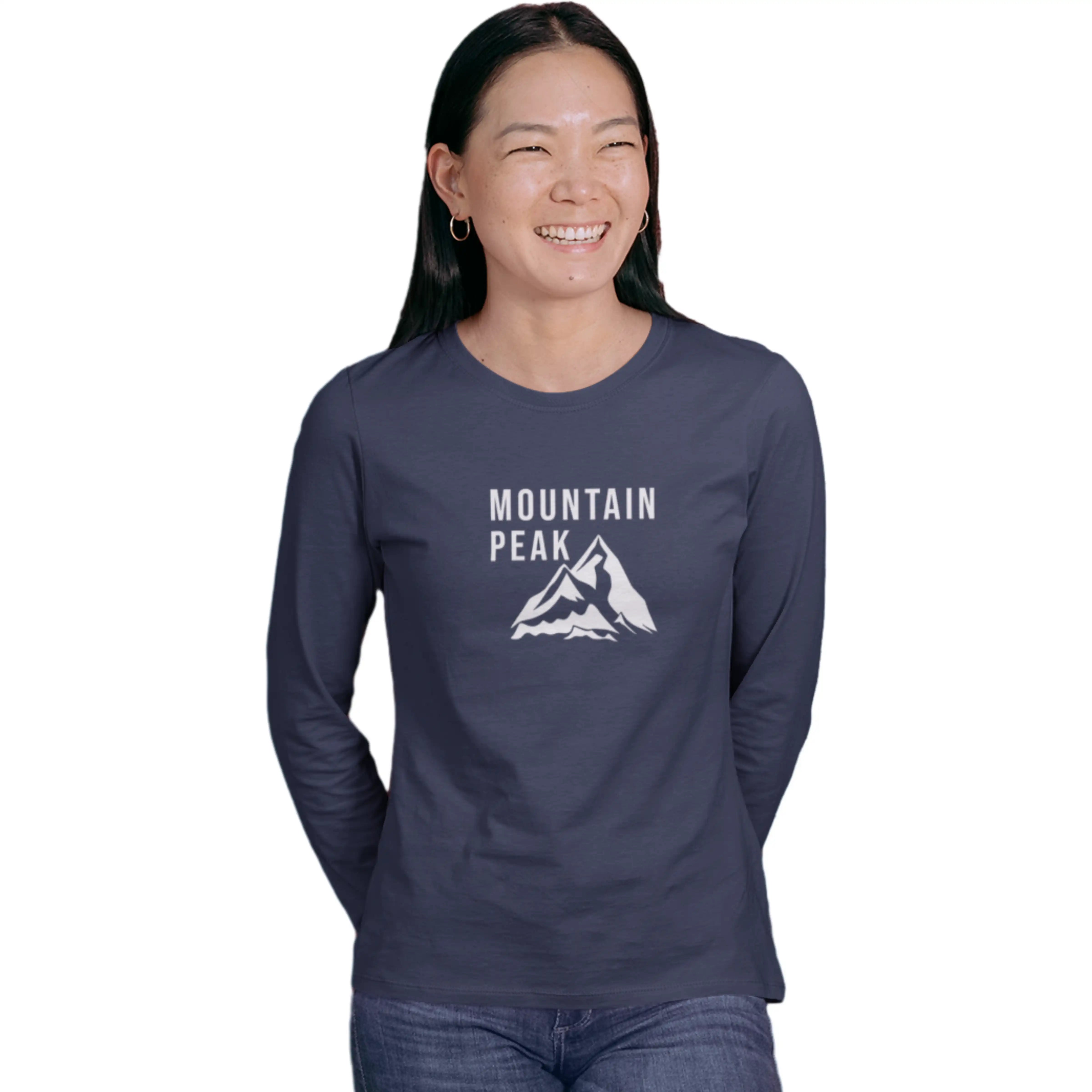 Person wearing a navy blue 'Mountain Peak' long-sleeve shirt on a white background