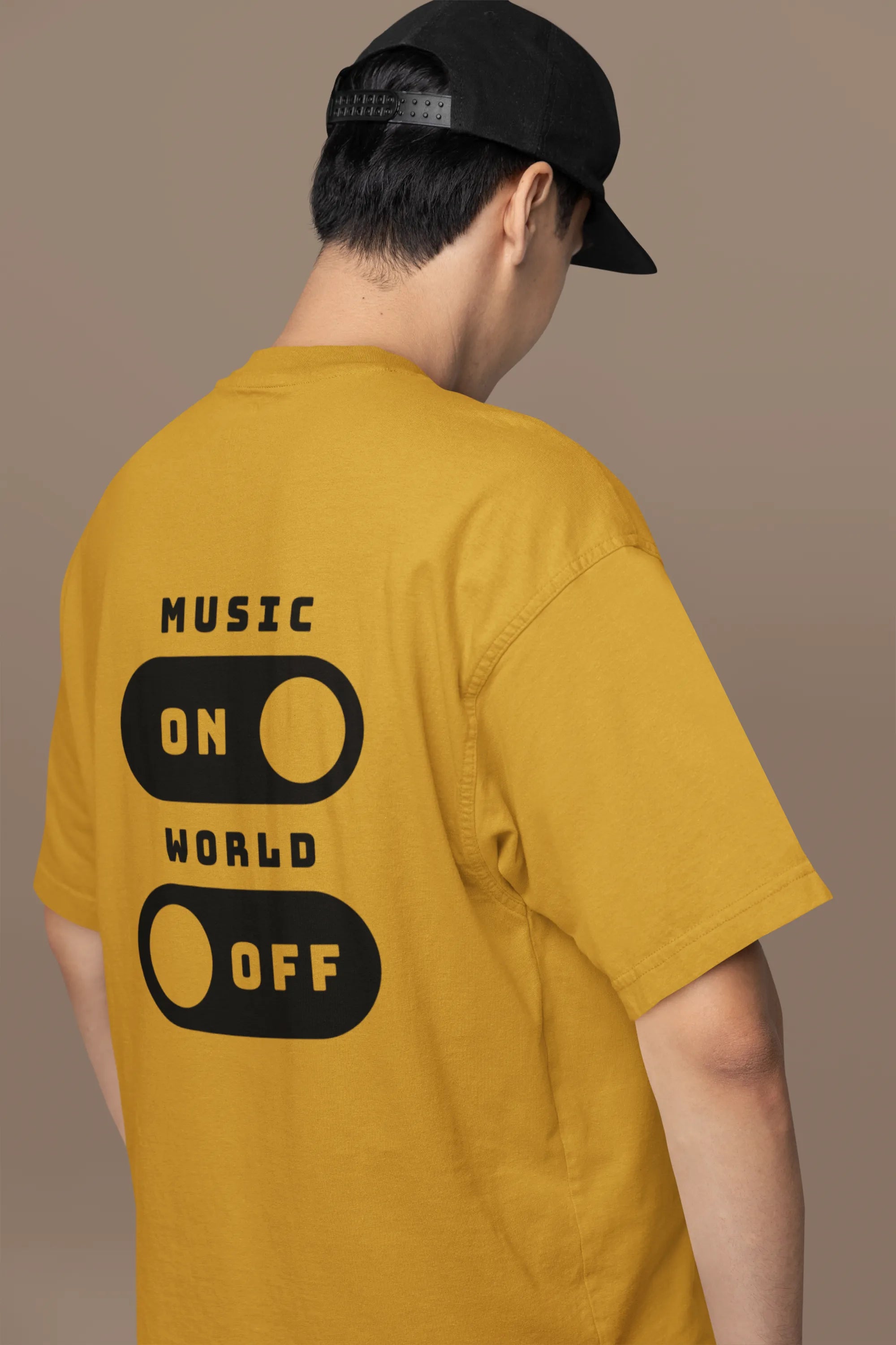 Person wearing a mustard yellow t-shirt with 'Music On World Off' text on the back, standing against a plain background.