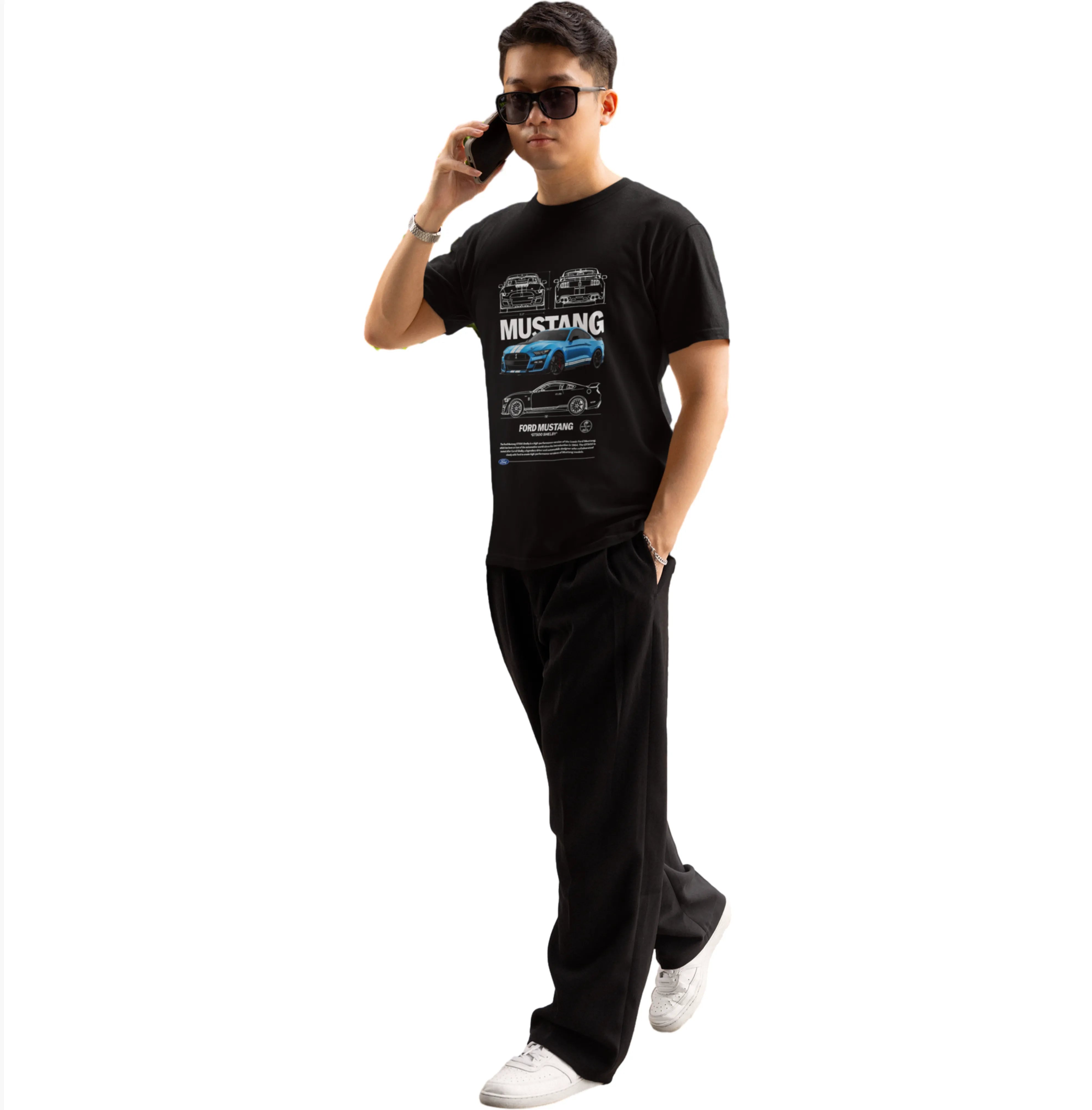 Person wearing a black t-shirt with 'Mustang' design on a white background