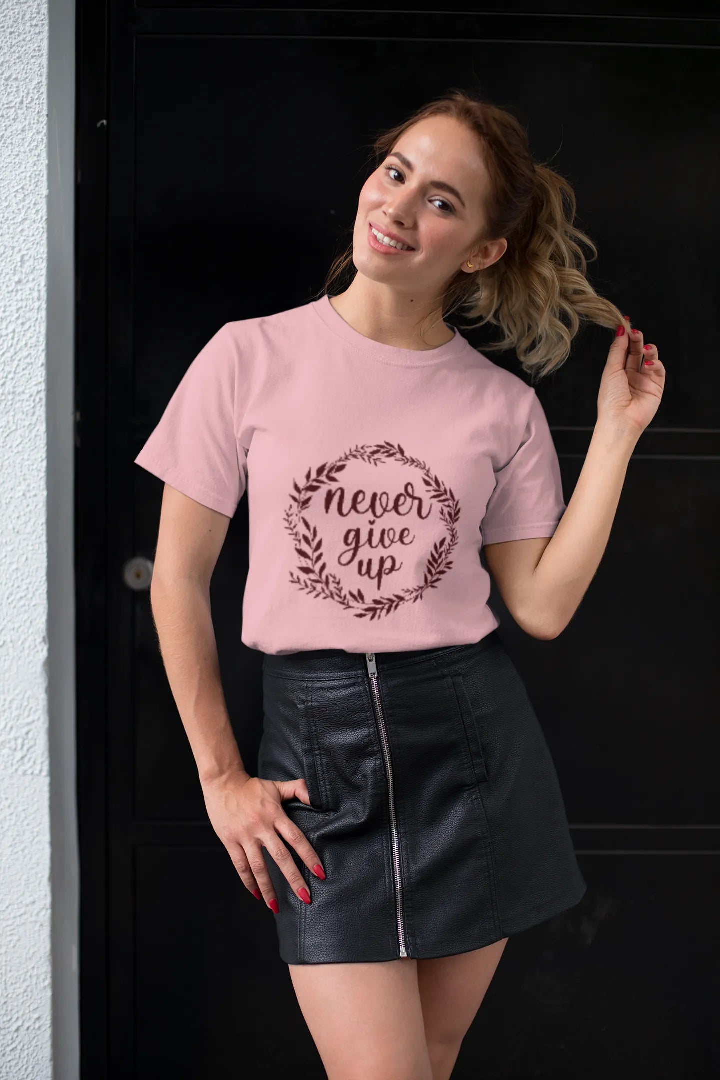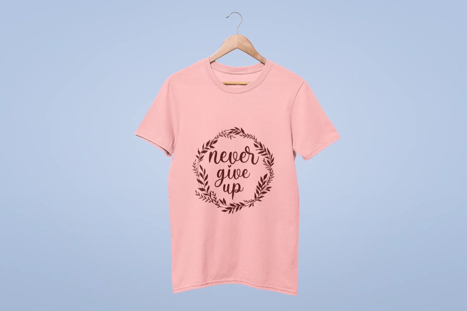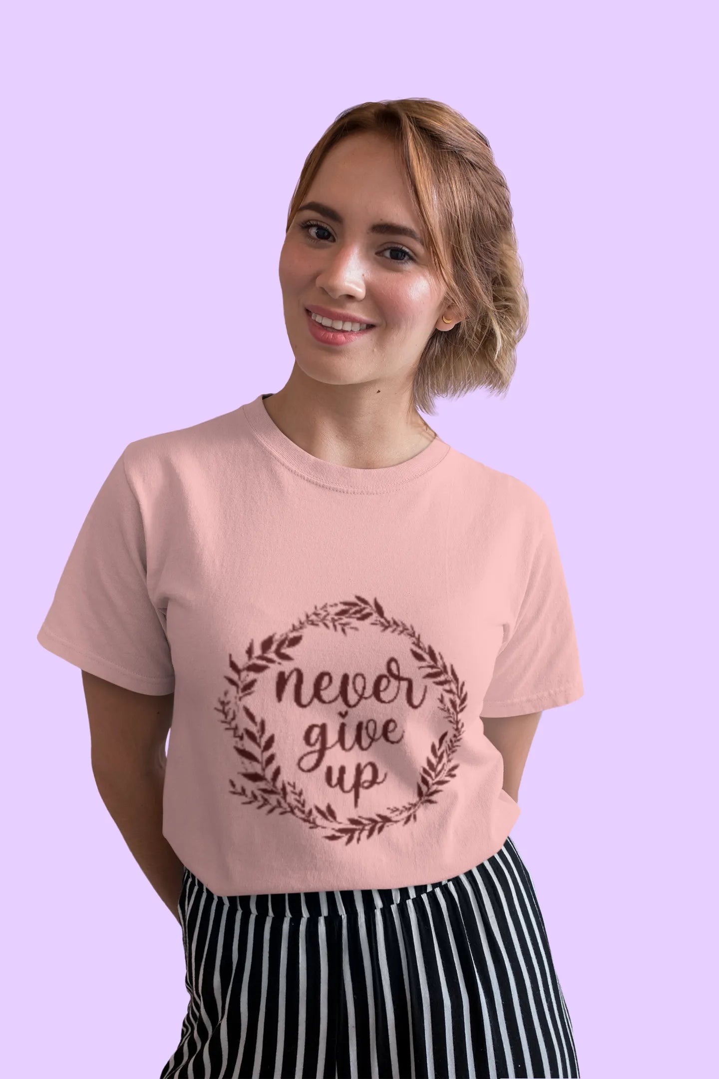 A bold T-shirt design featuring "Never Give Up" in dynamic, eye-catching typography. Enhanced with strong, energetic colors, motivational elements like arrows or lightning bolts, and a sleek, modern look—perfect for inspiring resilience and determination in every step.