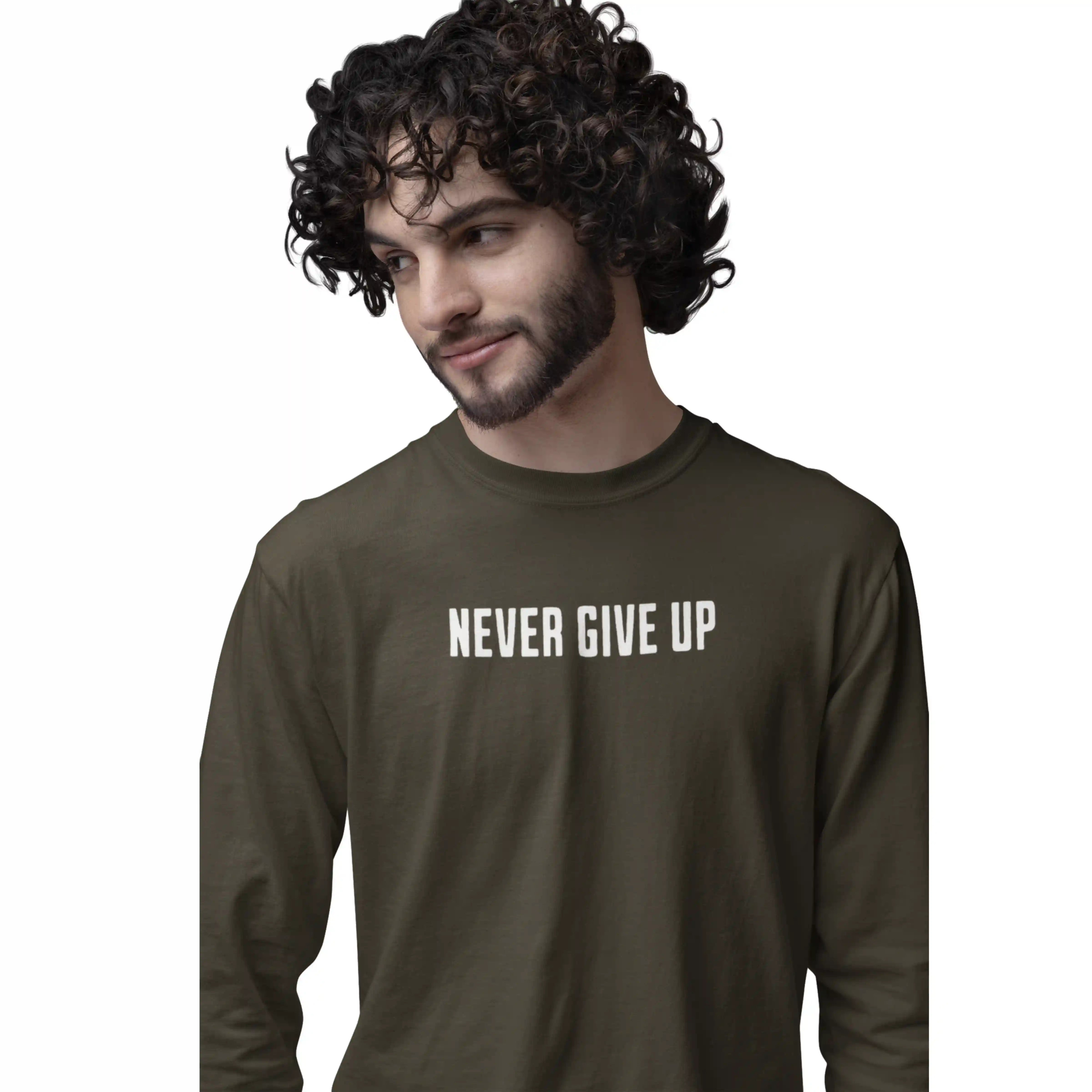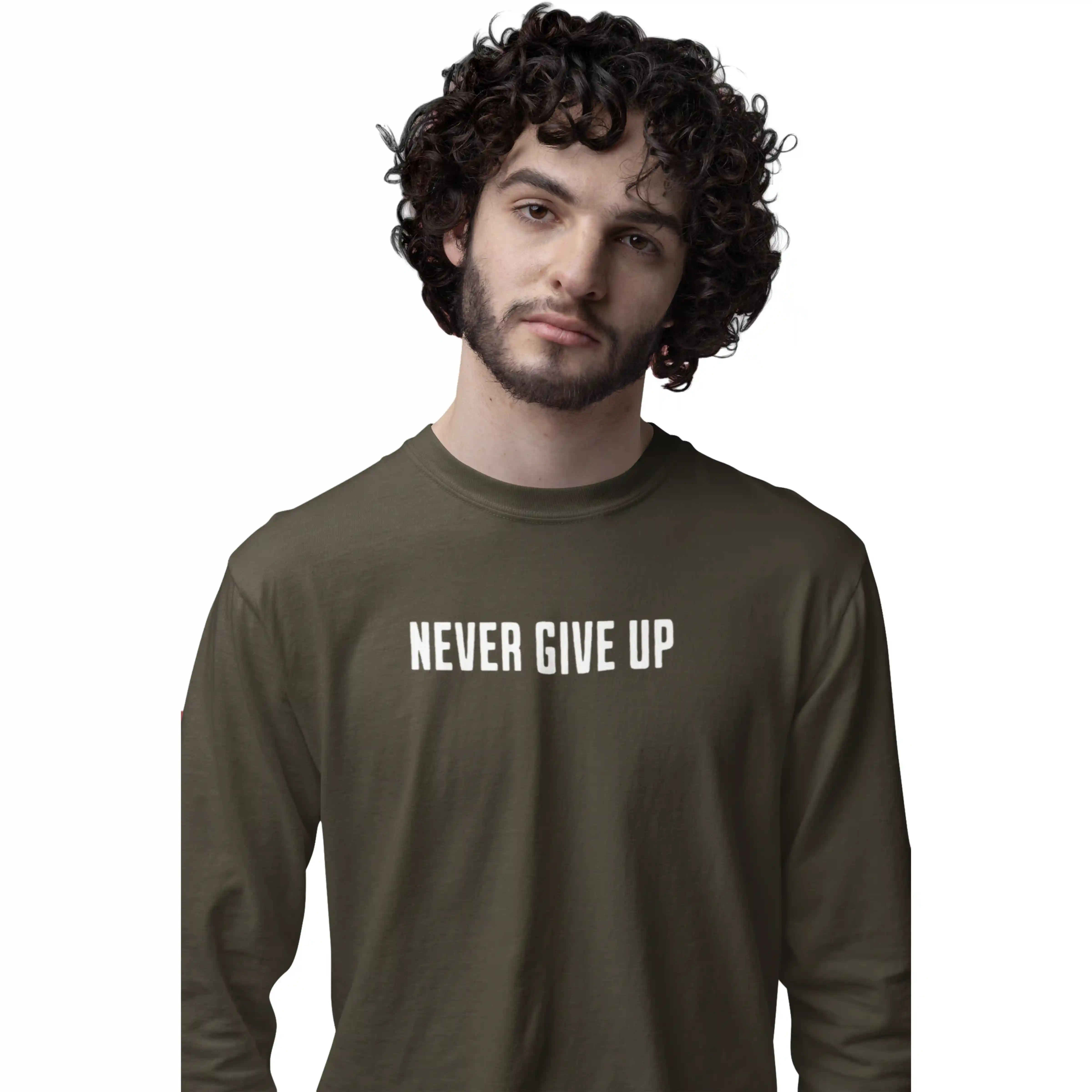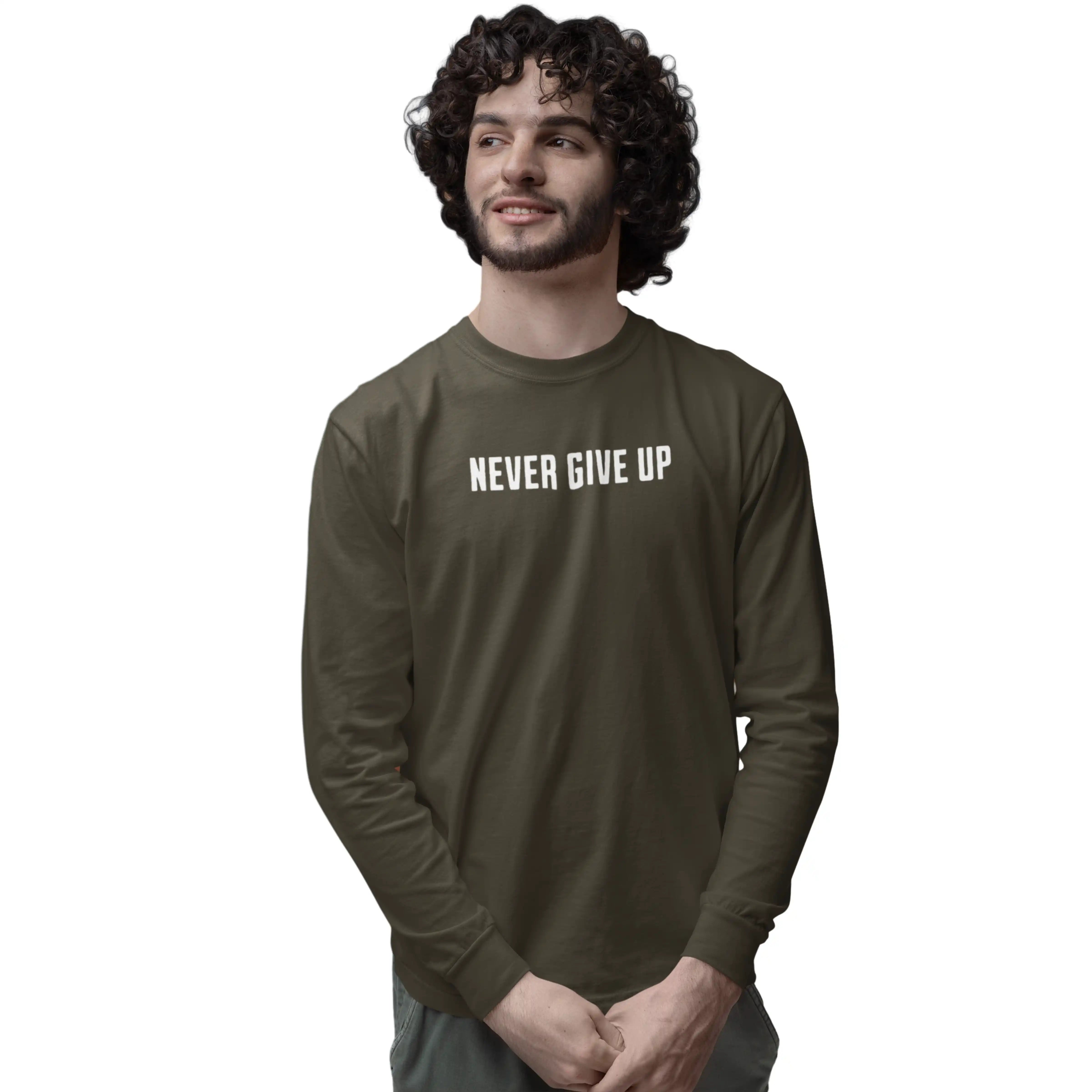 Stay strong with the 'Never Give Up' olive green T-shirt — a bold reminder to keep pushing forward no matter what.