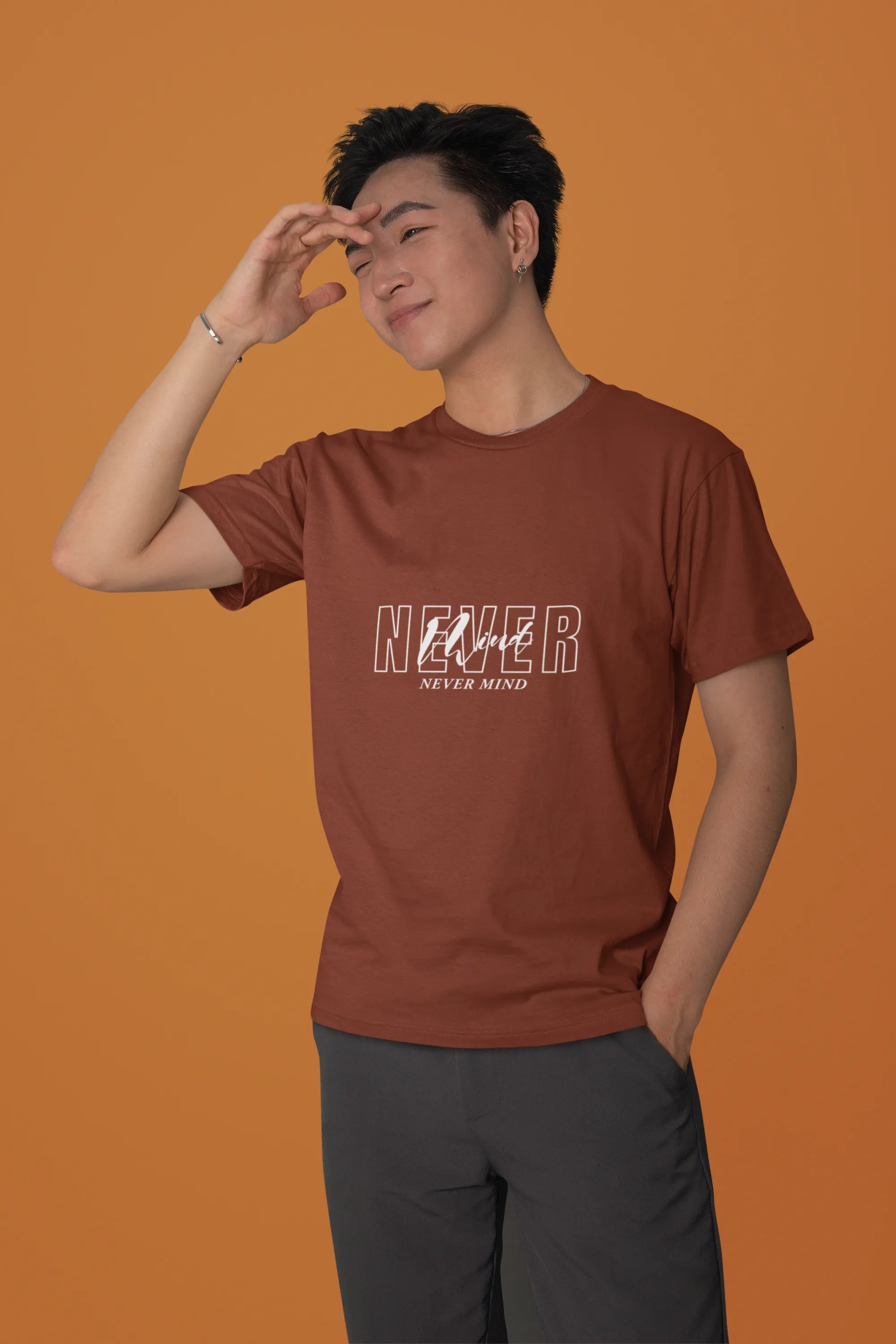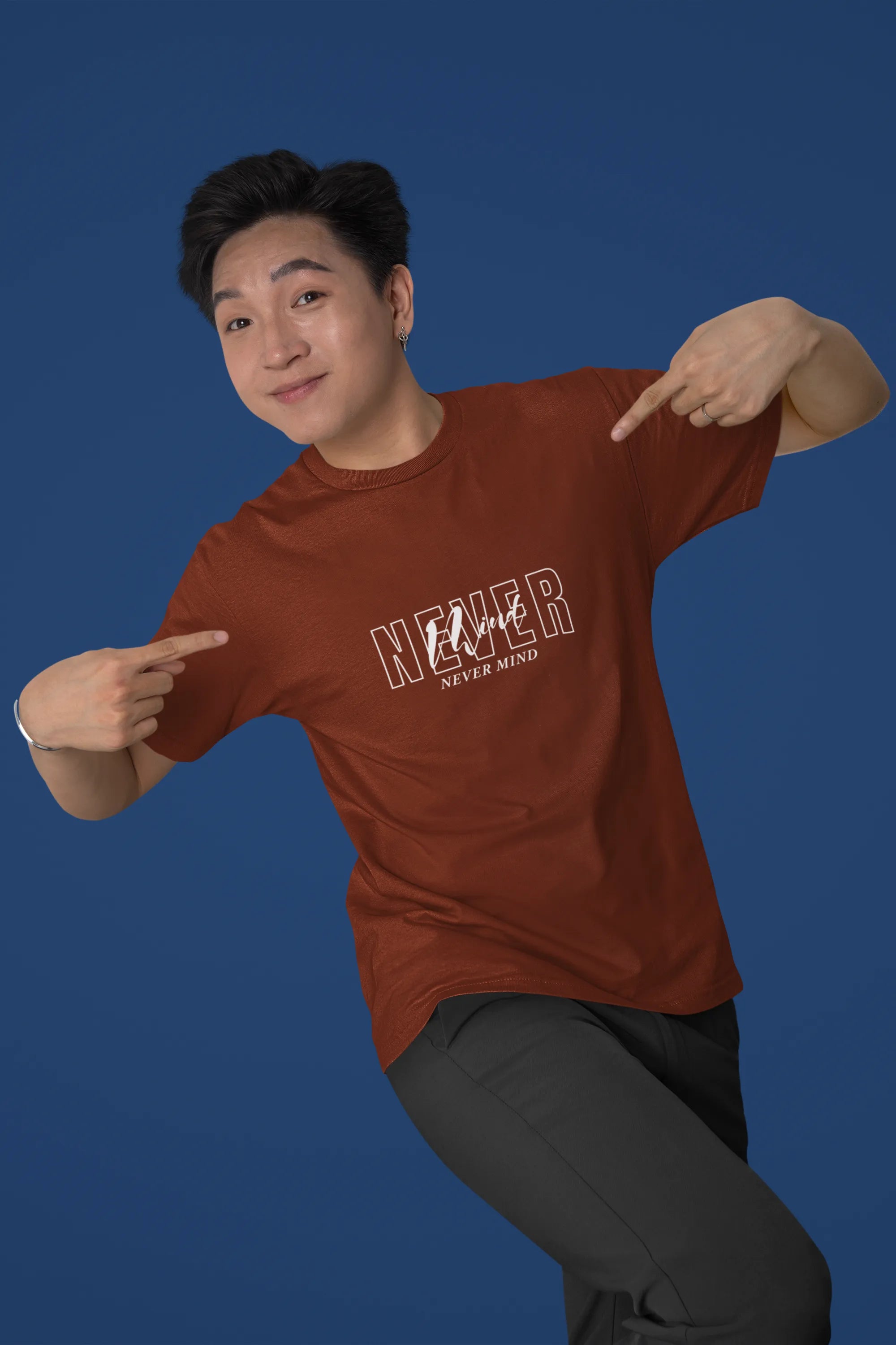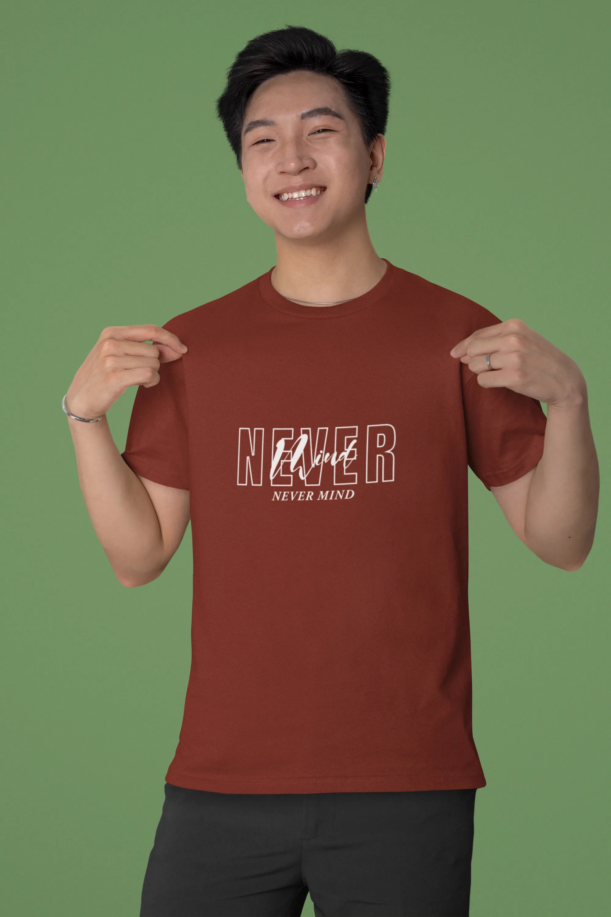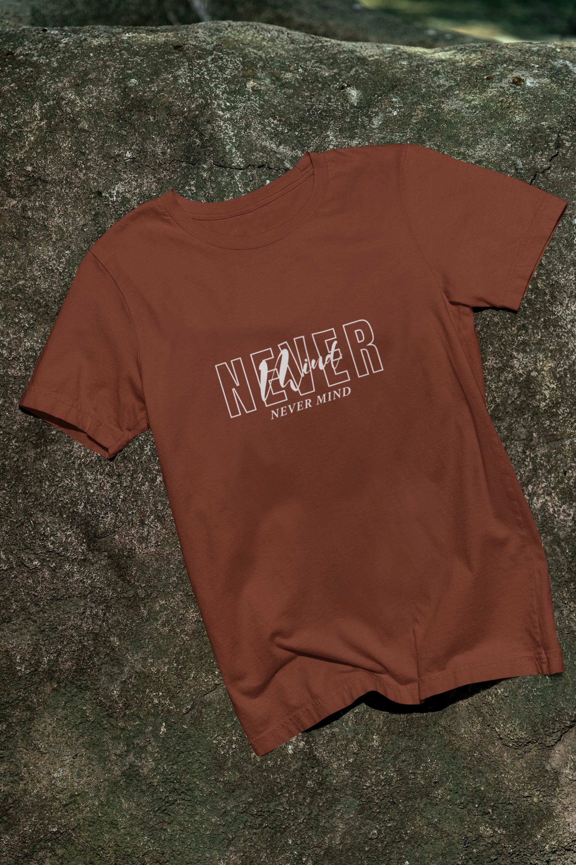 A minimalist T-shirt featuring the phrase "Never Mind" in bold, modern typography. The design reflects a carefree attitude, blending simplicity with edgy style—perfect for expressing a chill, unbothered vibe in everyday wear.