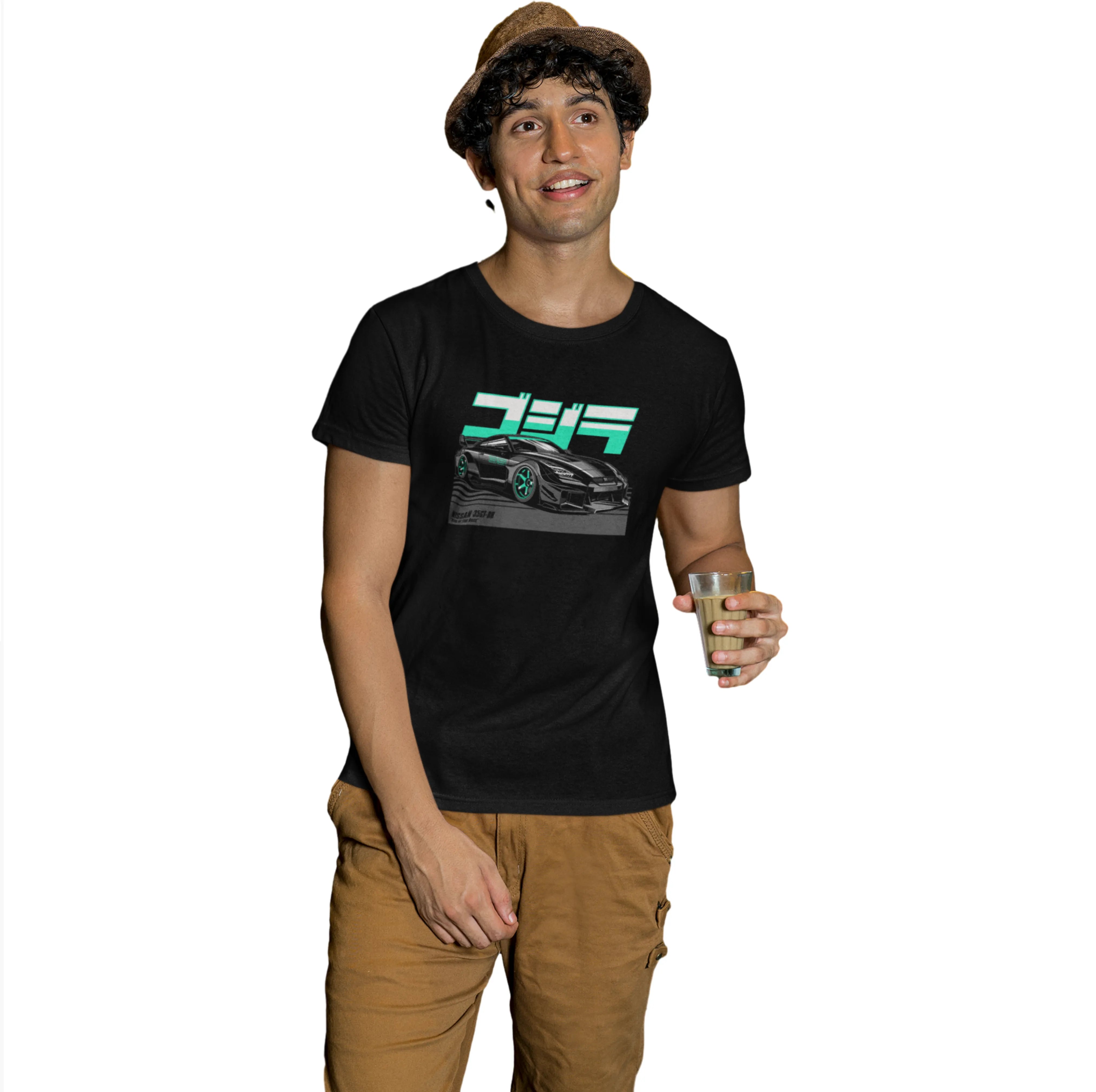 Man wearing a black t-shirt with a graphic design, holding a brown cup on a white background
