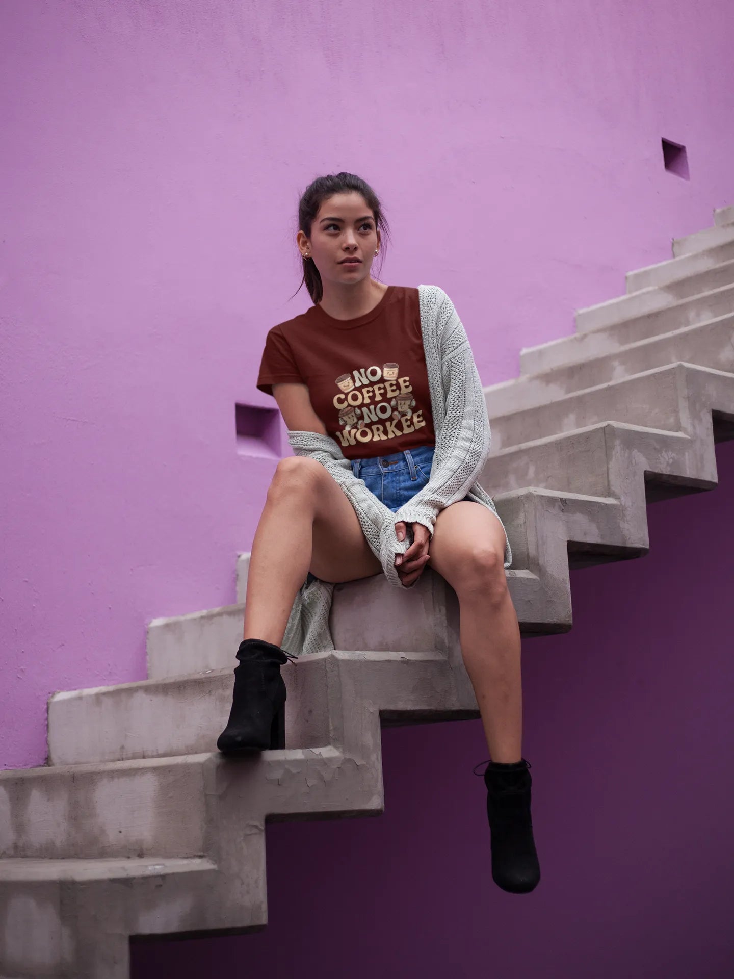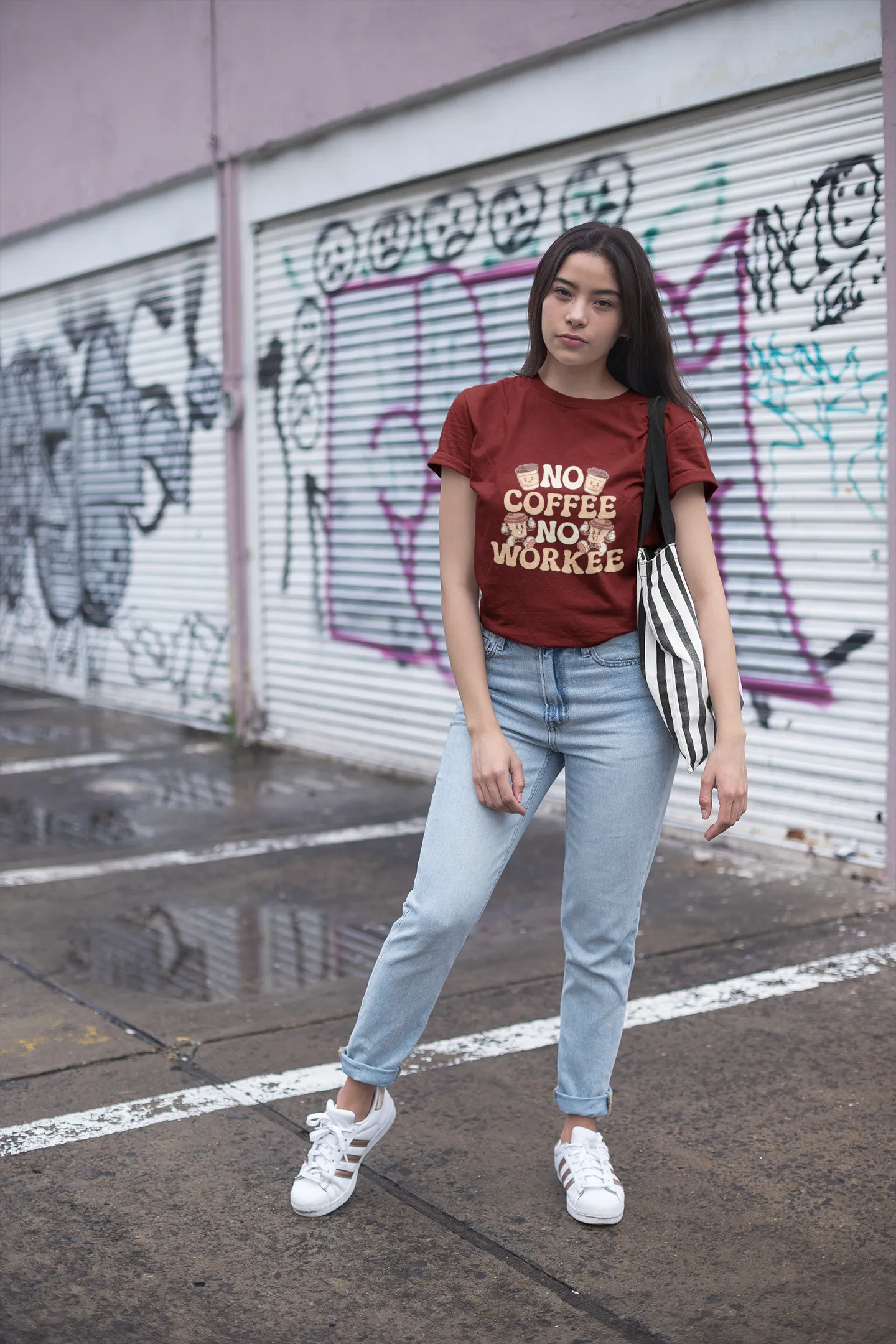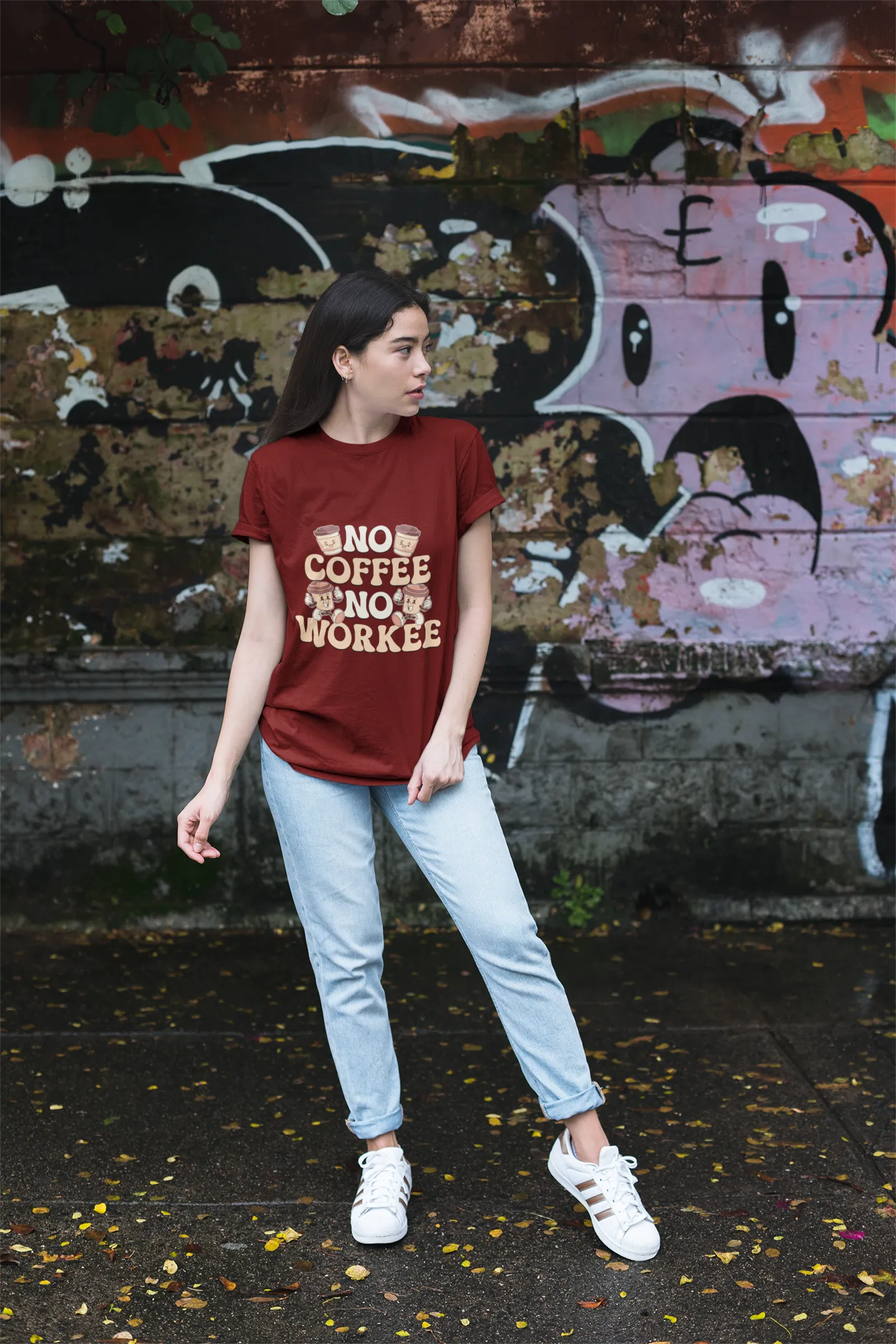 A bold and minimalist T-shirt design featuring the phrase "No Coffee, No Work" in a stylish, modern font. A coffee cup icon with steam rising adds a dynamic touch, while a monochrome or earthy color palette keeps it sleek and trendy.