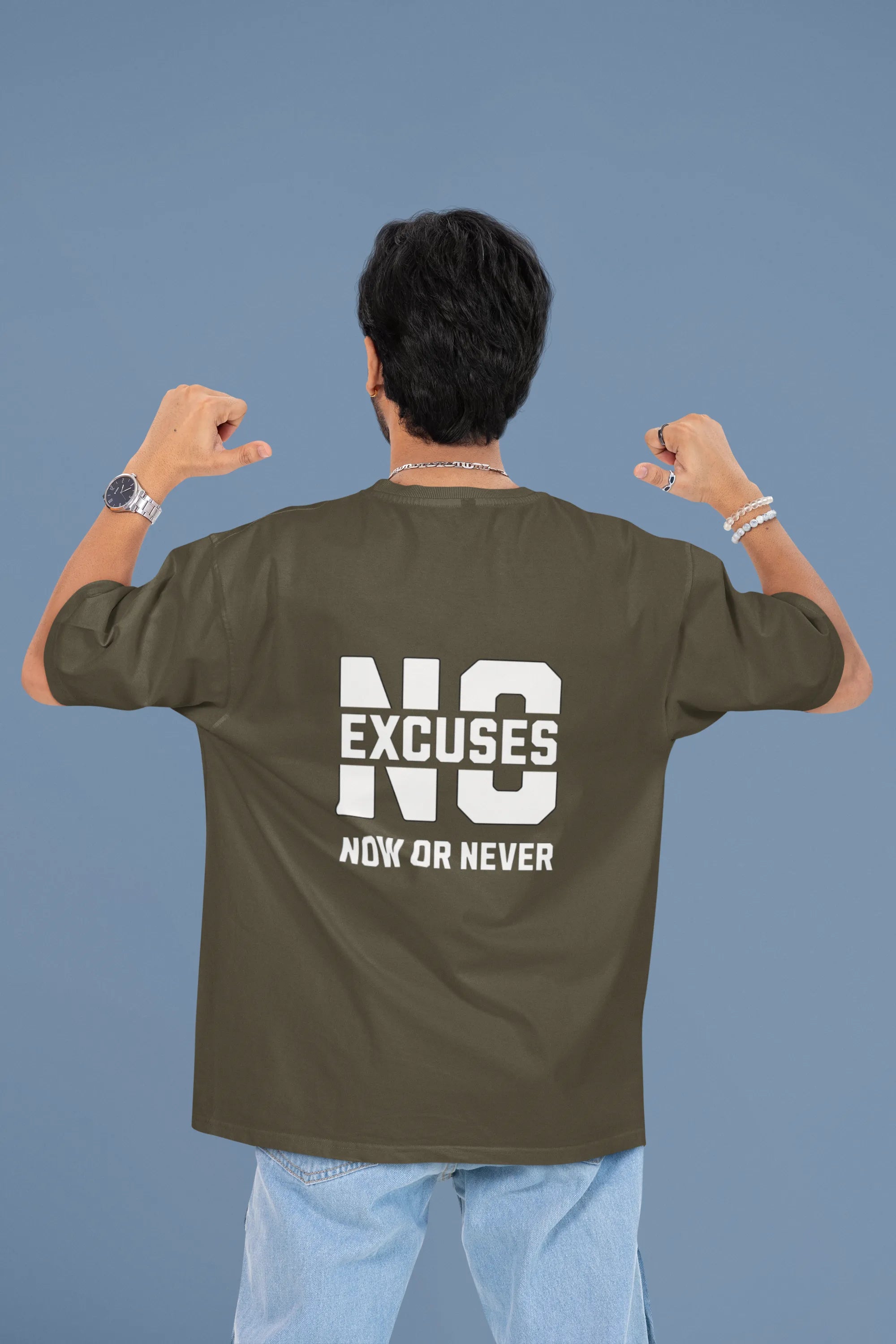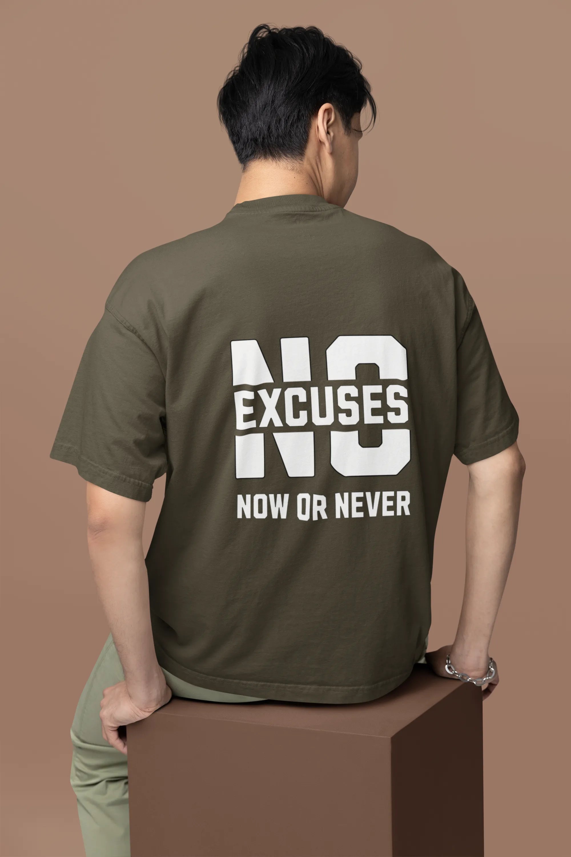 A high-impact oversized t-shirt featuring the bold phrase "No Excuses. Now or Never." in strong, block typography. Designed for go-getters, gym lovers, and dream chasers. Clean lines, monochrome or neon contrast, delivering pure motivation with every step.
