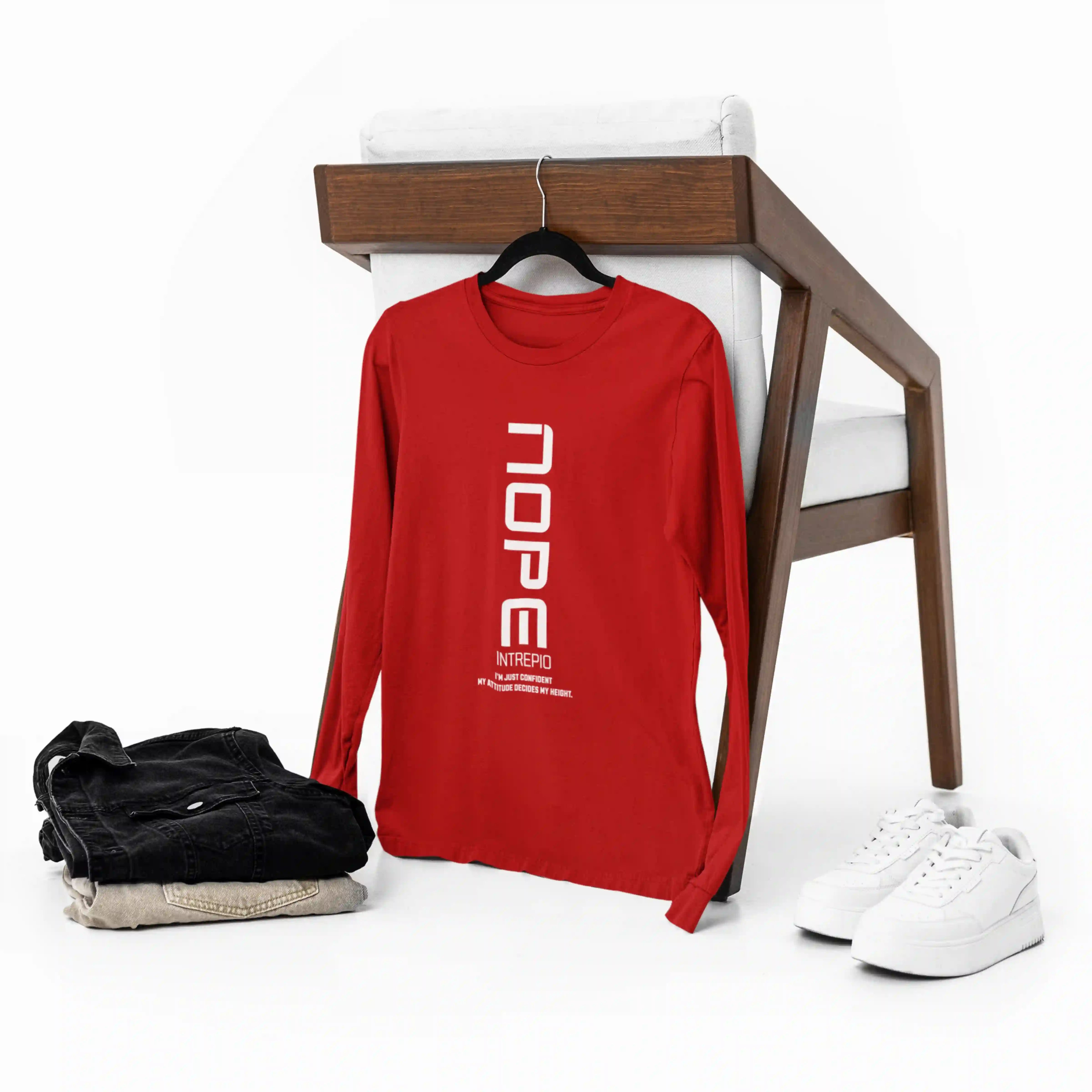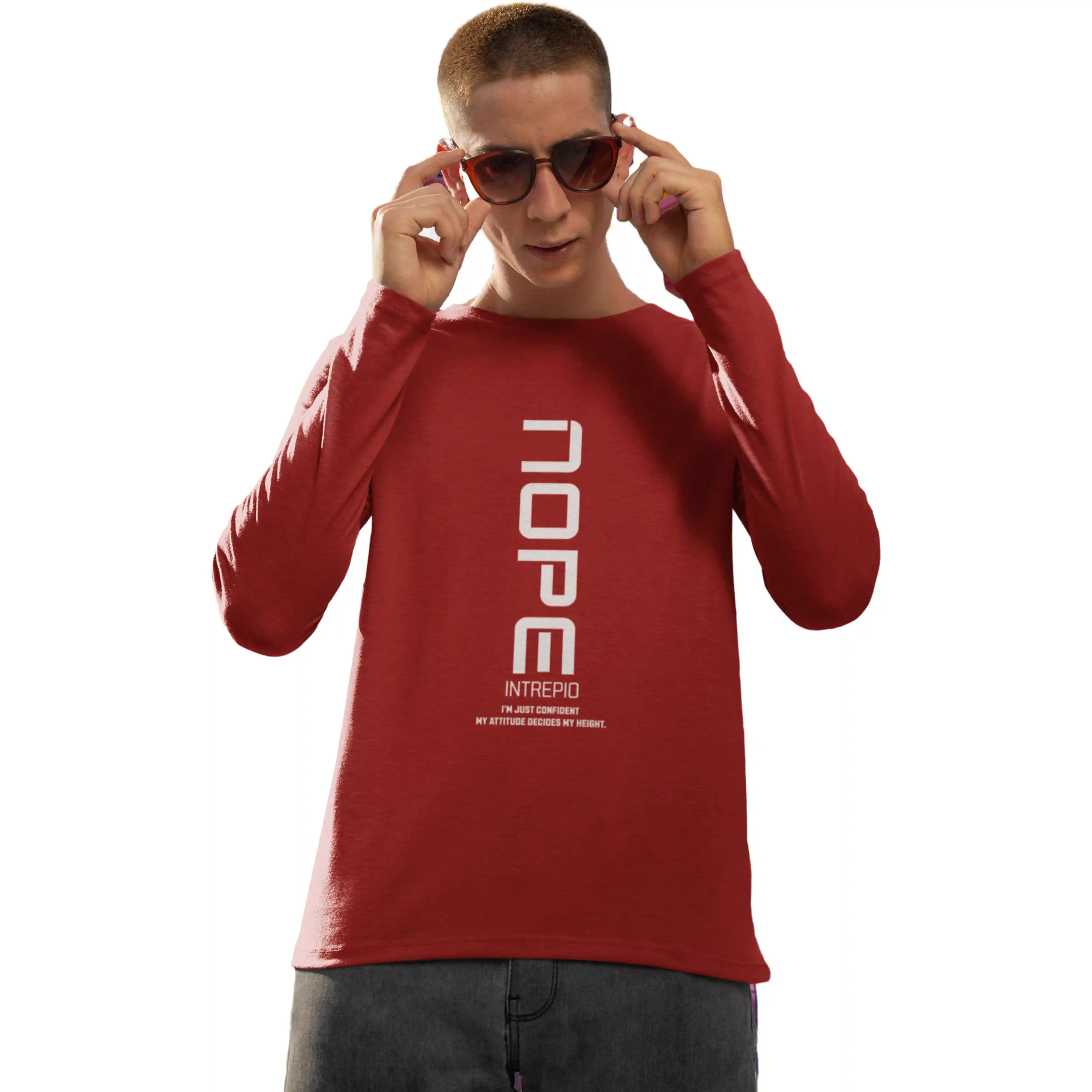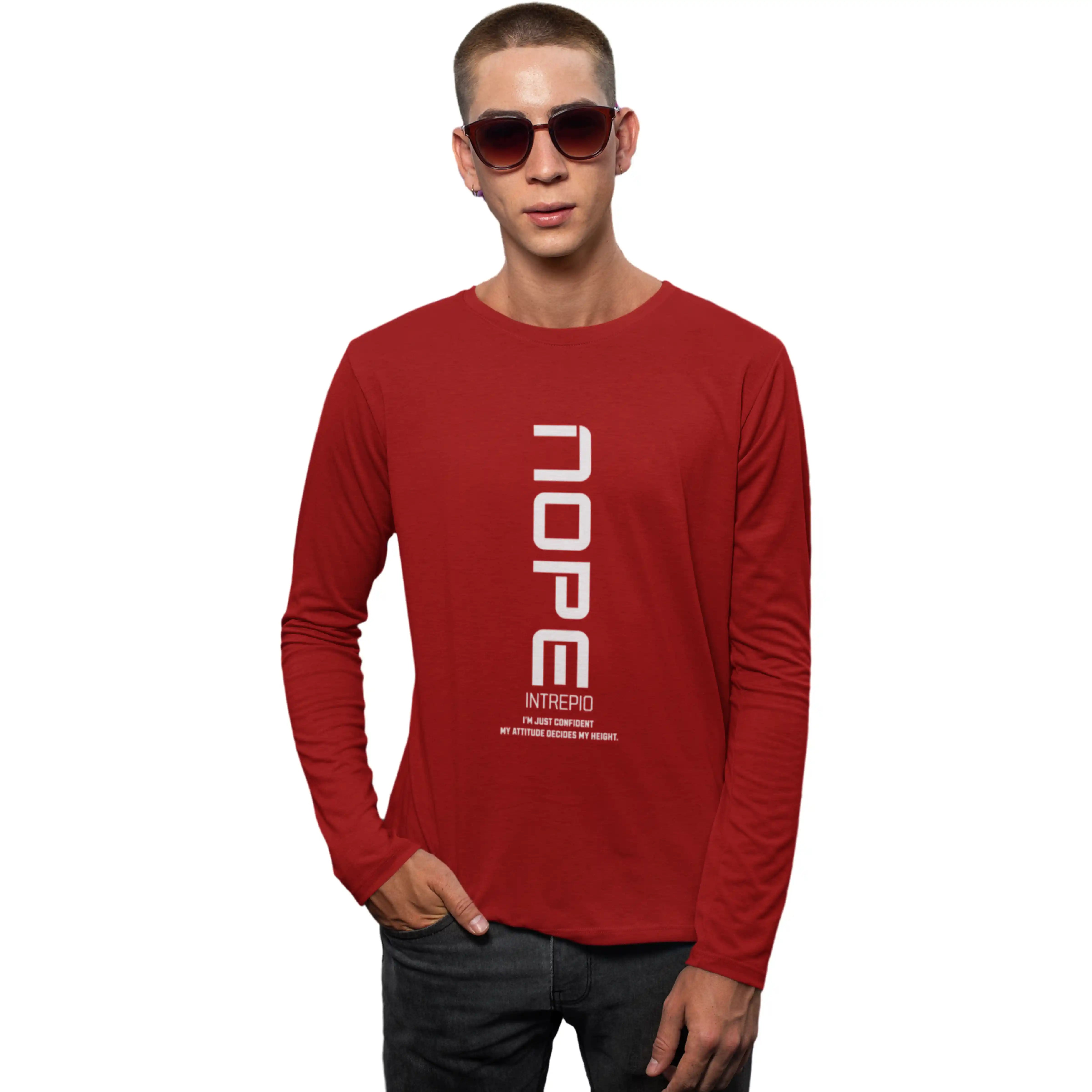 Make a bold statement with this red full-sleeve T-shirt featuring “NOPE” print. Crafted from soft, breathable fabric, it offers a regular fit and round neck, giving casual comfort and confidence with a dash of attitude for everyday wear.