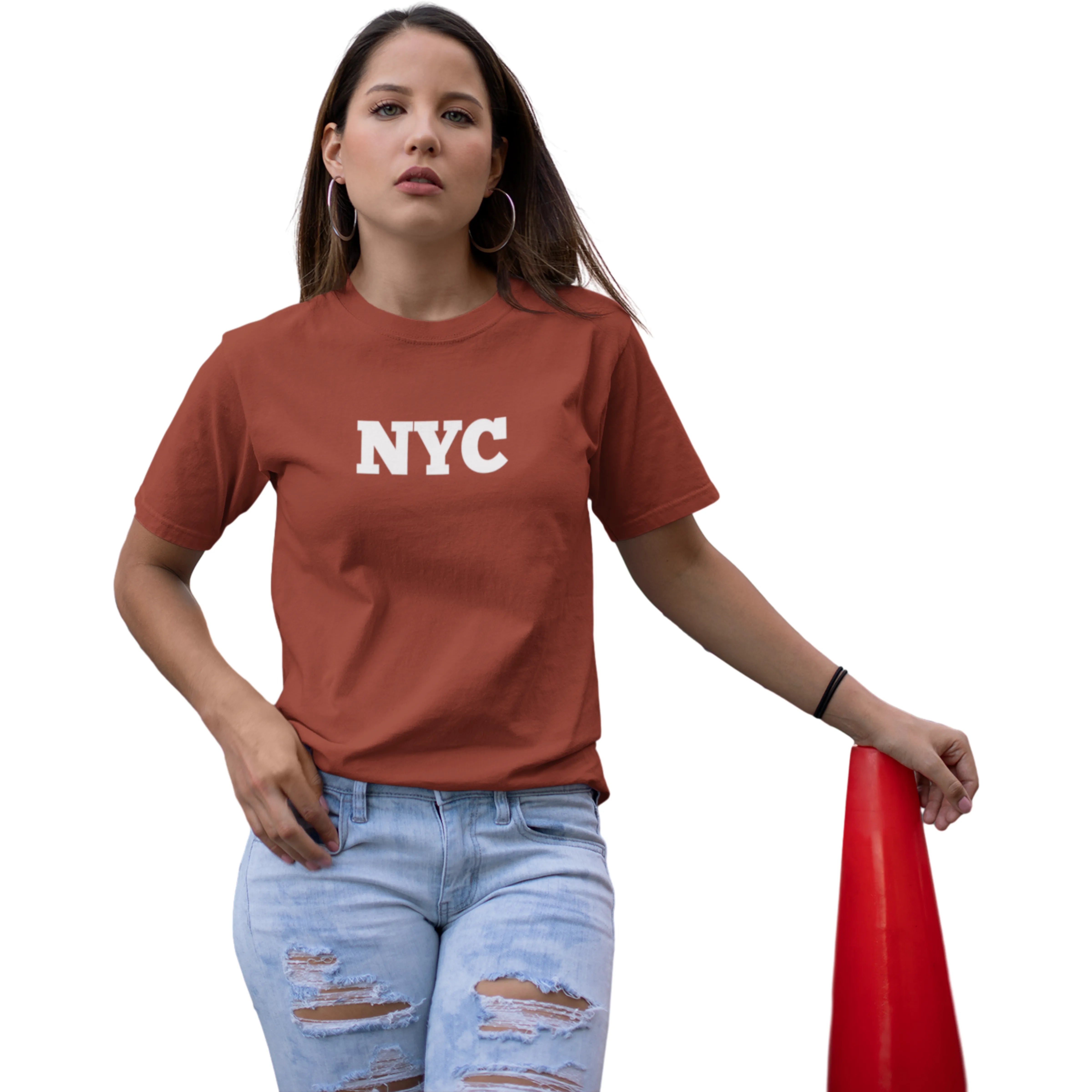 Woman wearing a brown 'NYC' t-shirt on a white background