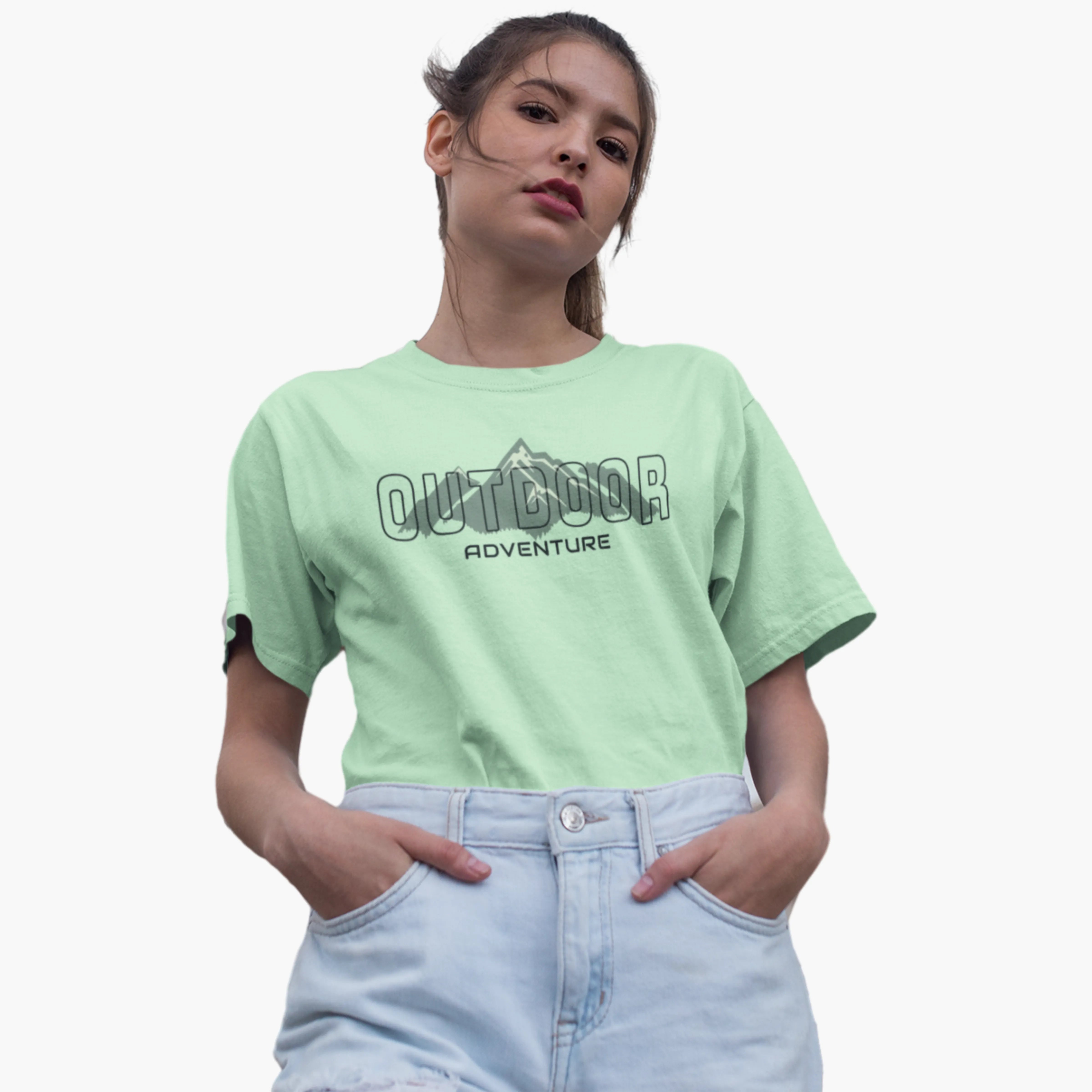 Connect with nature in this jade green “outdoor” T-shirt. Perfect for women who love the wild and free lifestyle. With soft fabric and effortless style, it’s great for hikes, road trips, or peaceful escapes.