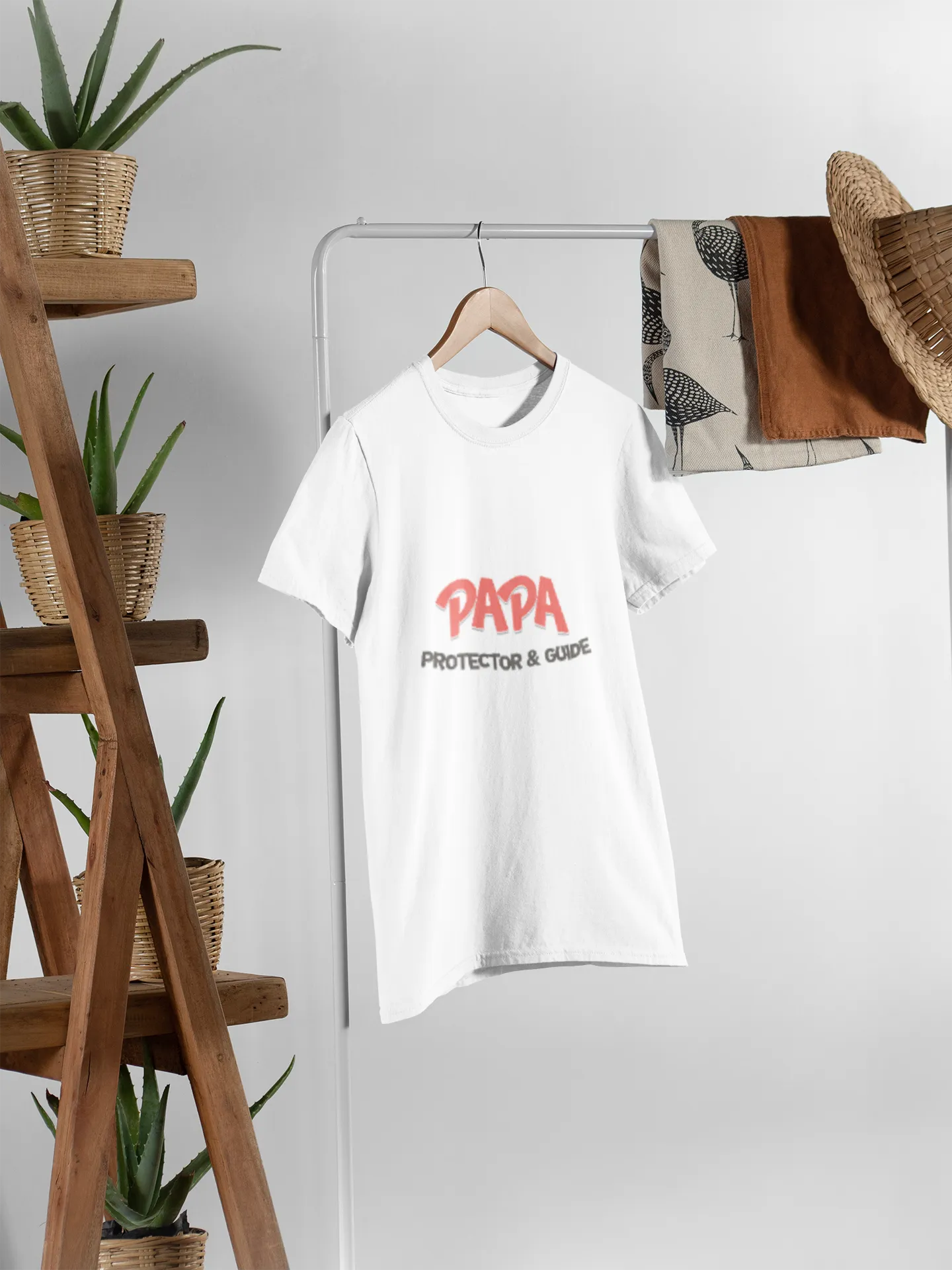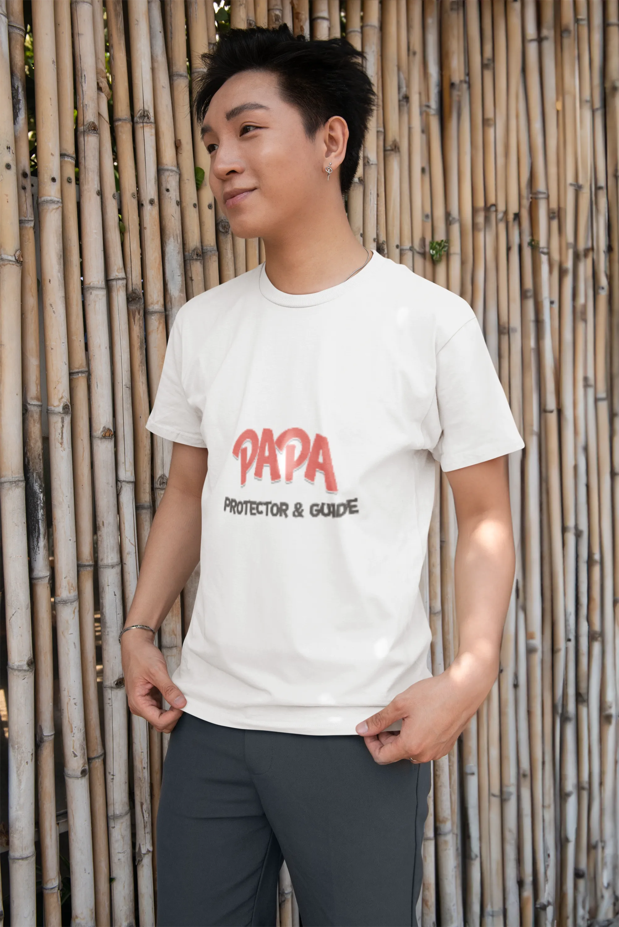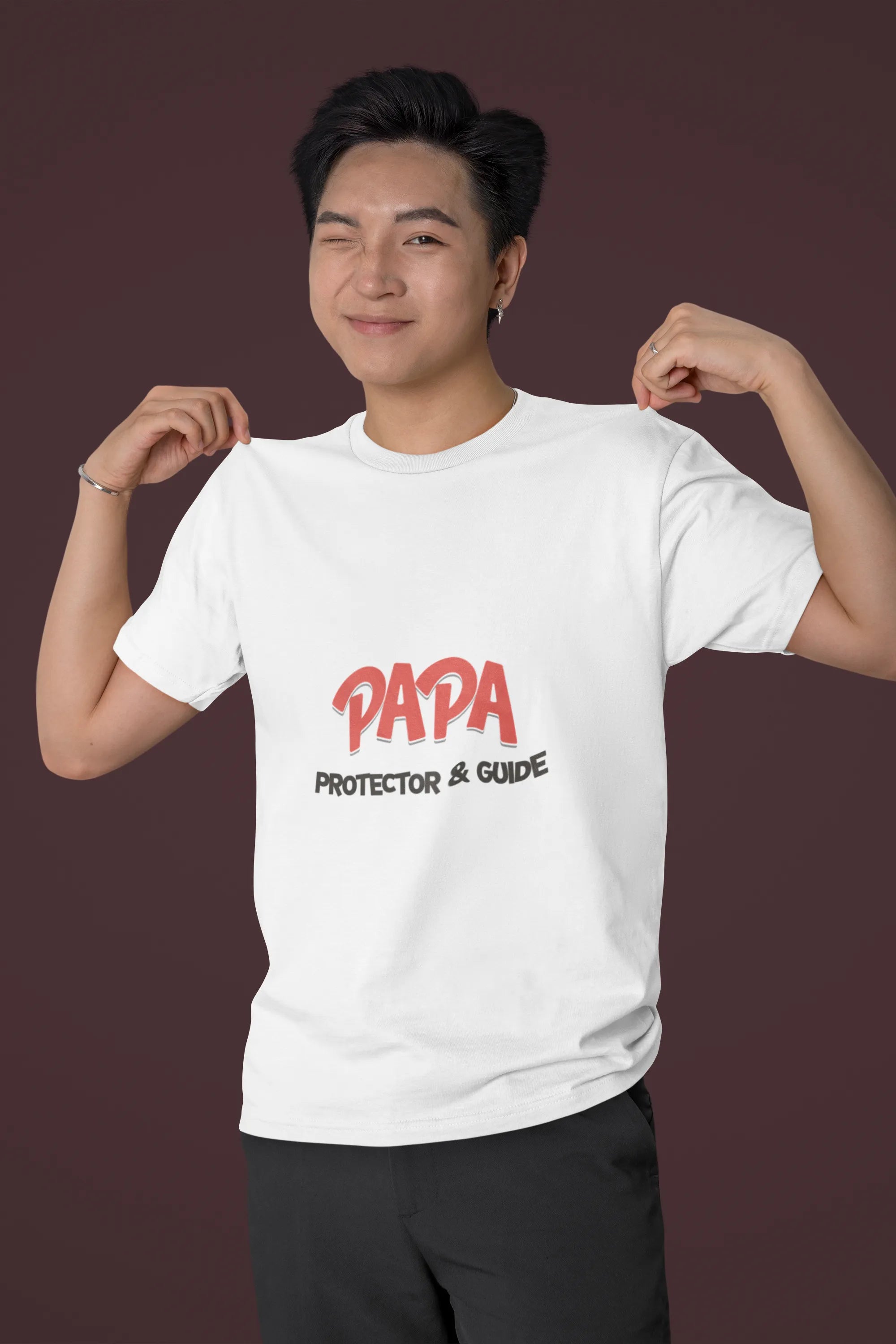 A bold and heartwarming T-shirt design featuring "Papa: Protector & Guide" in stylish typography. The design includes a strong father figure silhouette shielding a child, symbolizing love, strength, and guidance. Subtle elements like stars or a shield enhance the protective theme.