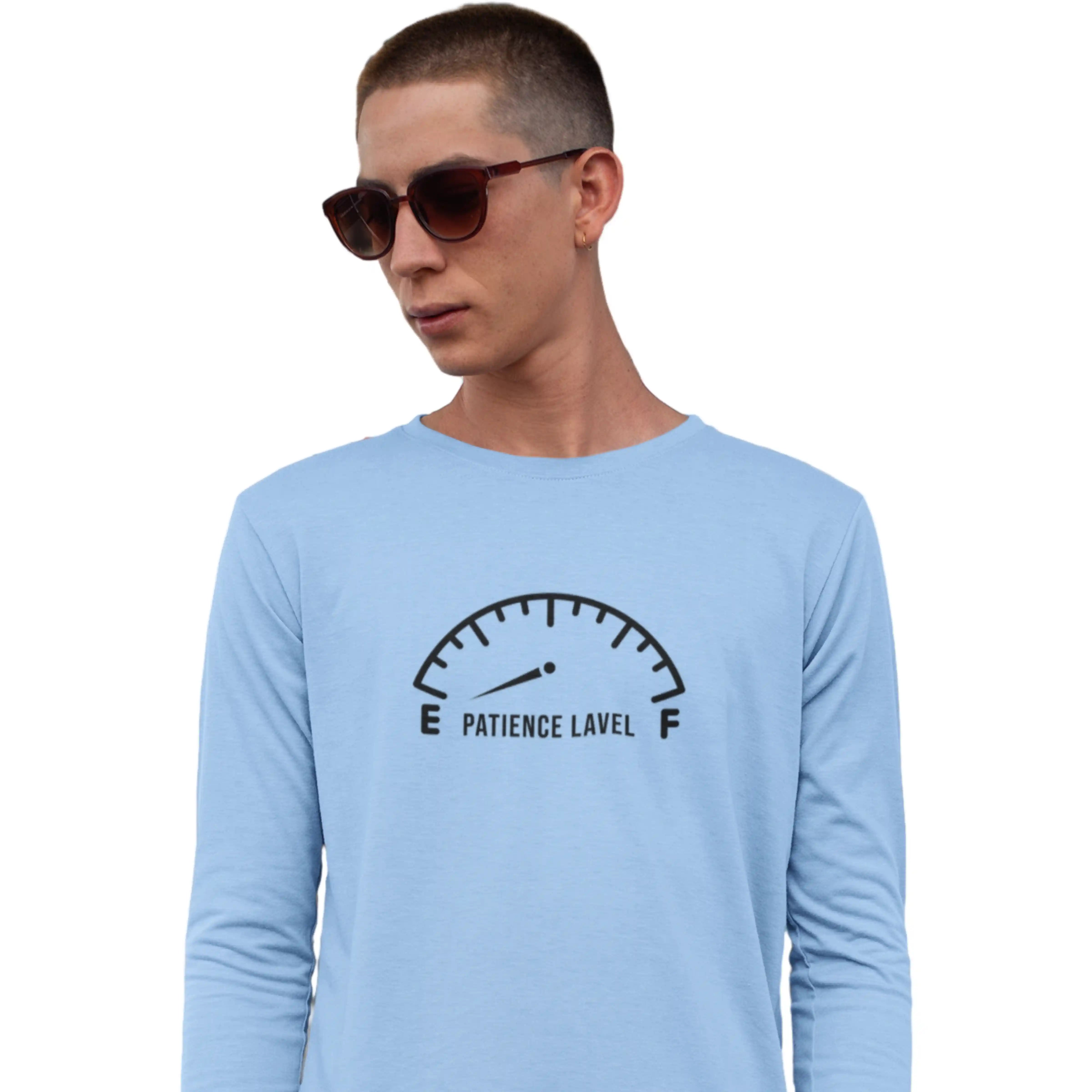 Stay cool and composed with this baby blue full-sleeve T-shirt featuring a witty “Patience Level” design. The round neck and regular fit make it perfect for casual wear with a fun personality.