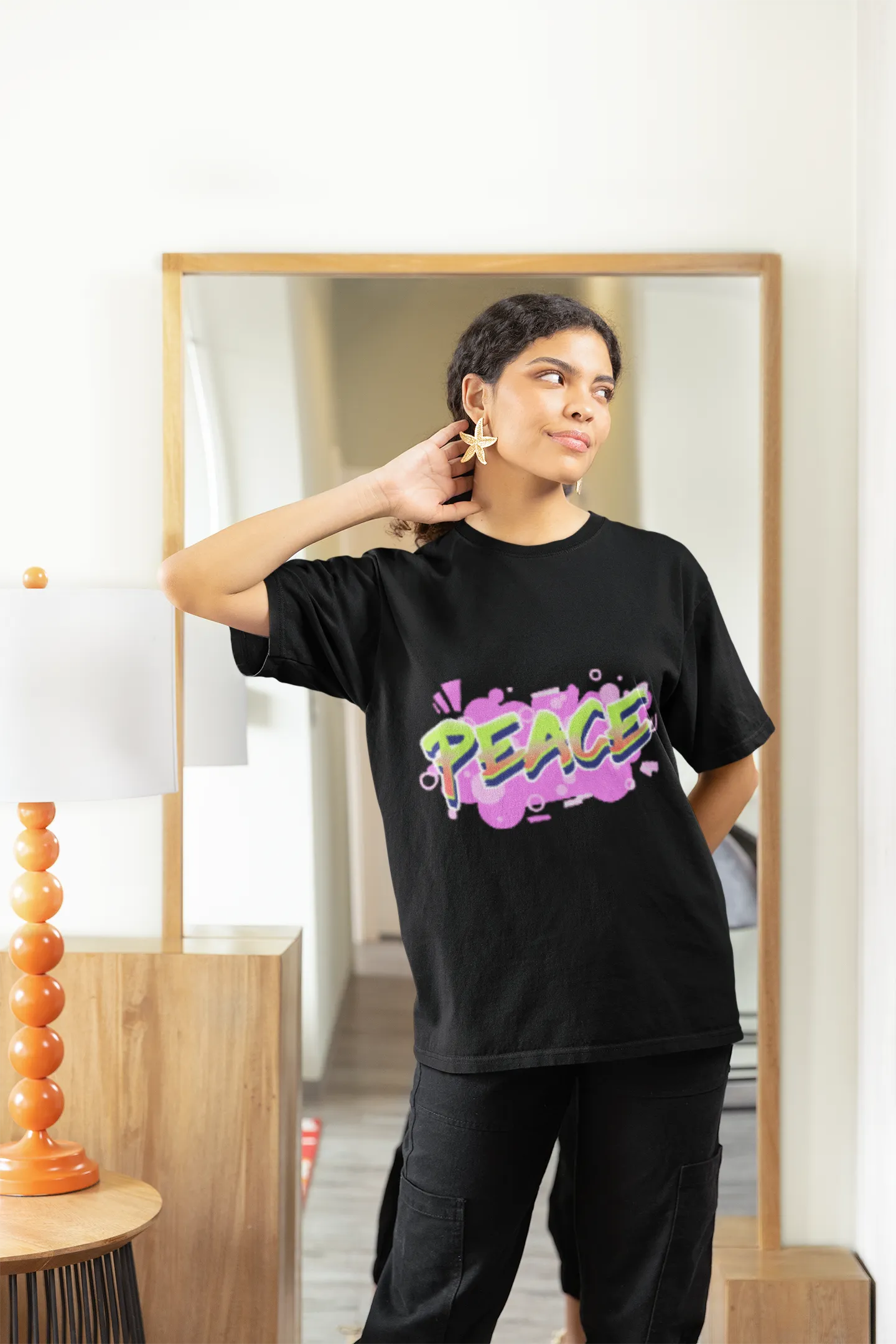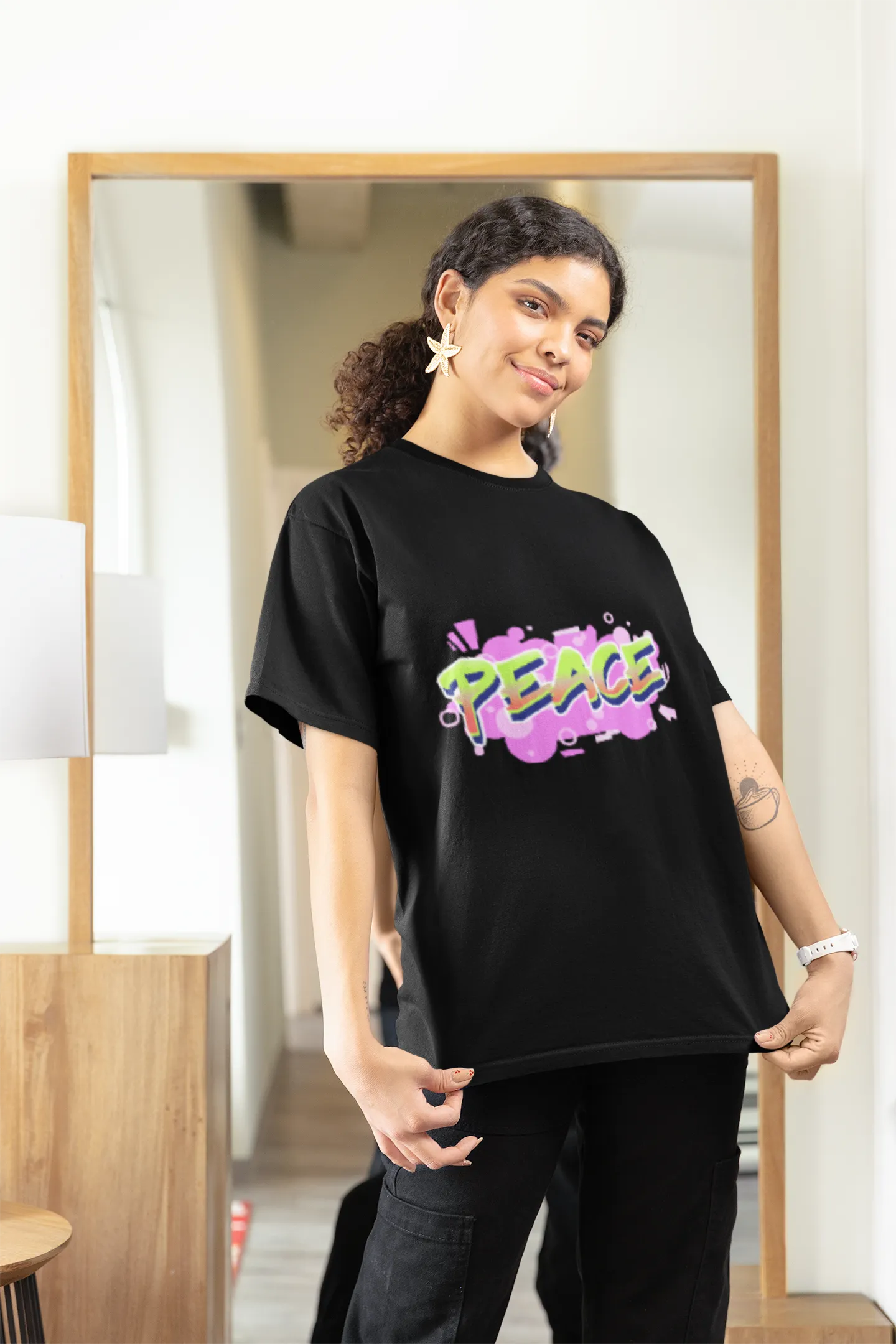 A calming and minimalist T-shirt design featuring the word “Peace” in clean, serene typography. Accented with symbols like a peace sign, dove, or soft earth tones, it embodies harmony, calm, and unity — perfect for spreading positive energy and a message of tranquility.