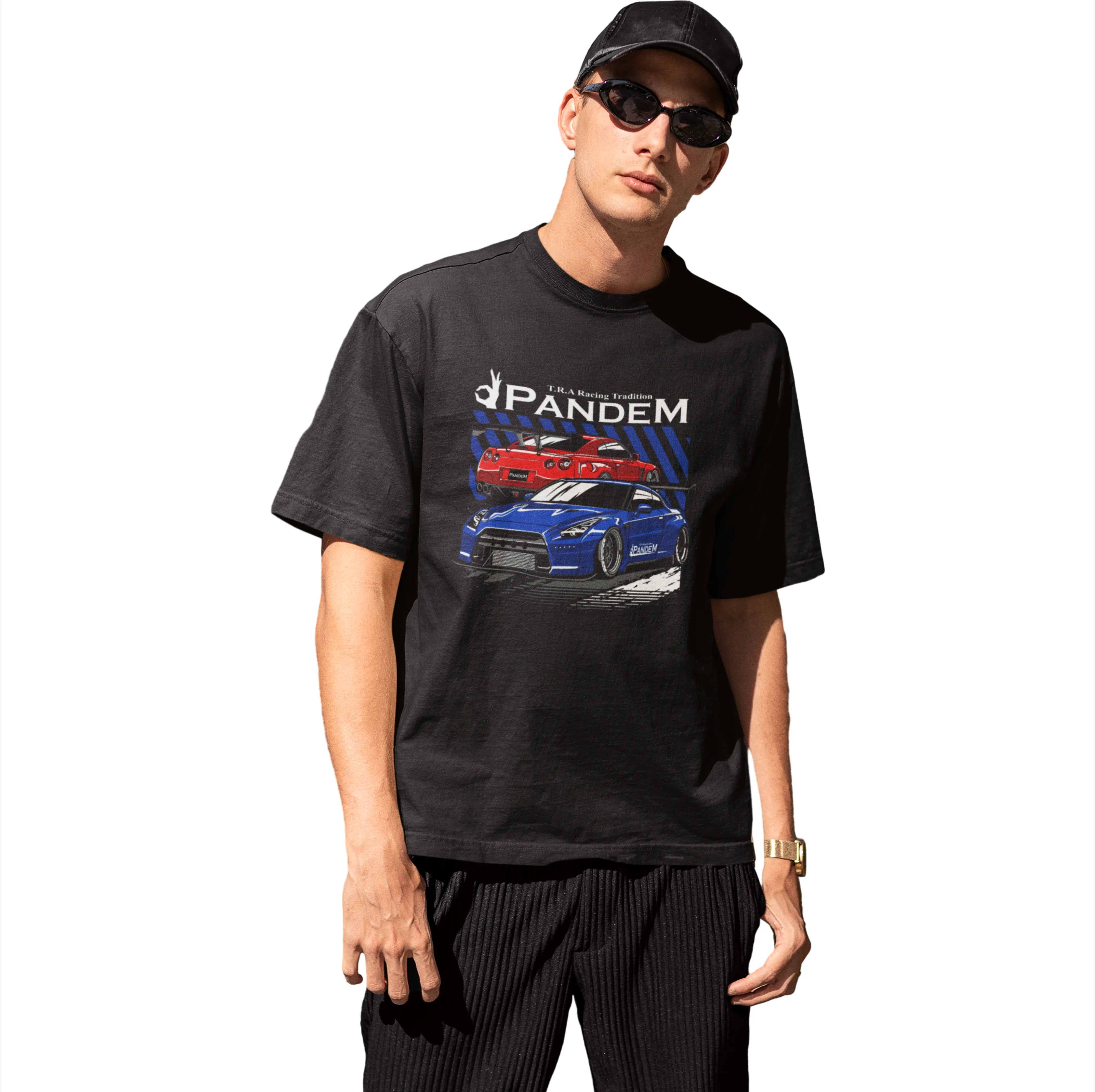 Man wearing a black t-shirt with a car graphic and 'PANDEM' branding on a white background