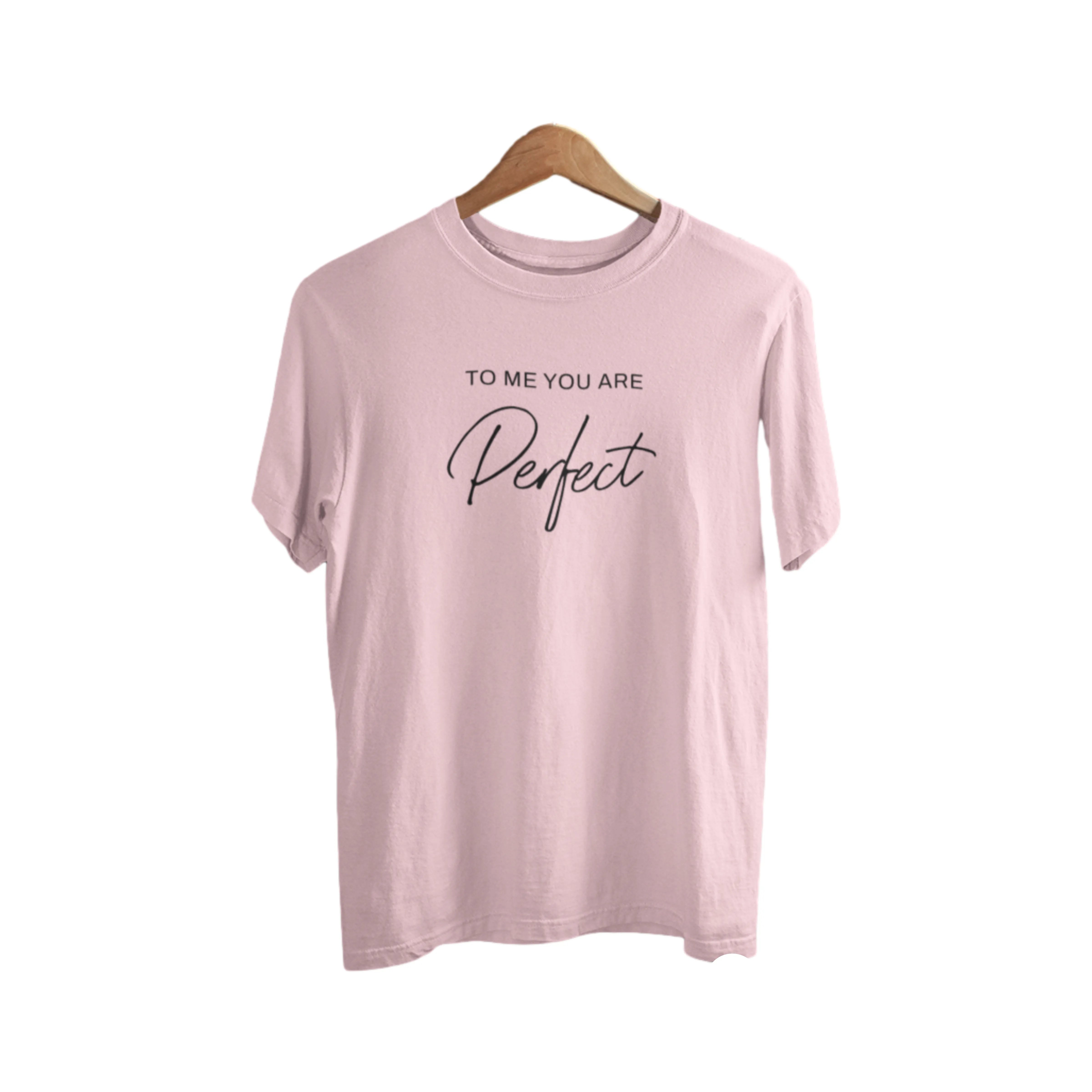 A light-pink t-shirt with the word “Perfect” in a soft, confident style. With a round neck and regular fit, it’s cozy, chic, and made for those who embrace self-love and effortless elegance.