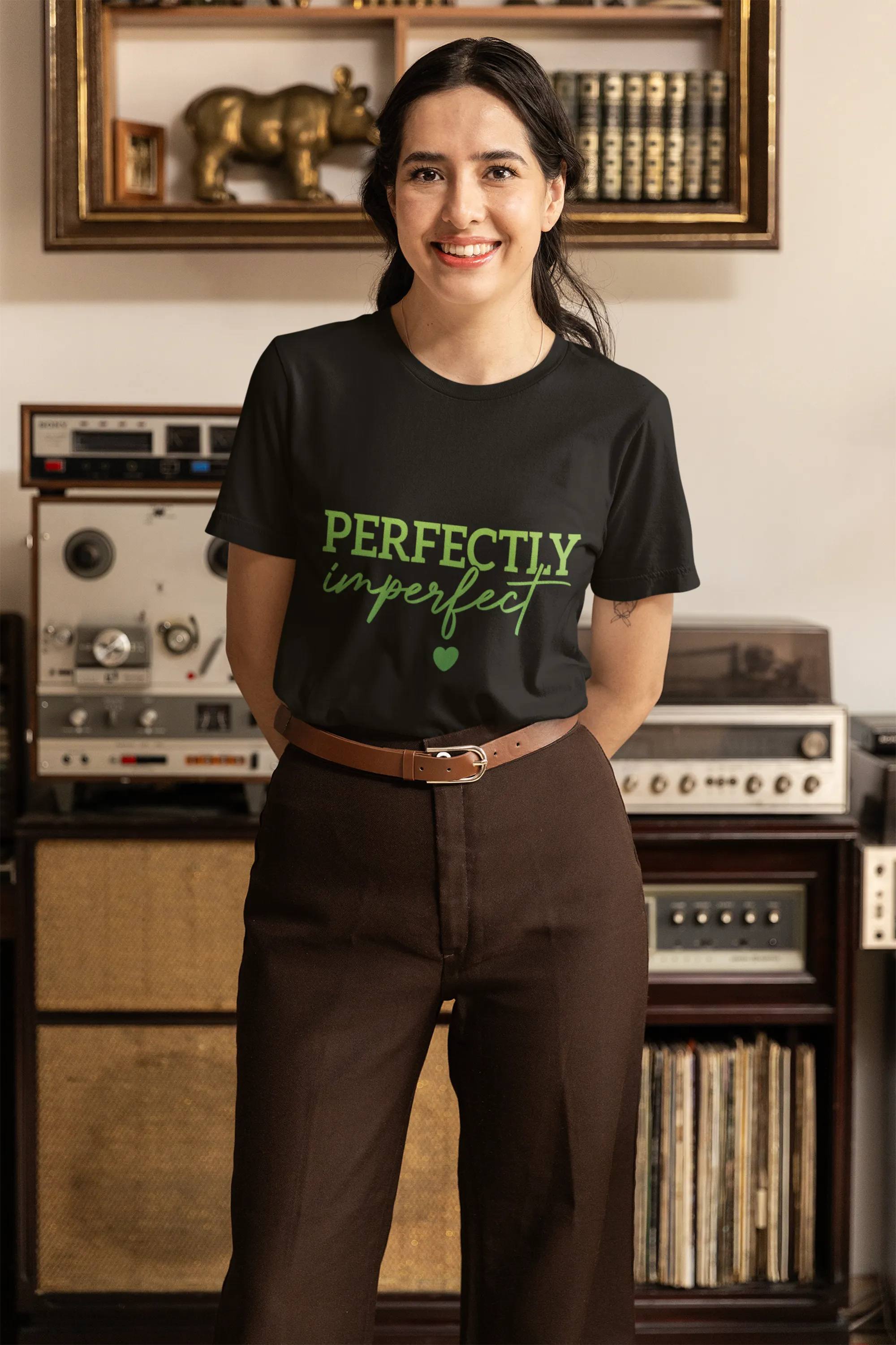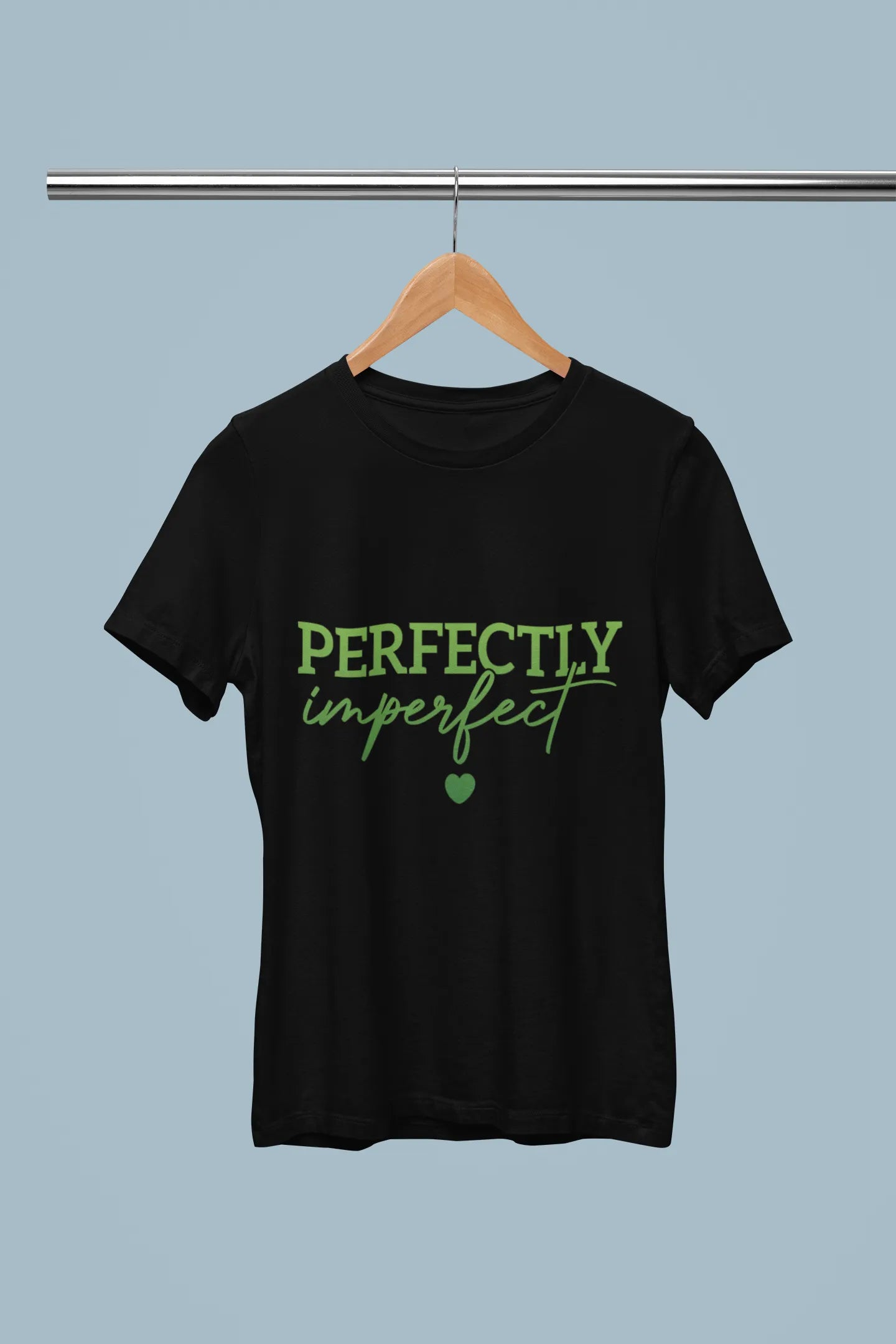 A stylish T-shirt design featuring the phrase "Perfectly Imperfect" in an artistic blend of elegant script and bold typography. The design embraces self-acceptance, with subtle distressed effects or asymmetric lettering to highlight the beauty of imperfection, making it both trendy and inspiring.