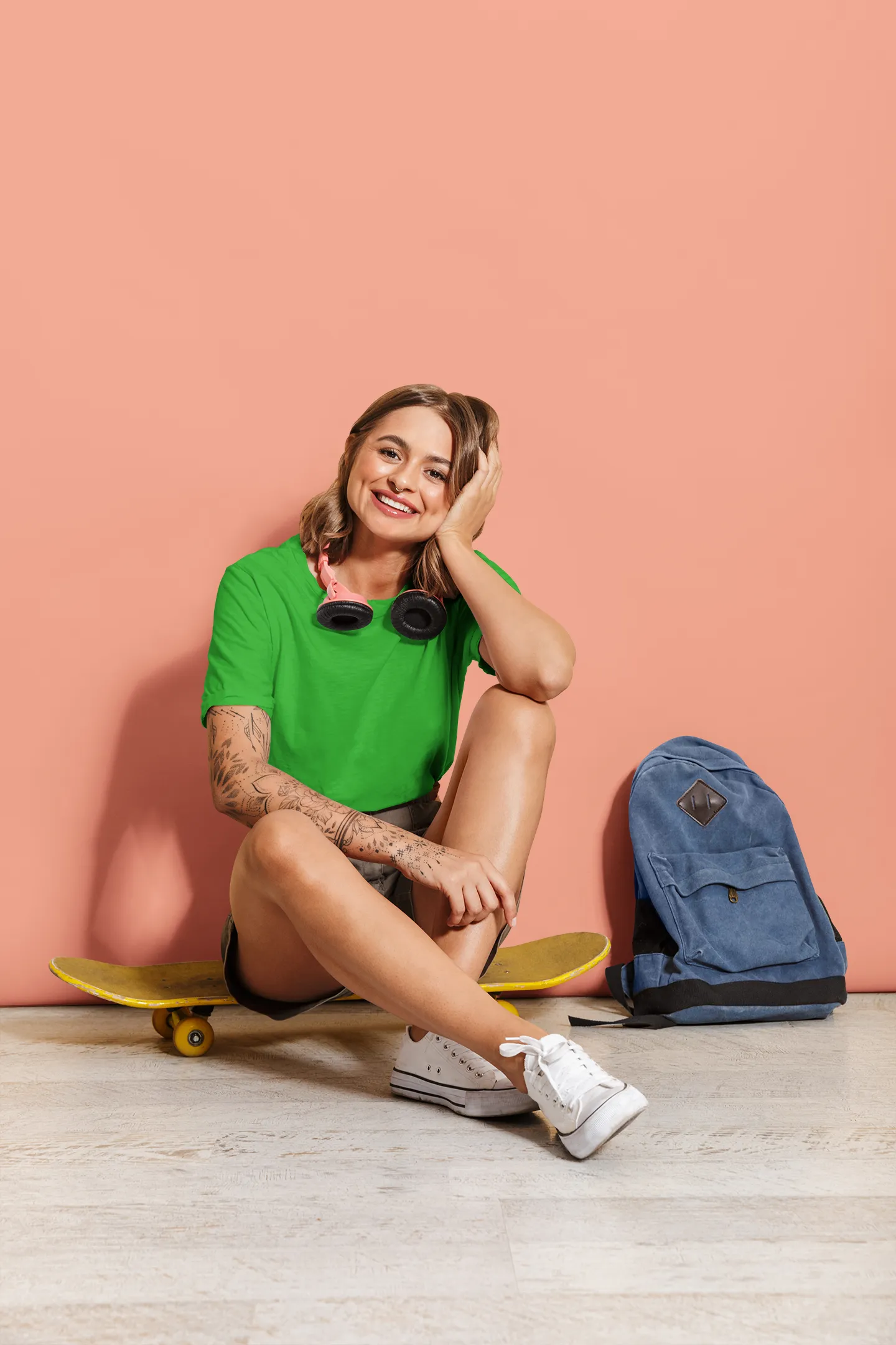 Woman in green shirt sitting on a skateboard with a purple background