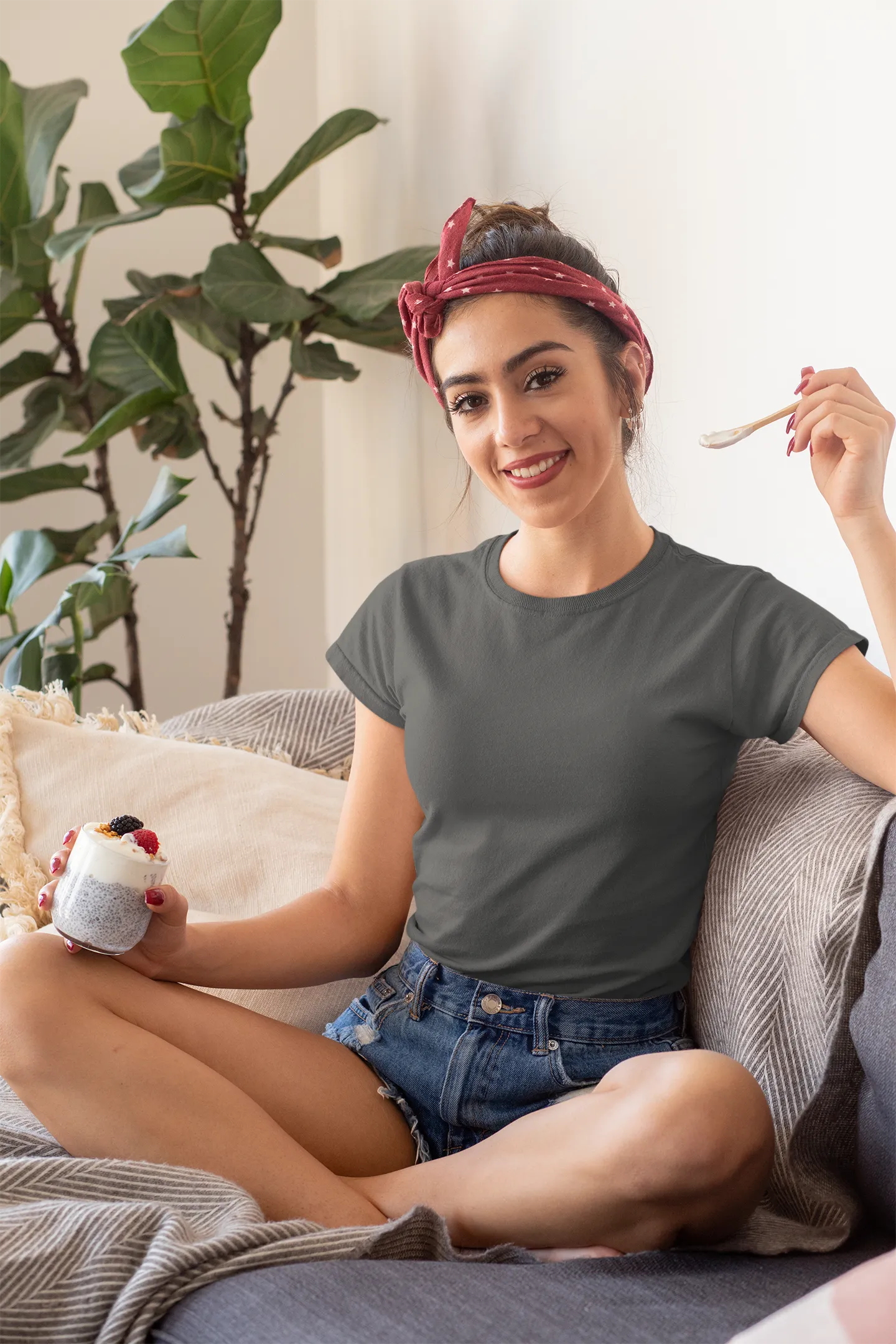 Woman sitting on a couch holding a mug and a cigarette, with plants around her.