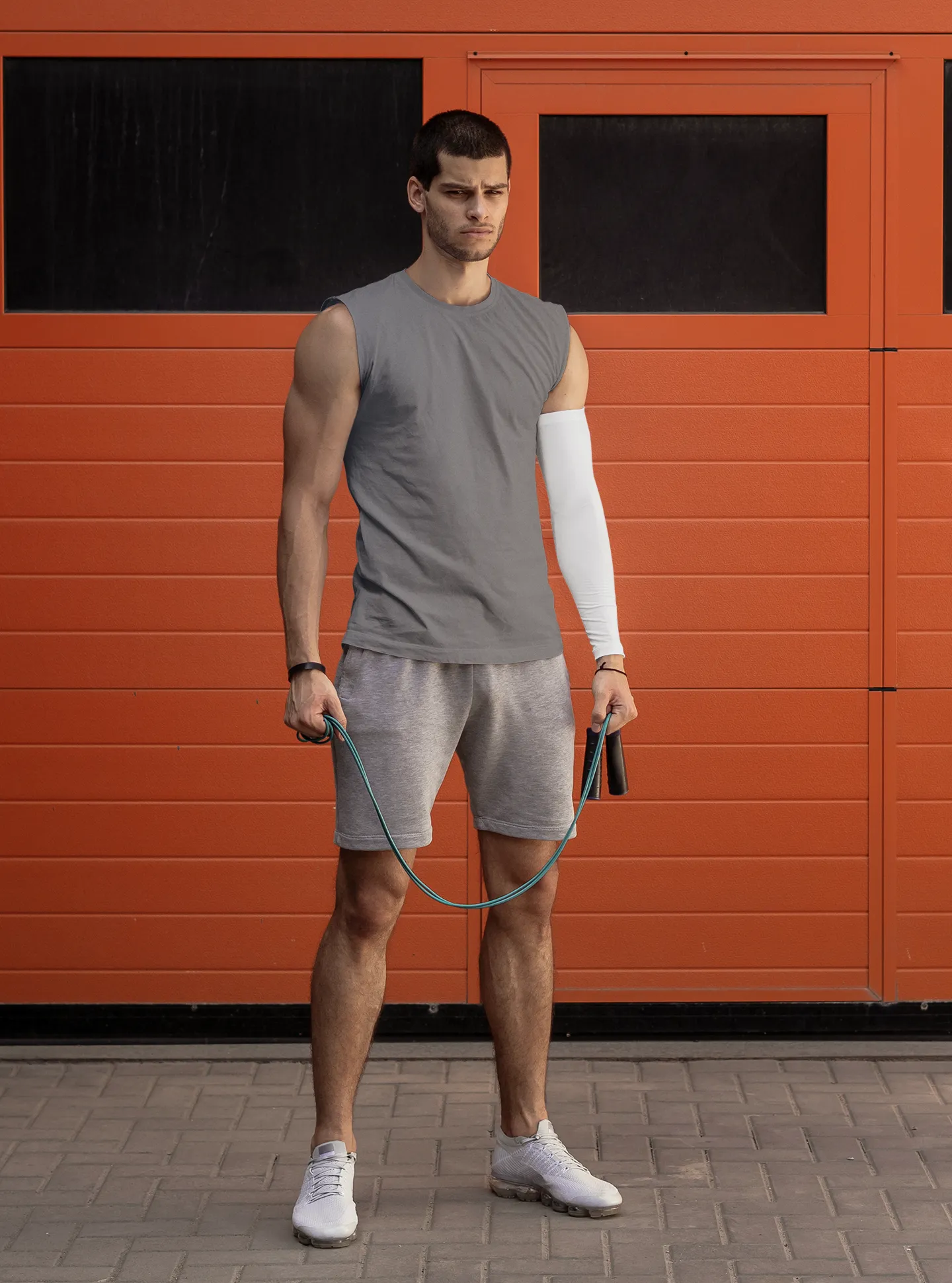 Man holding a jump rope in front of an orange wall