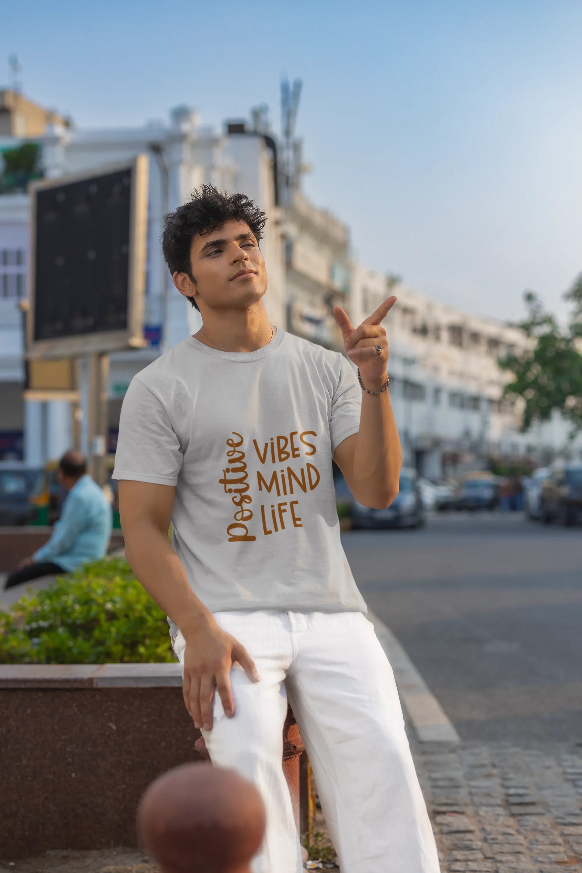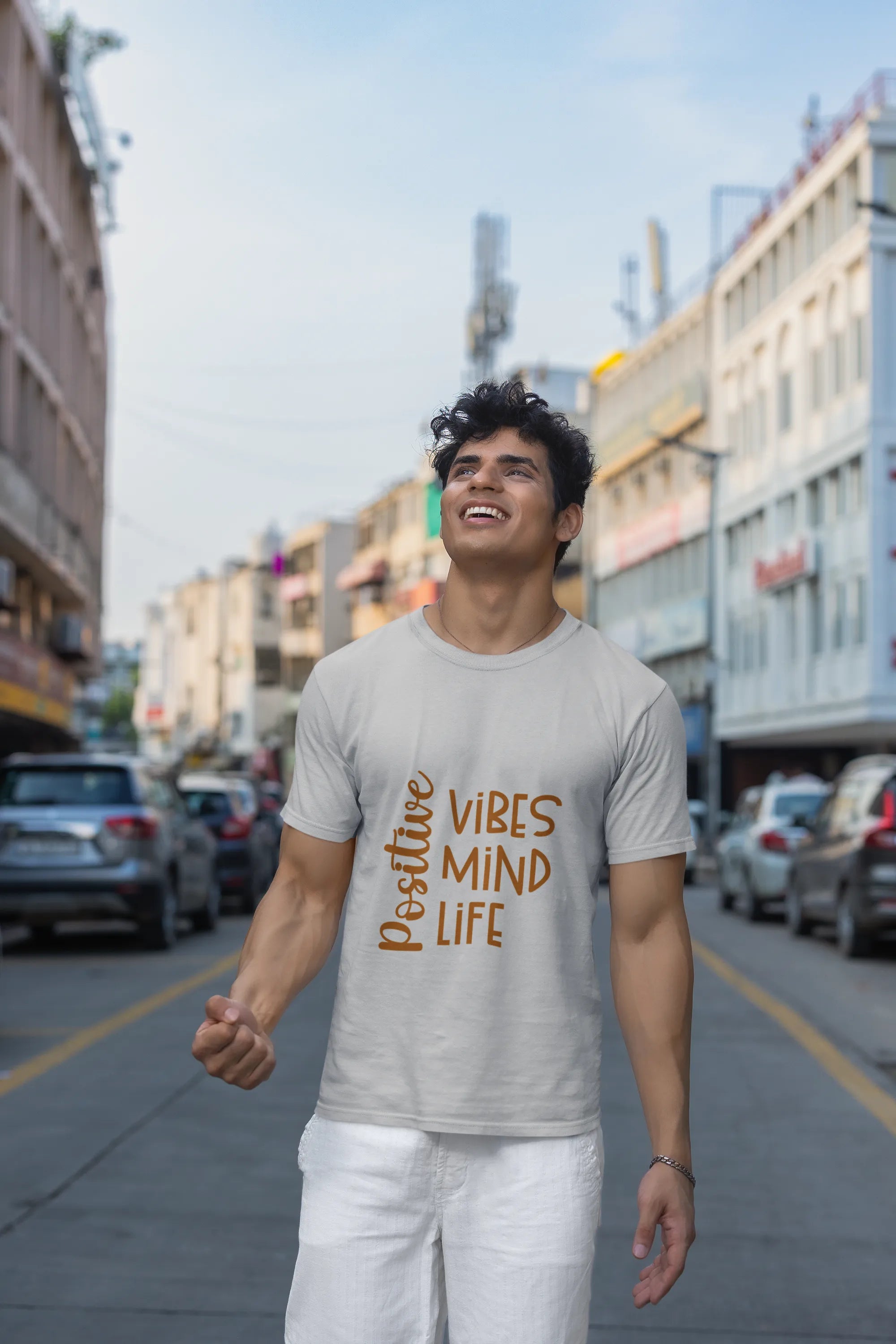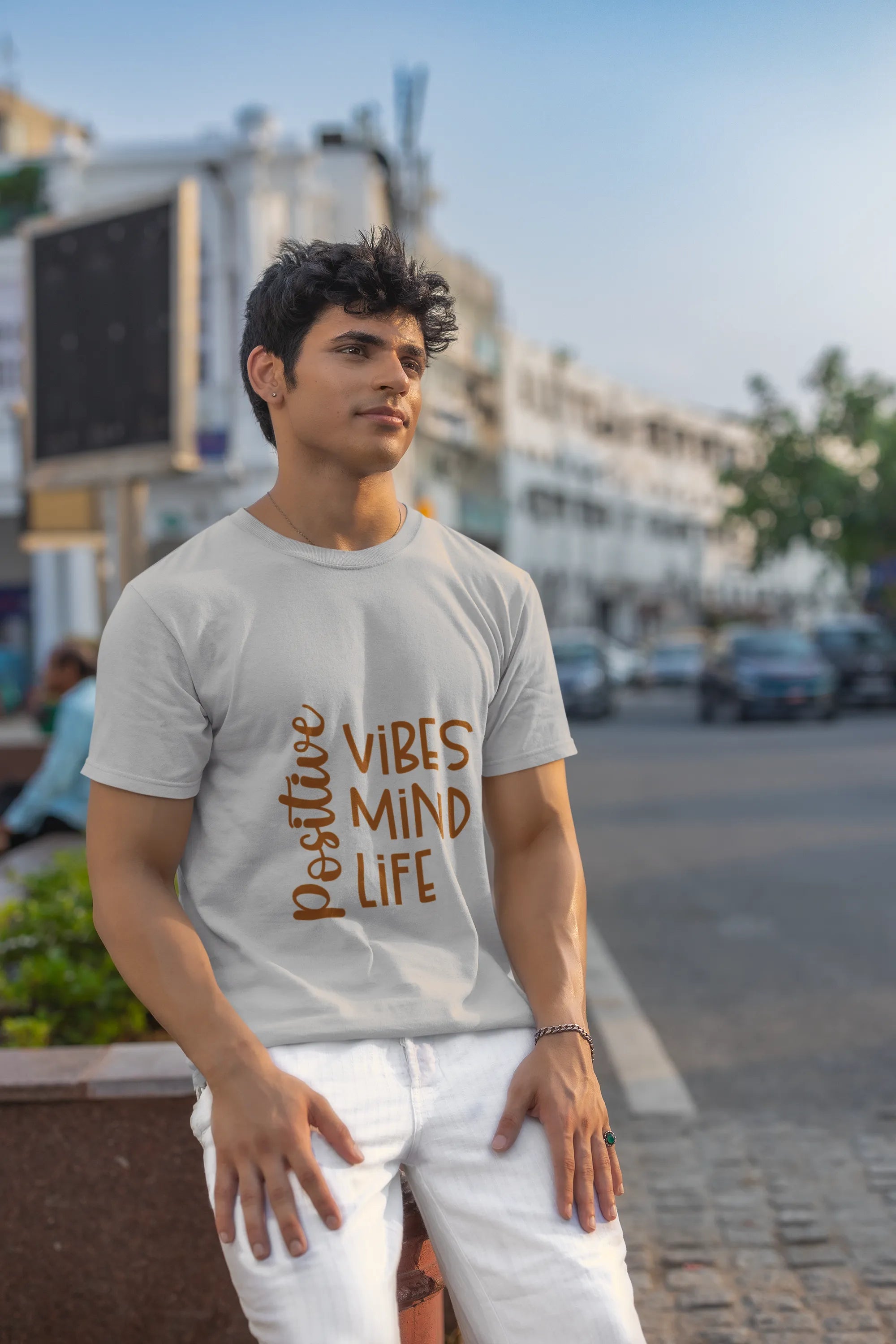 Man wearing a t-shirt with 'Positive Vibes Mind Life' on a city street.