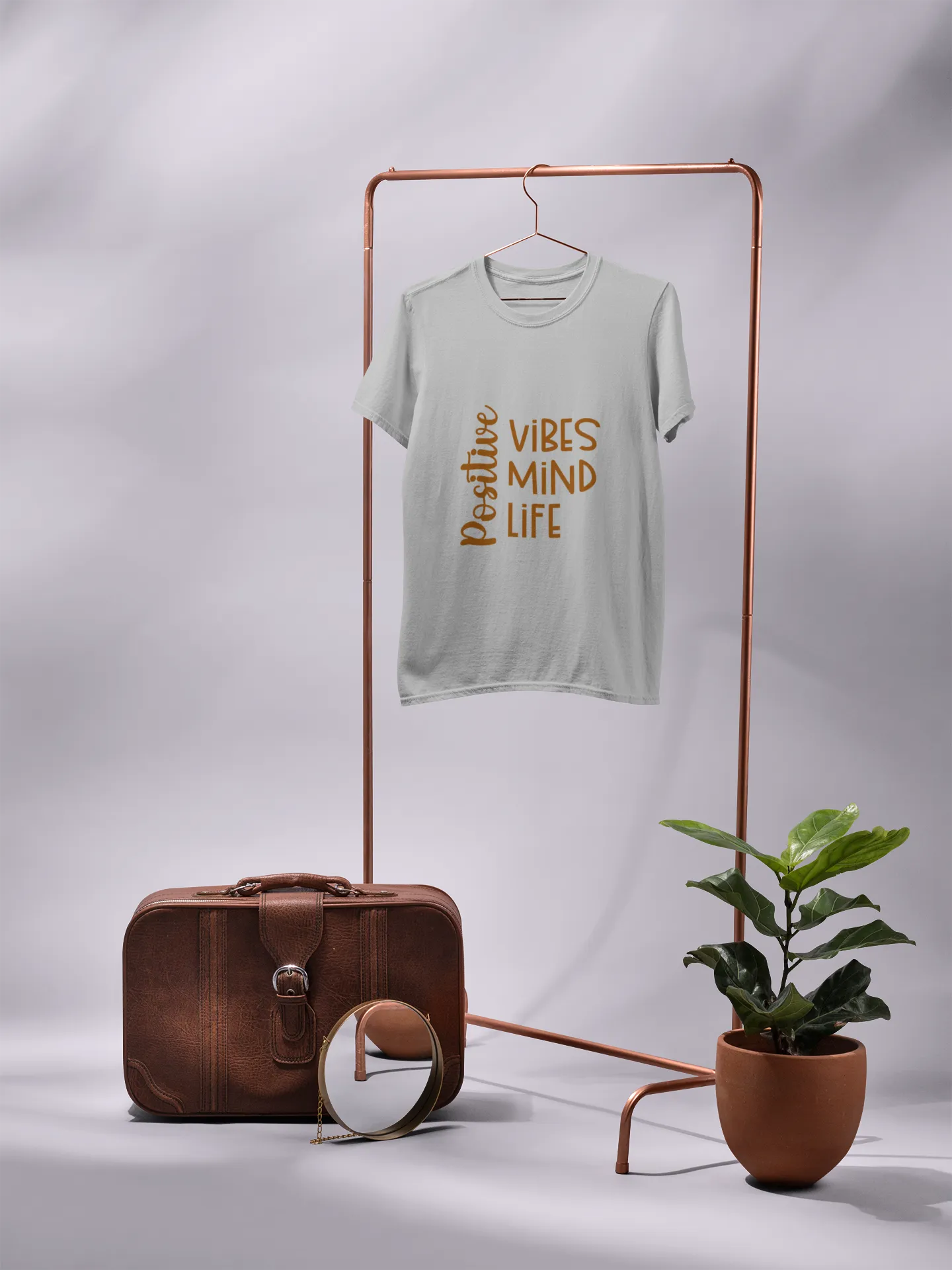 A stylish t-shirt design featuring "Positive Mind, Vibes, Life" in bold, uplifting typography. Vibrant colors and dynamic elements symbolize optimism, energy, and growth. Perfect for spreading good vibes, staying motivated, and embracing a positive lifestyle with every wear!