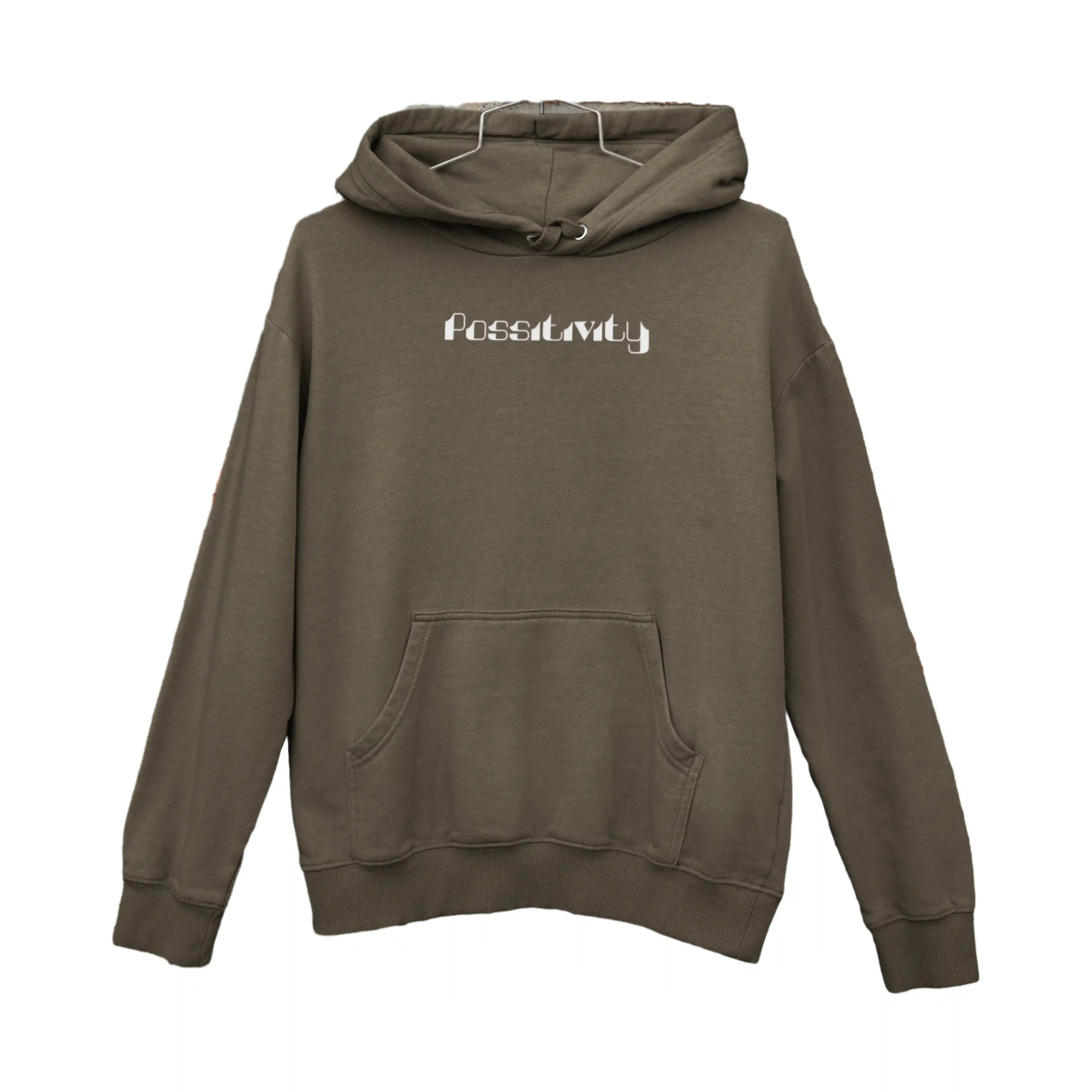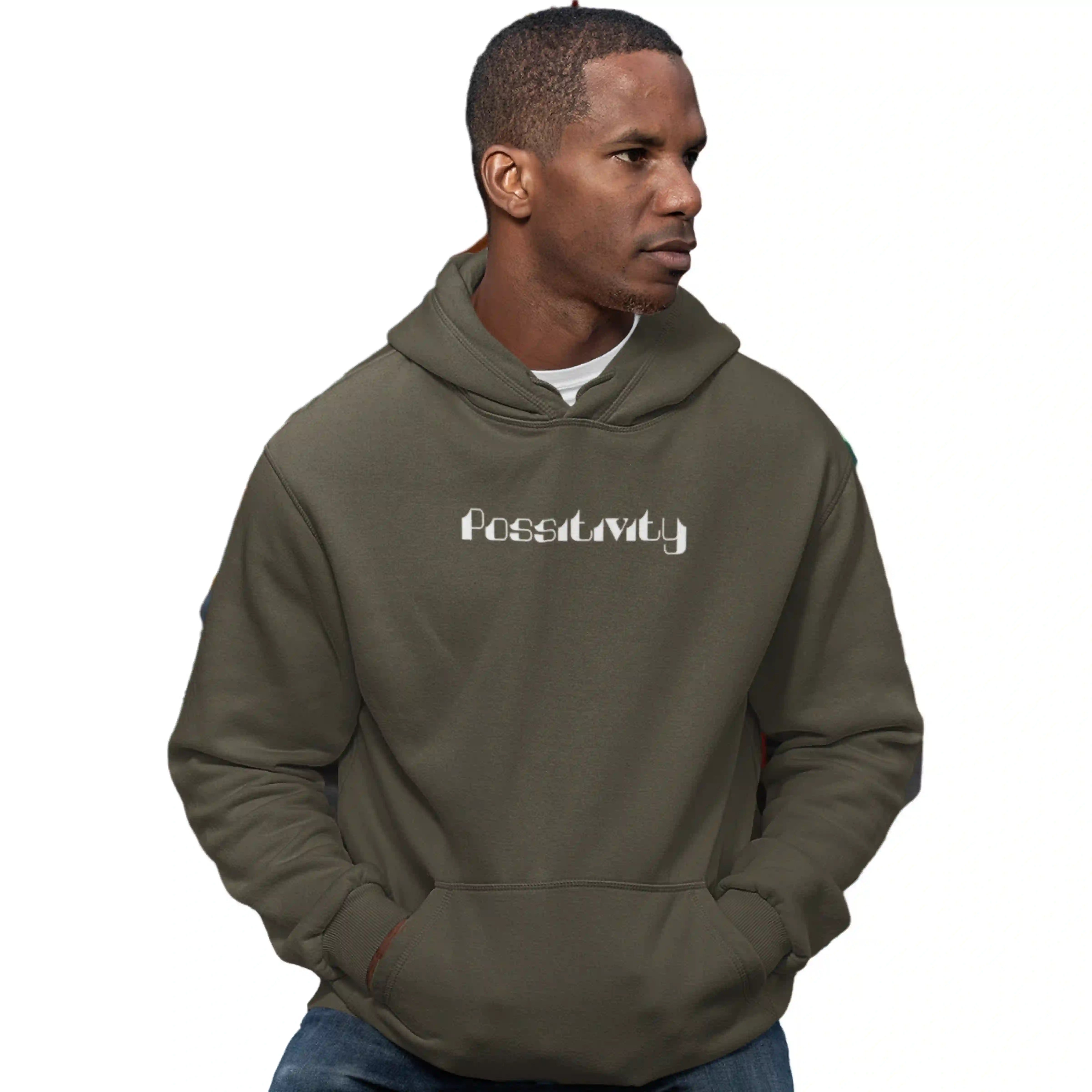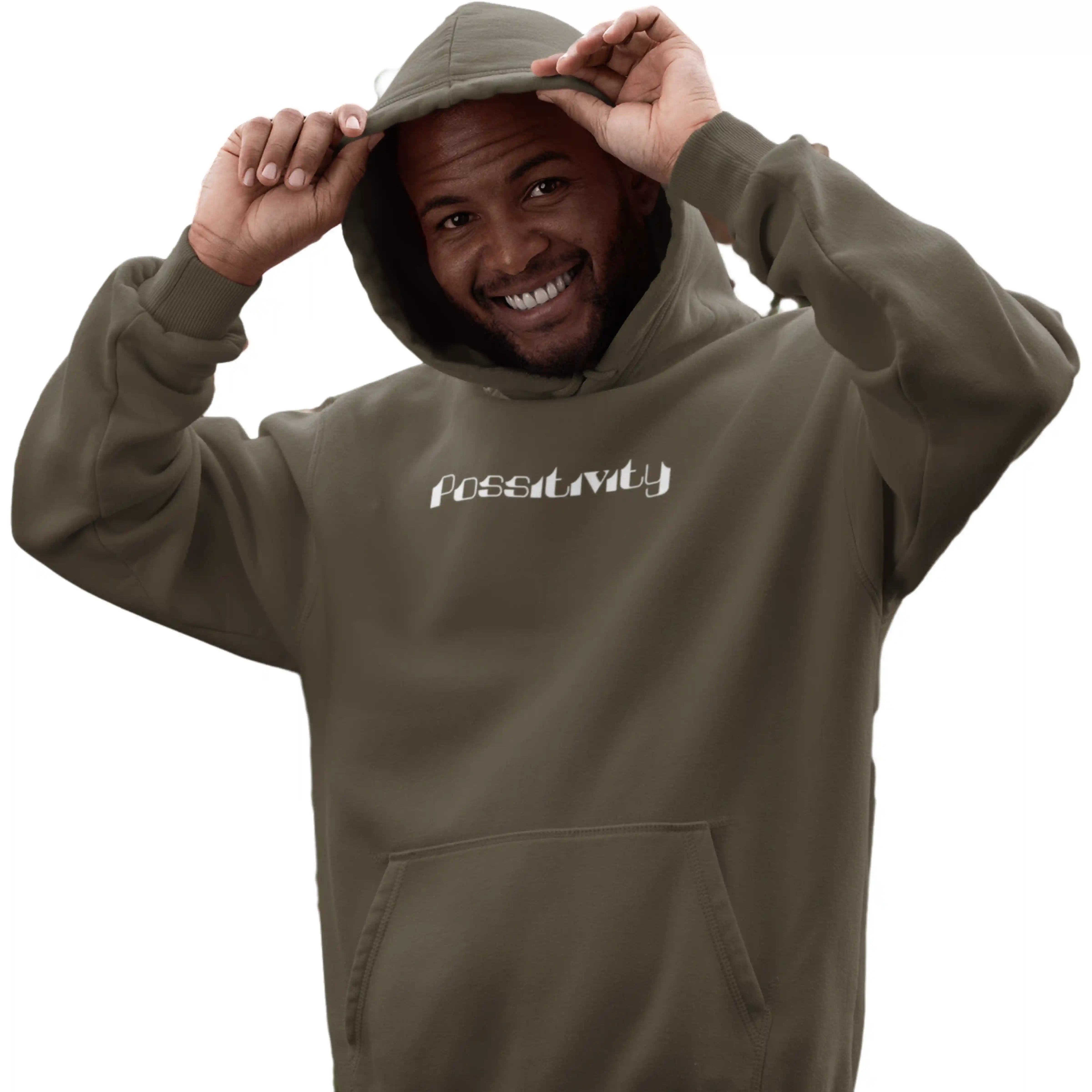 Man wearing a brown hoodie with 'Positivity' text on a white background