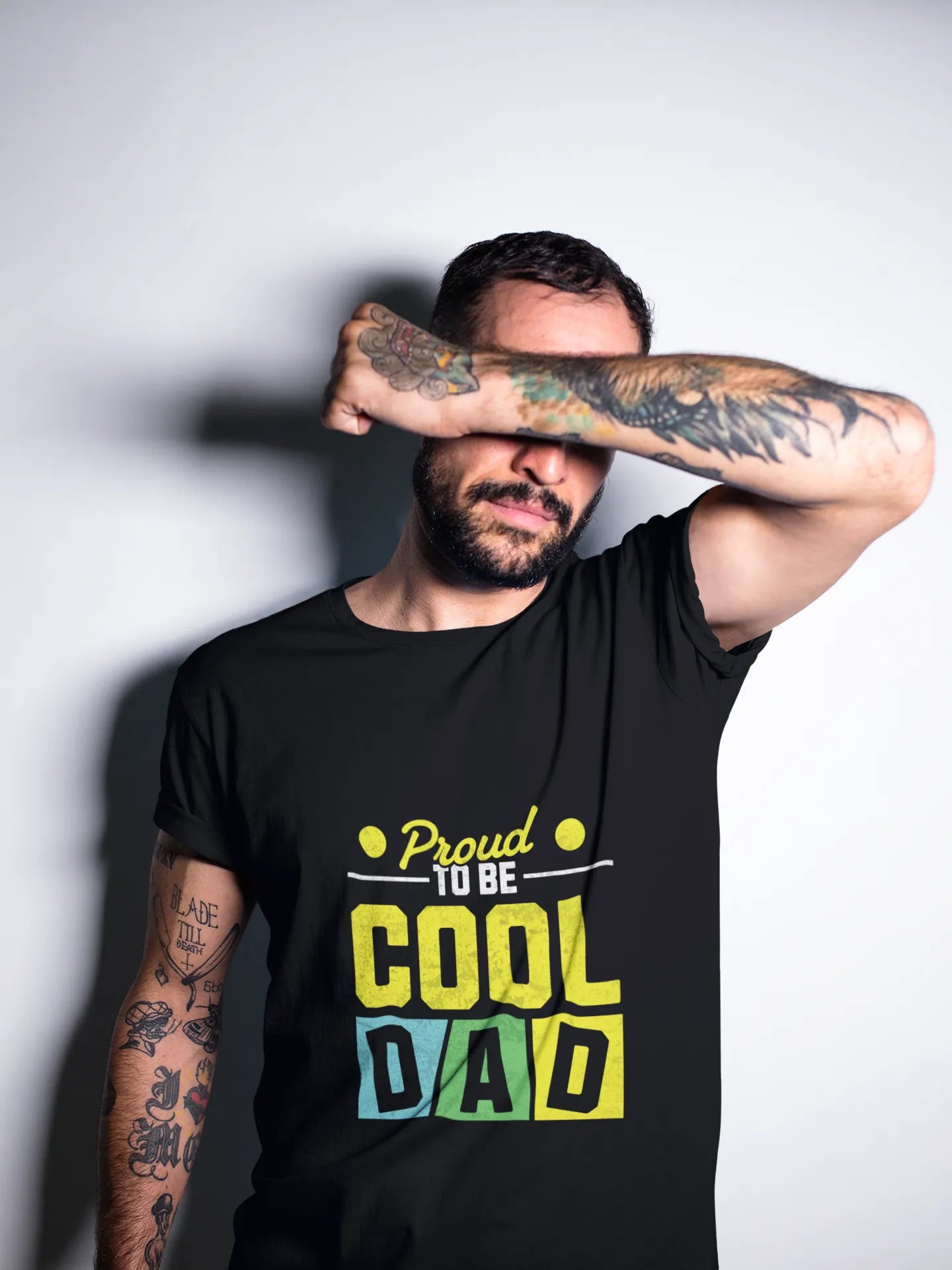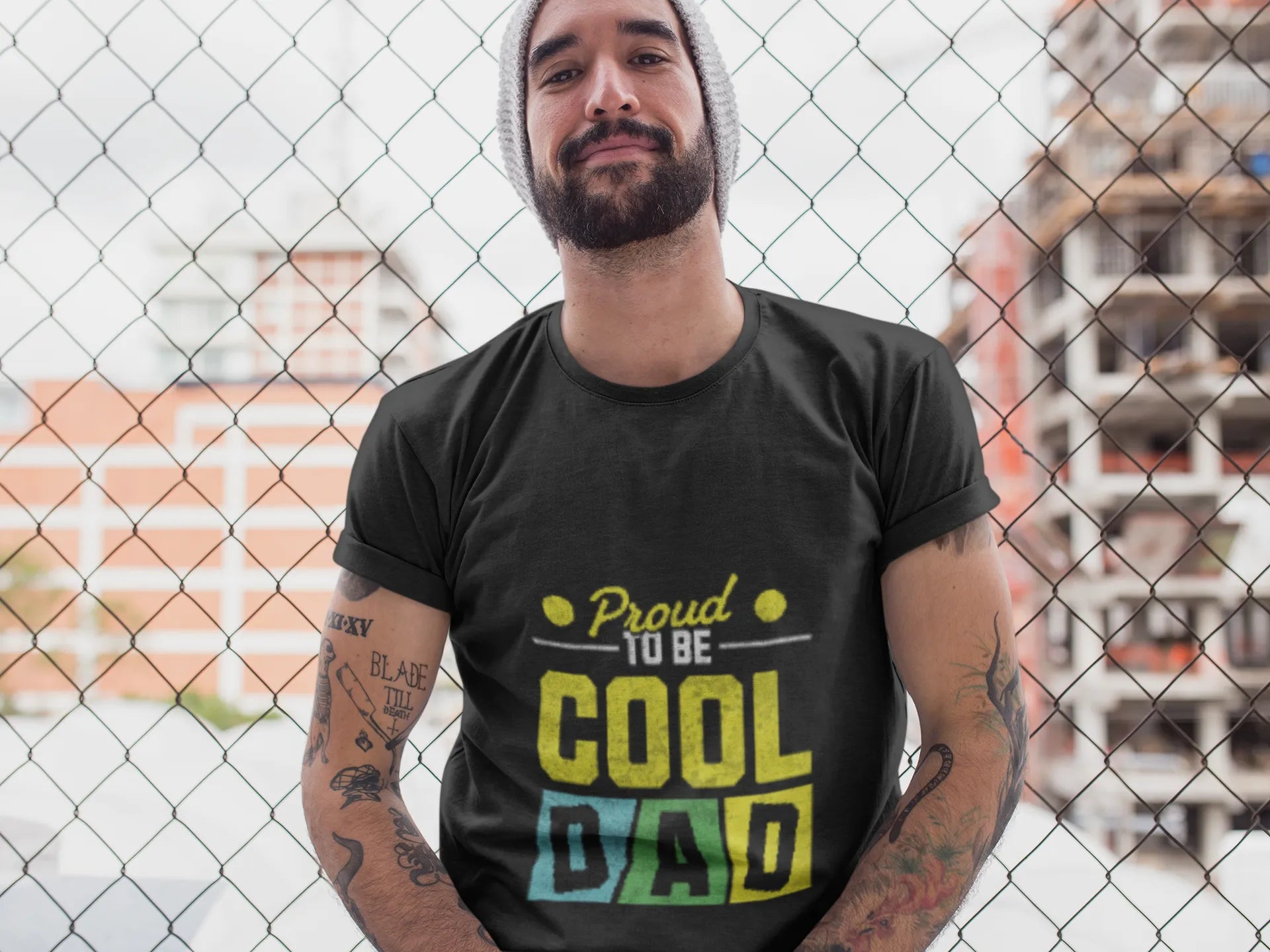 A trendy T-shirt design featuring the bold phrase "Proud to Be a Cool Dad" in a stylish, modern font. The design includes a mix of playful and sleek elements, like sunglasses, a mustache, or lightning bolts, giving it a fun yet confident vibe.