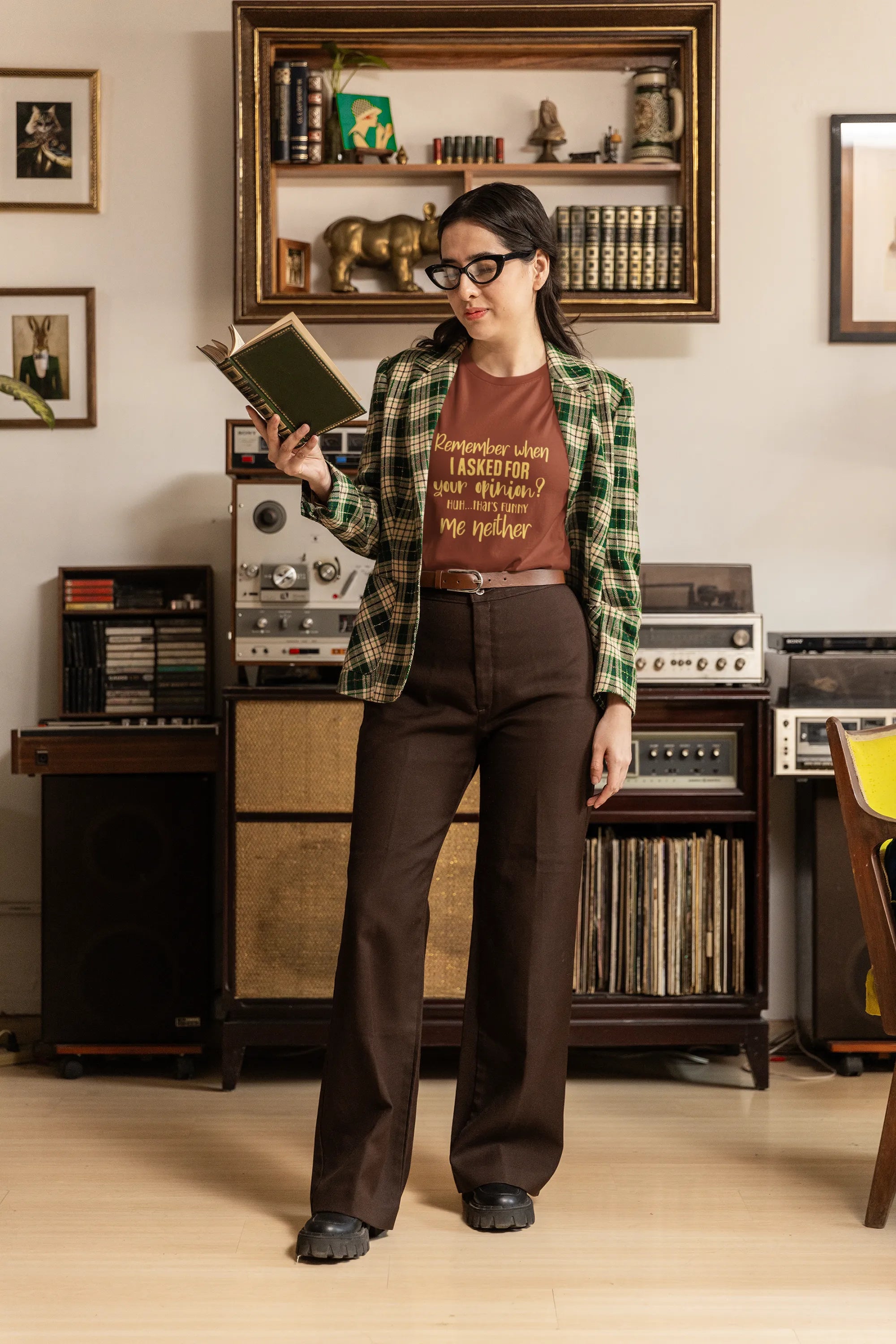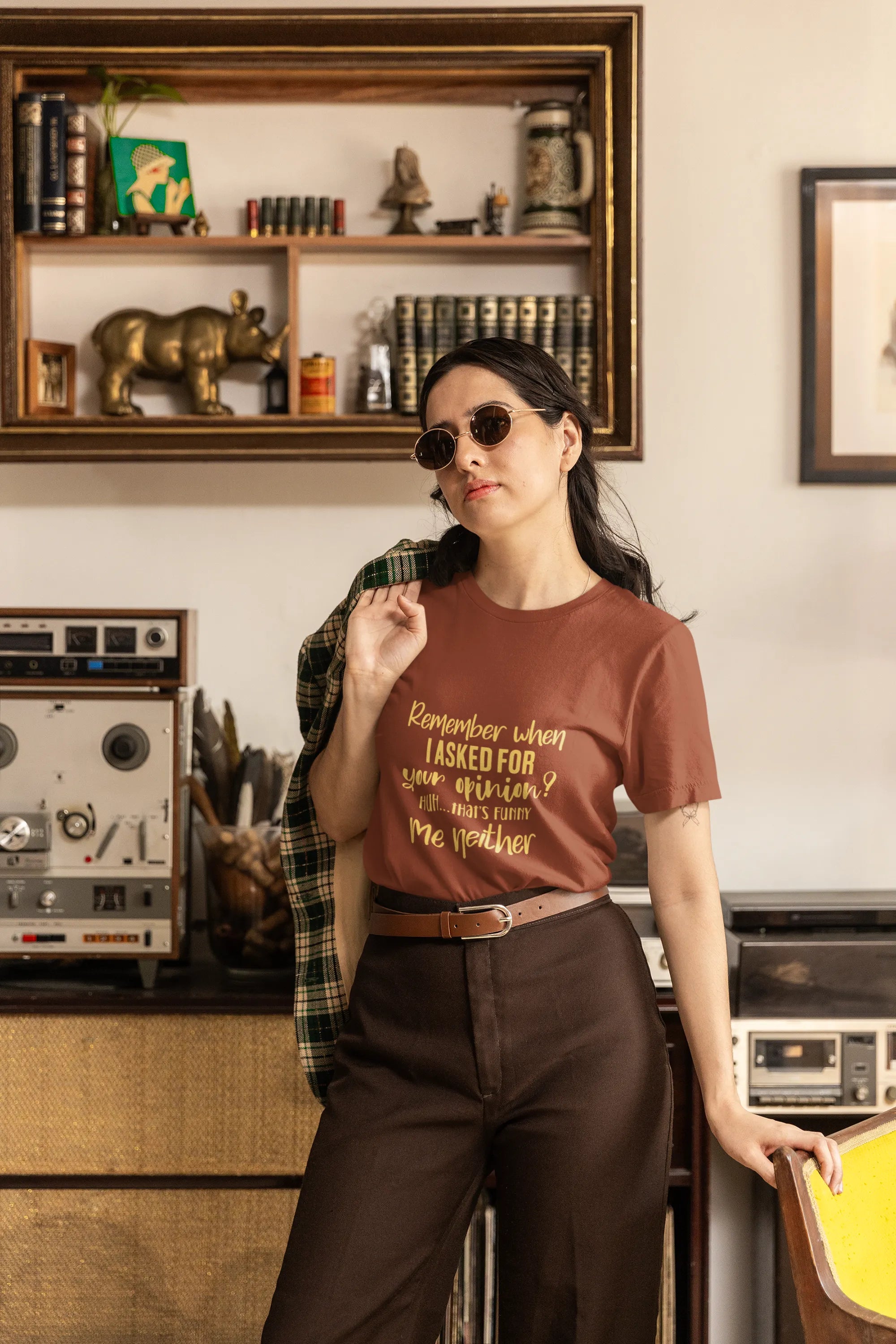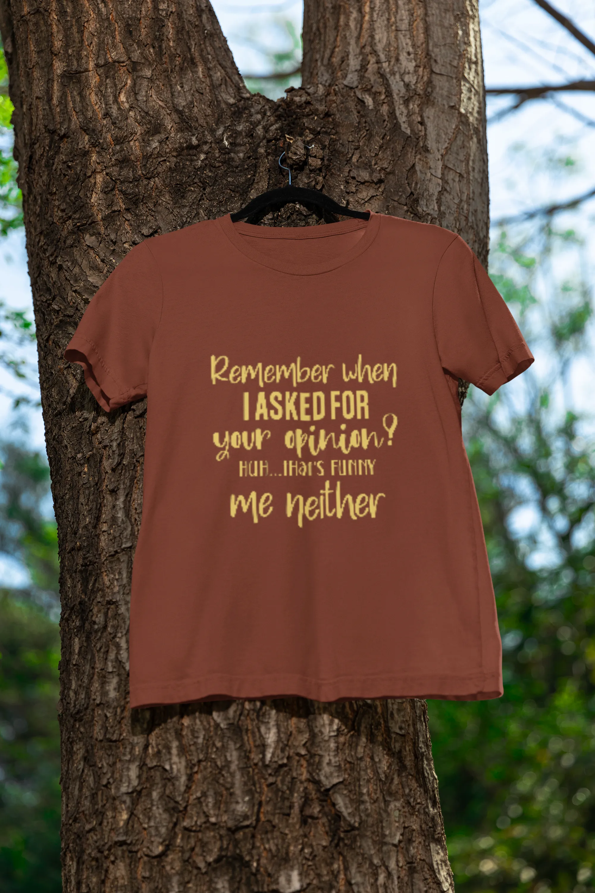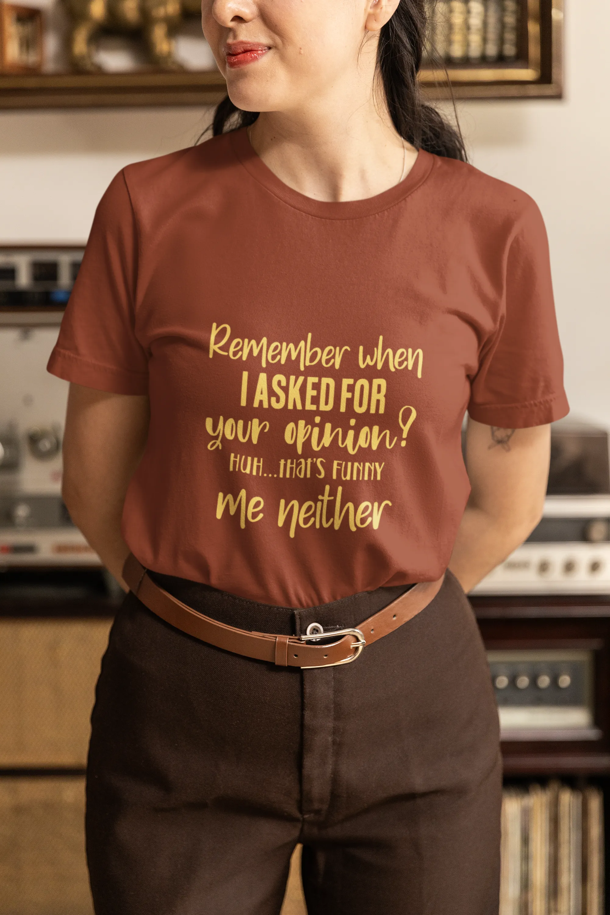 A minimalist white T-shirt featuring the phrase “Remember when I asked for your opinion?” in bold black font. The design delivers a playful, sarcastic vibe—perfect for making a statement with humor and confidence in everyday casual wear.
