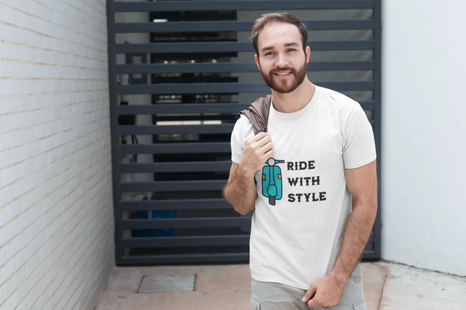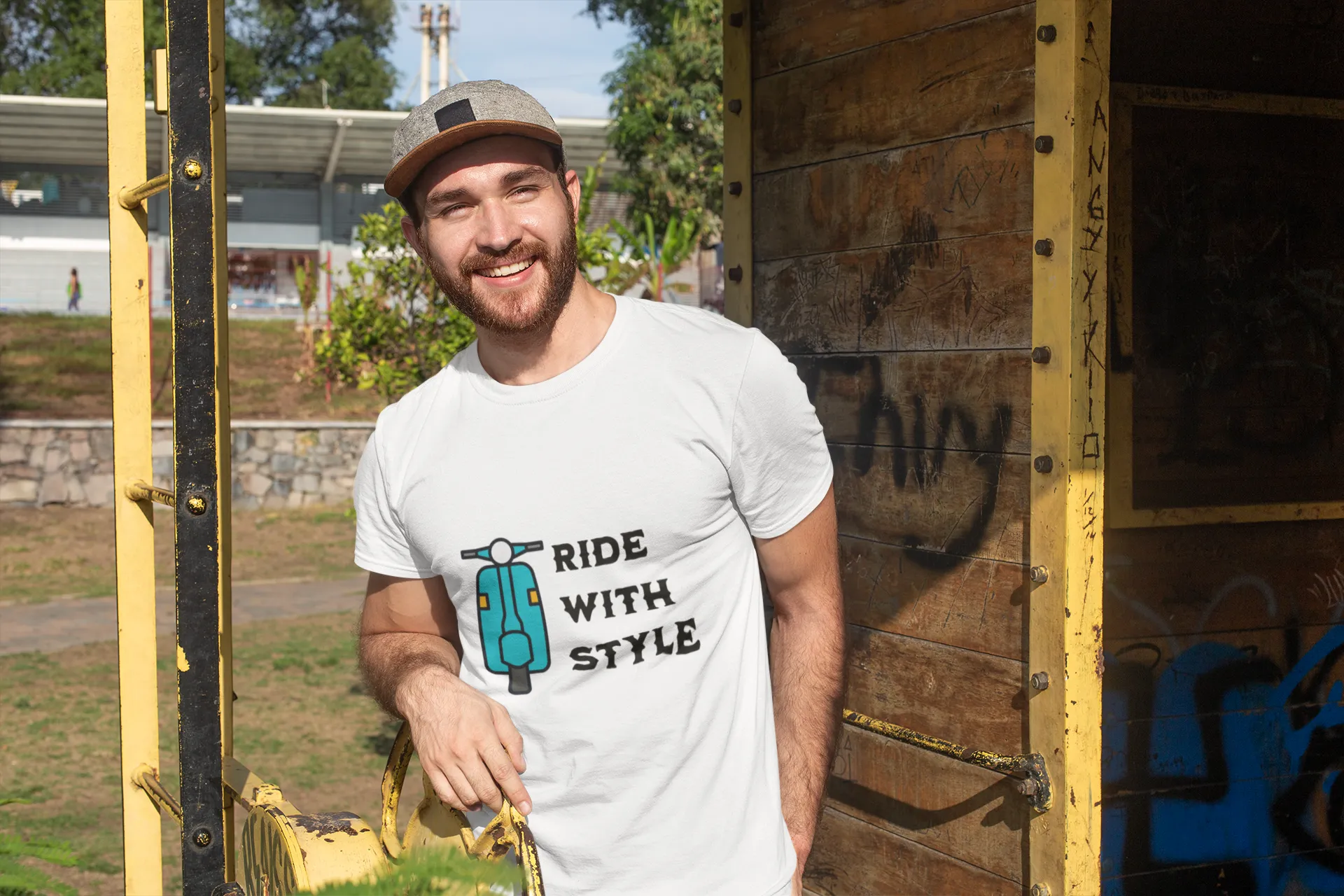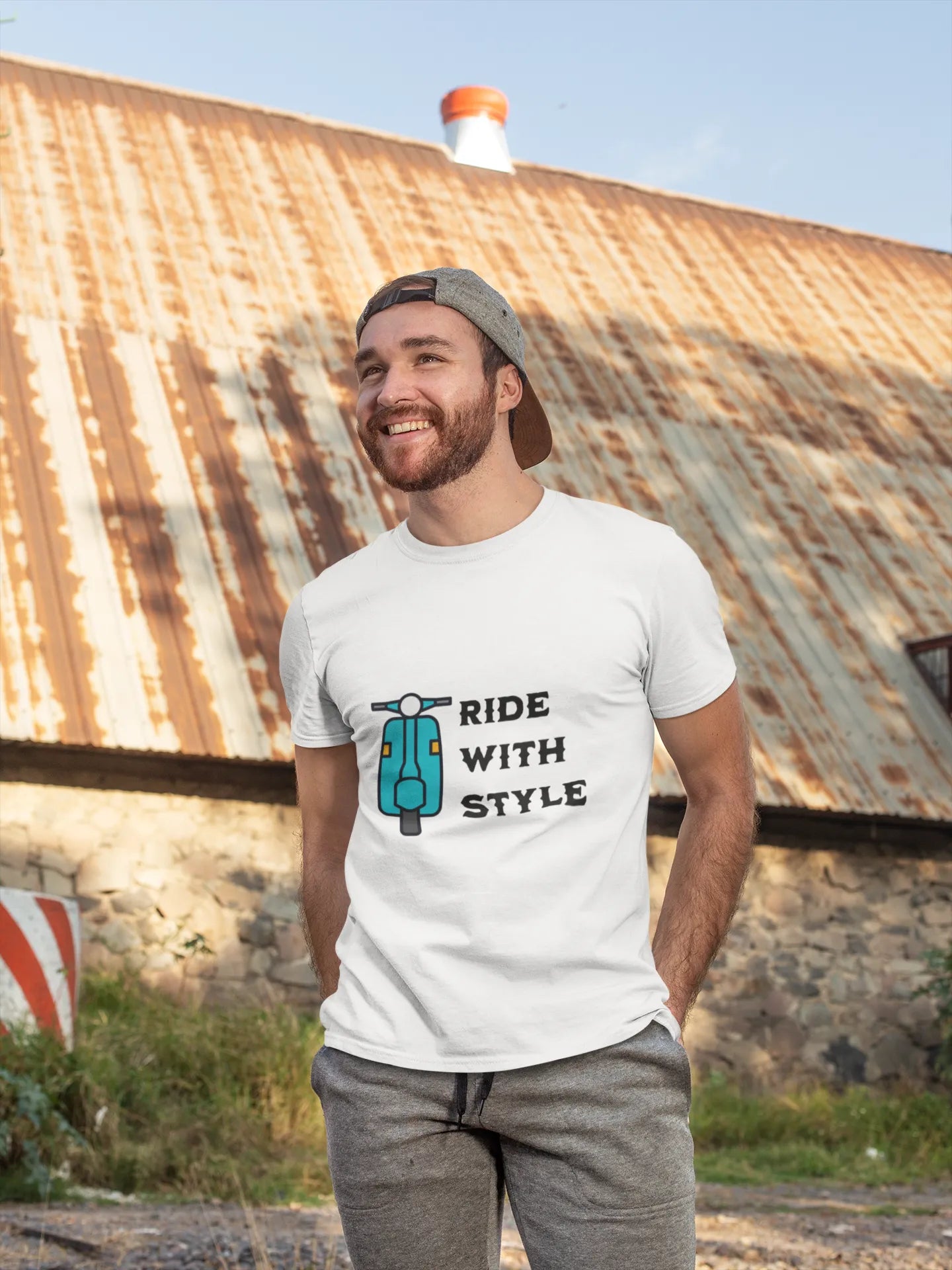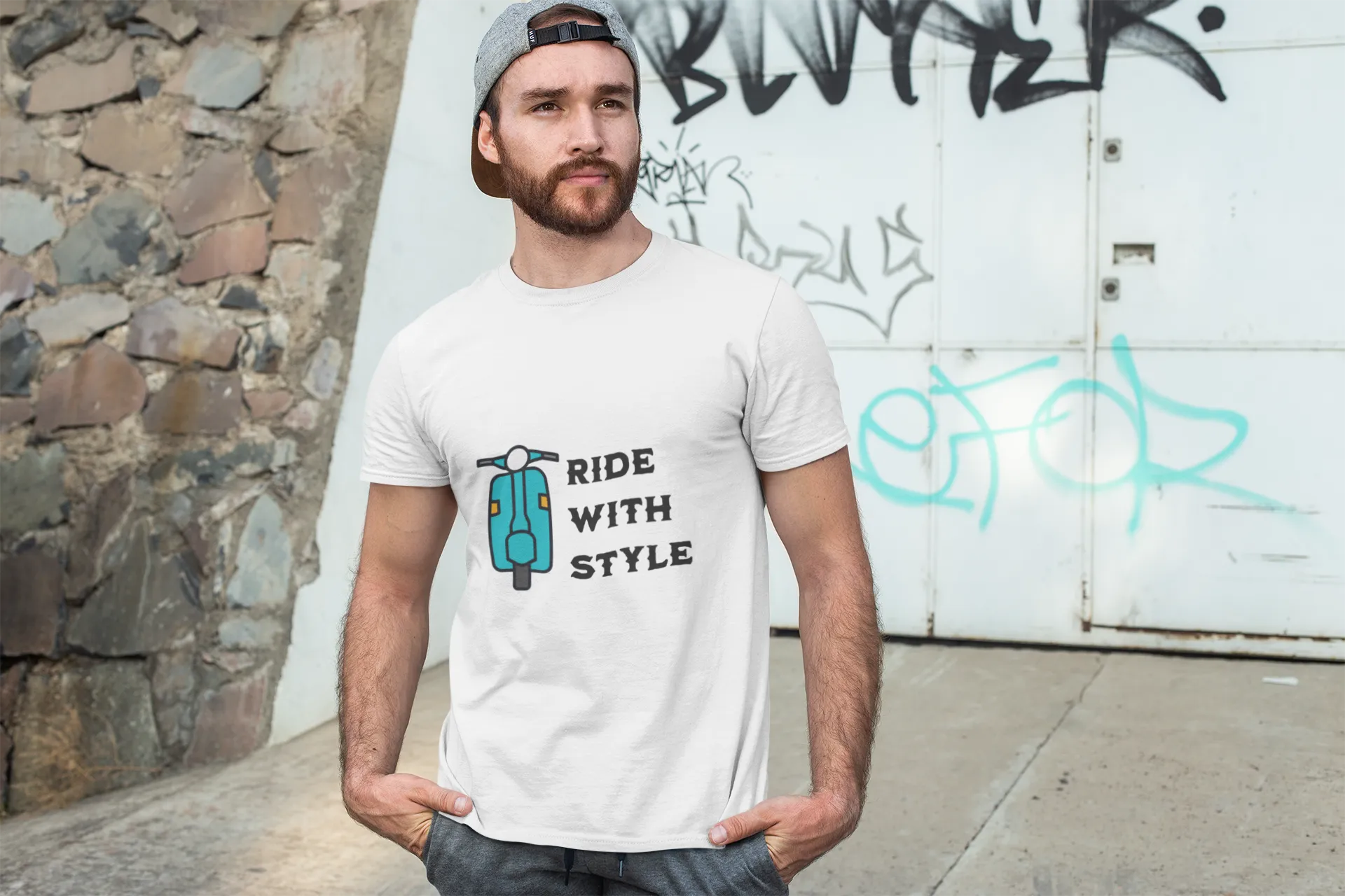 A sleek T-shirt design featuring "Ride with Style" in bold, dynamic typography. A stylish motorcycle or vintage bicycle silhouette complements the text, with a retro or modern aesthetic. Accents like speed lines, flames, or minimalist geometric patterns enhance the energetic vibe.