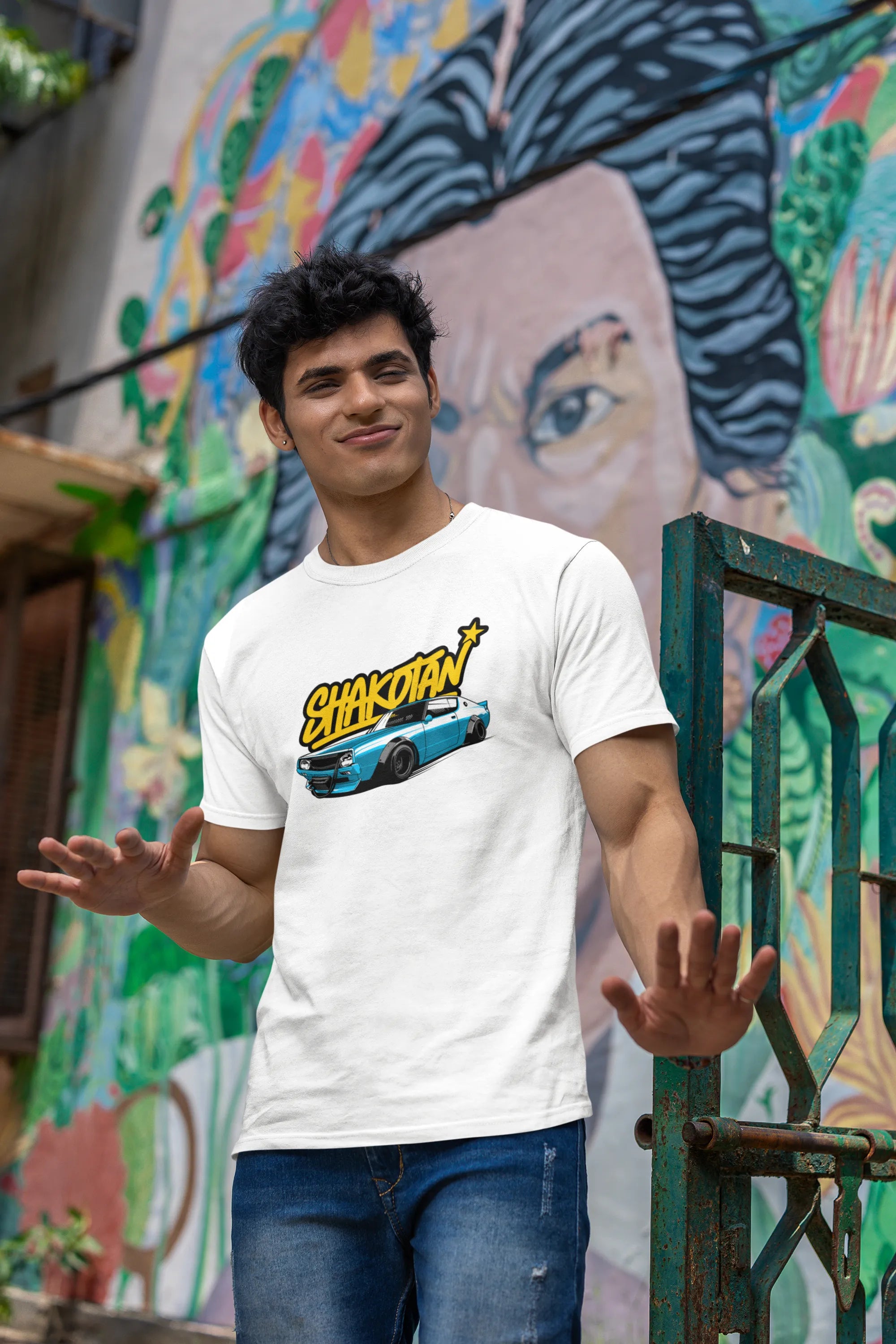 White t-shirt with a graphic design of a car and 'Shakotan' text on a black background