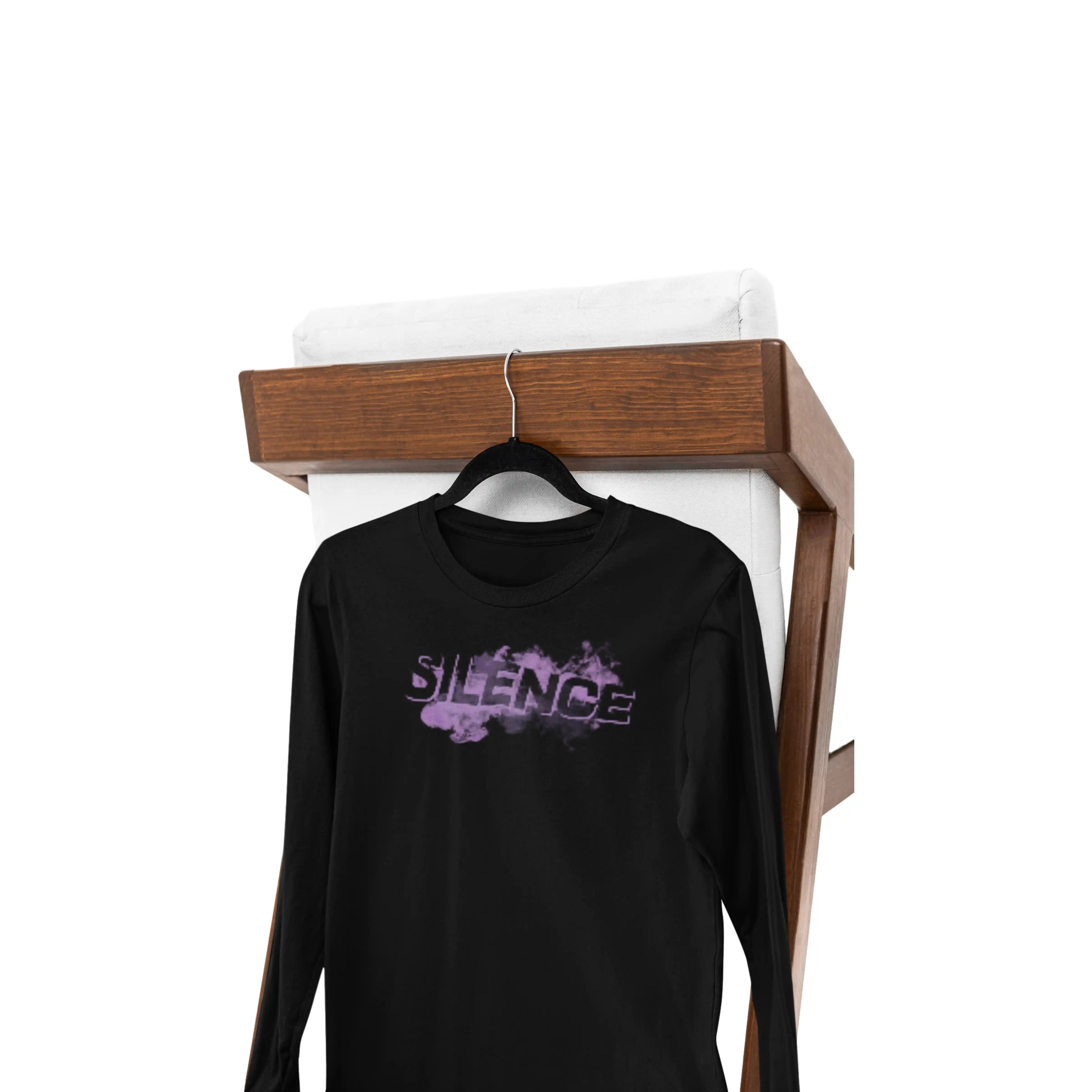 Let silence speak louder with this bold black full-sleeve T-shirt featuring a unique “Silence” artwork. Its round neck and regular fit bring comfort, while the meaningful design adds depth and attitude to your look.