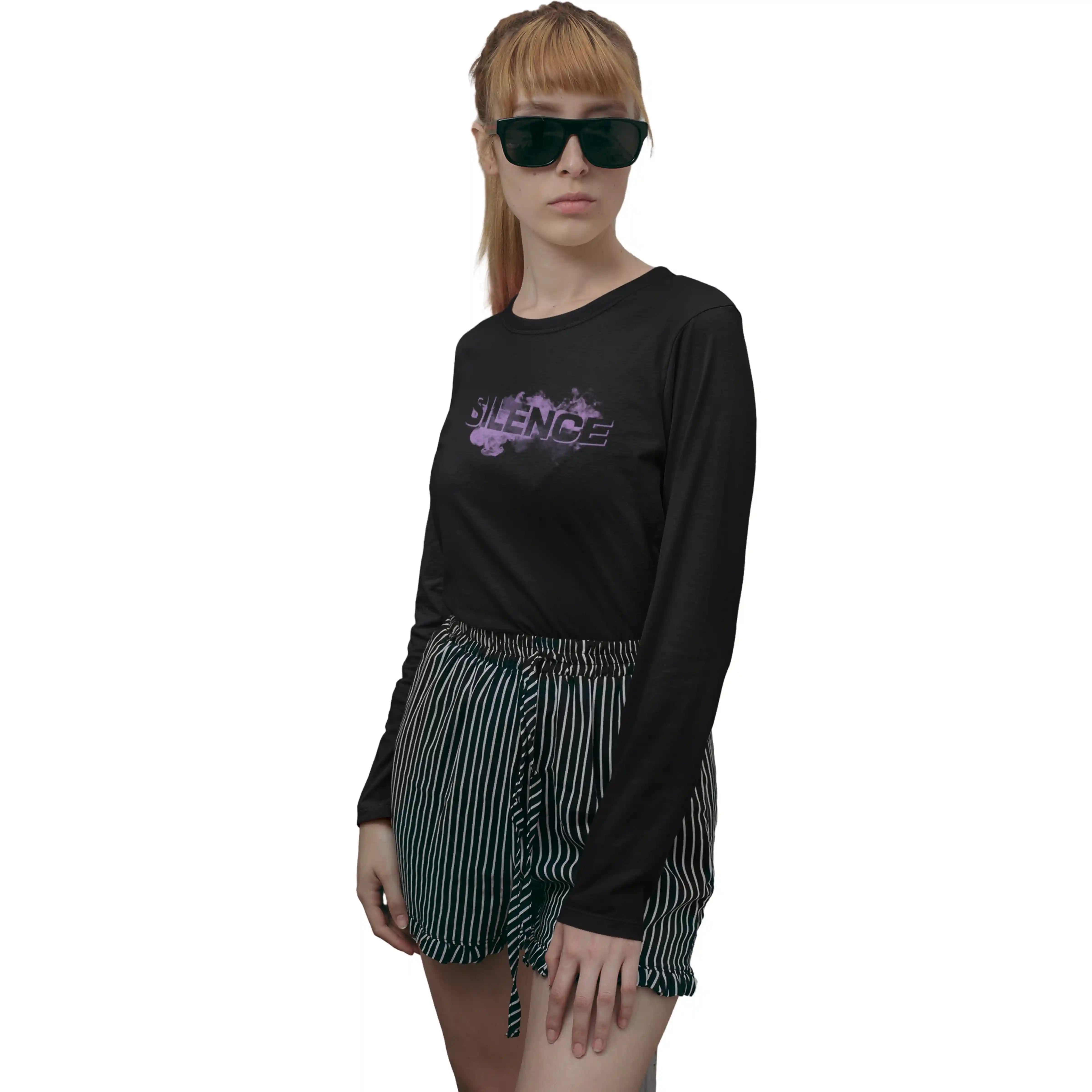 Person wearing a black long-sleeve shirt with 'SILENCE' design on a white background