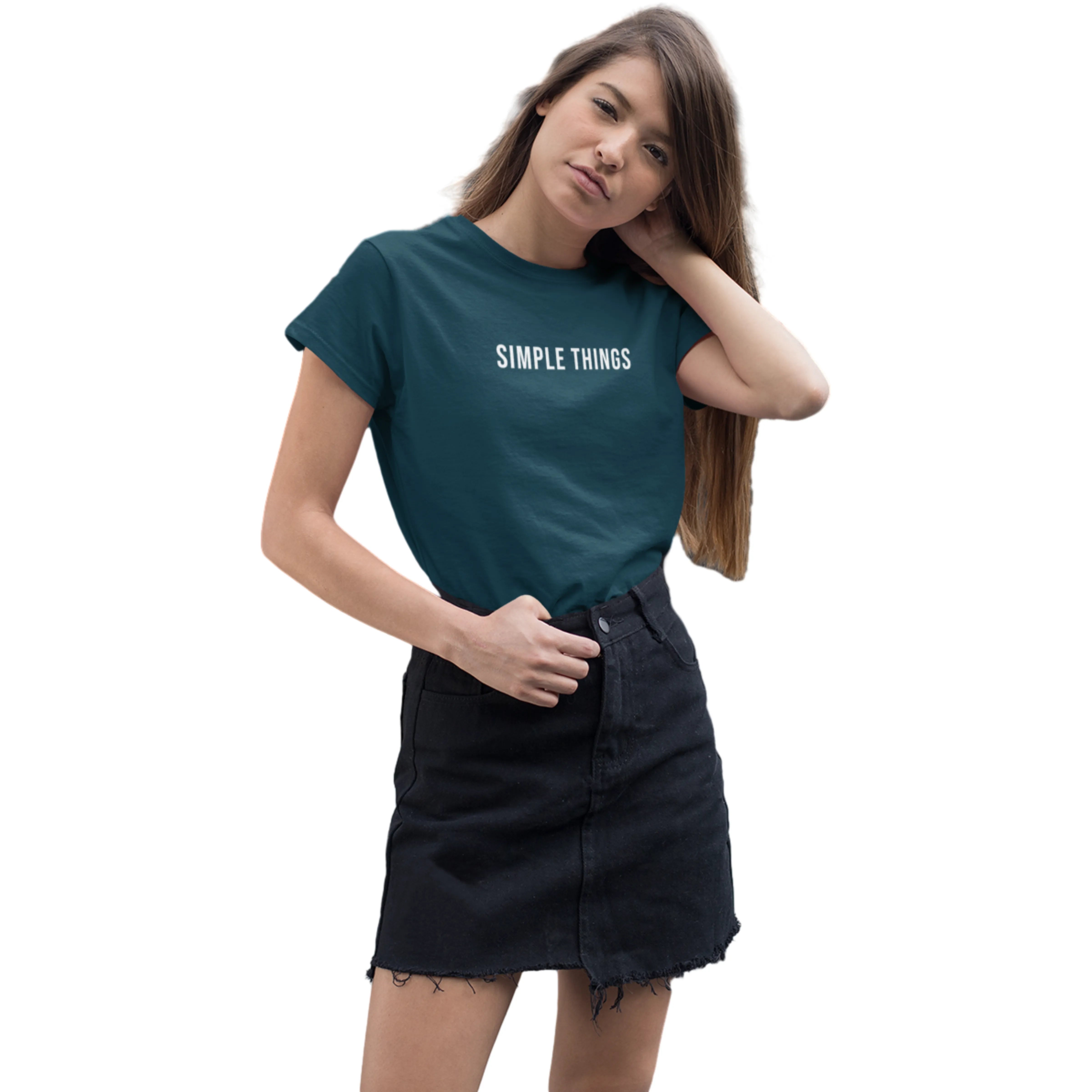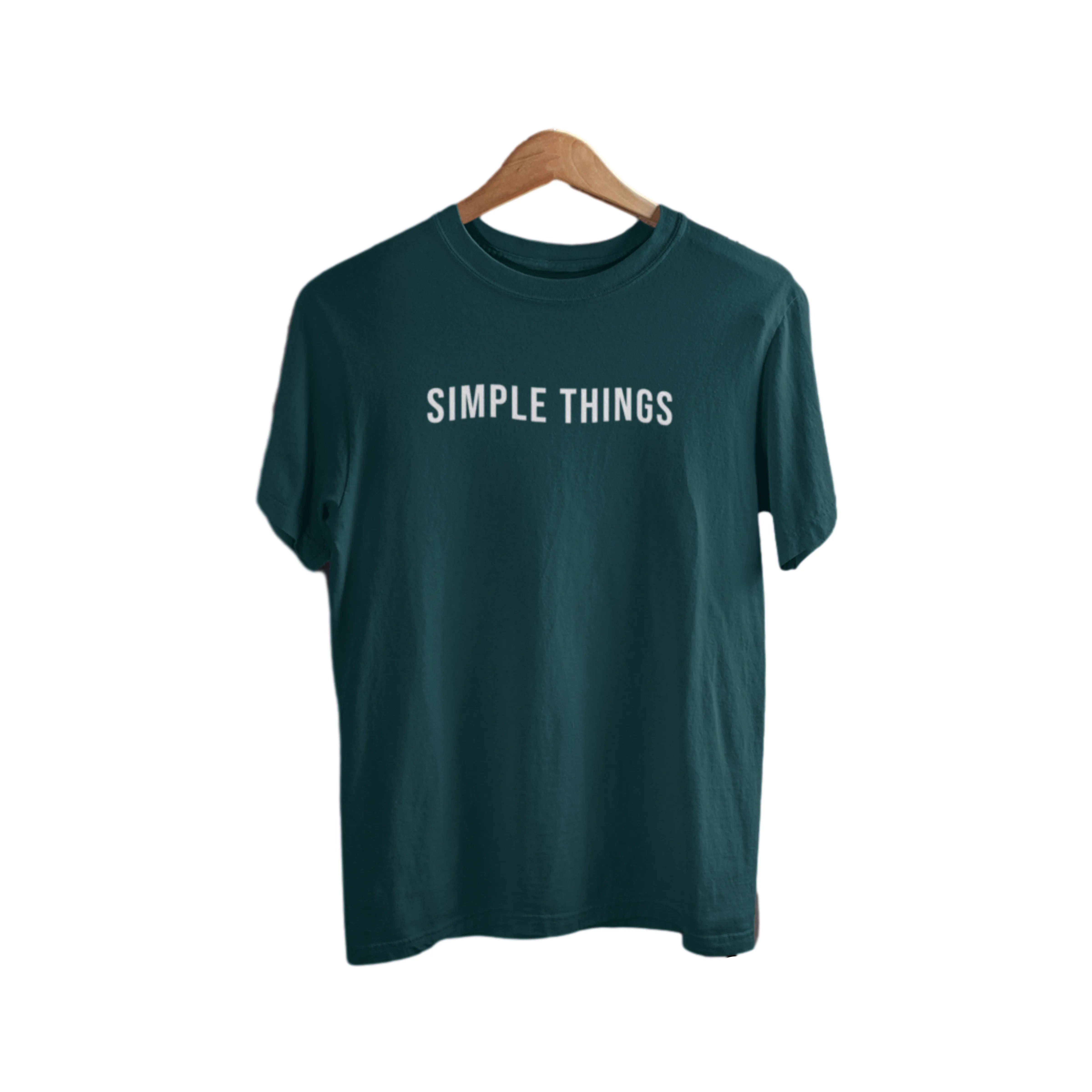 Person wearing a teal t-shirt with 'SIMPLE THINGS' text on a white background